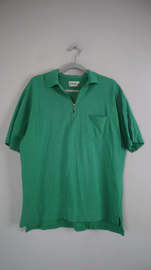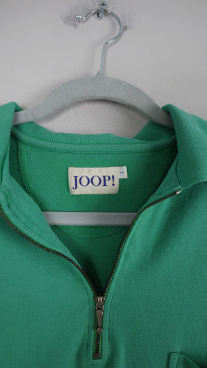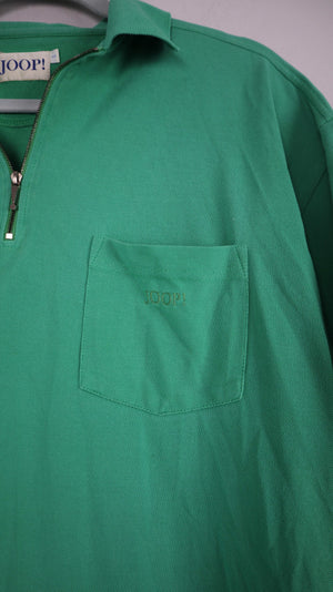 True Vintage Poloshirt in Grün von JOOP!. Kleine Gebrauchsspuren, als Detail ein Ausrufezeichen als Zipper. 56 cm Achselweite und 68 cm Länge. Plus Versand