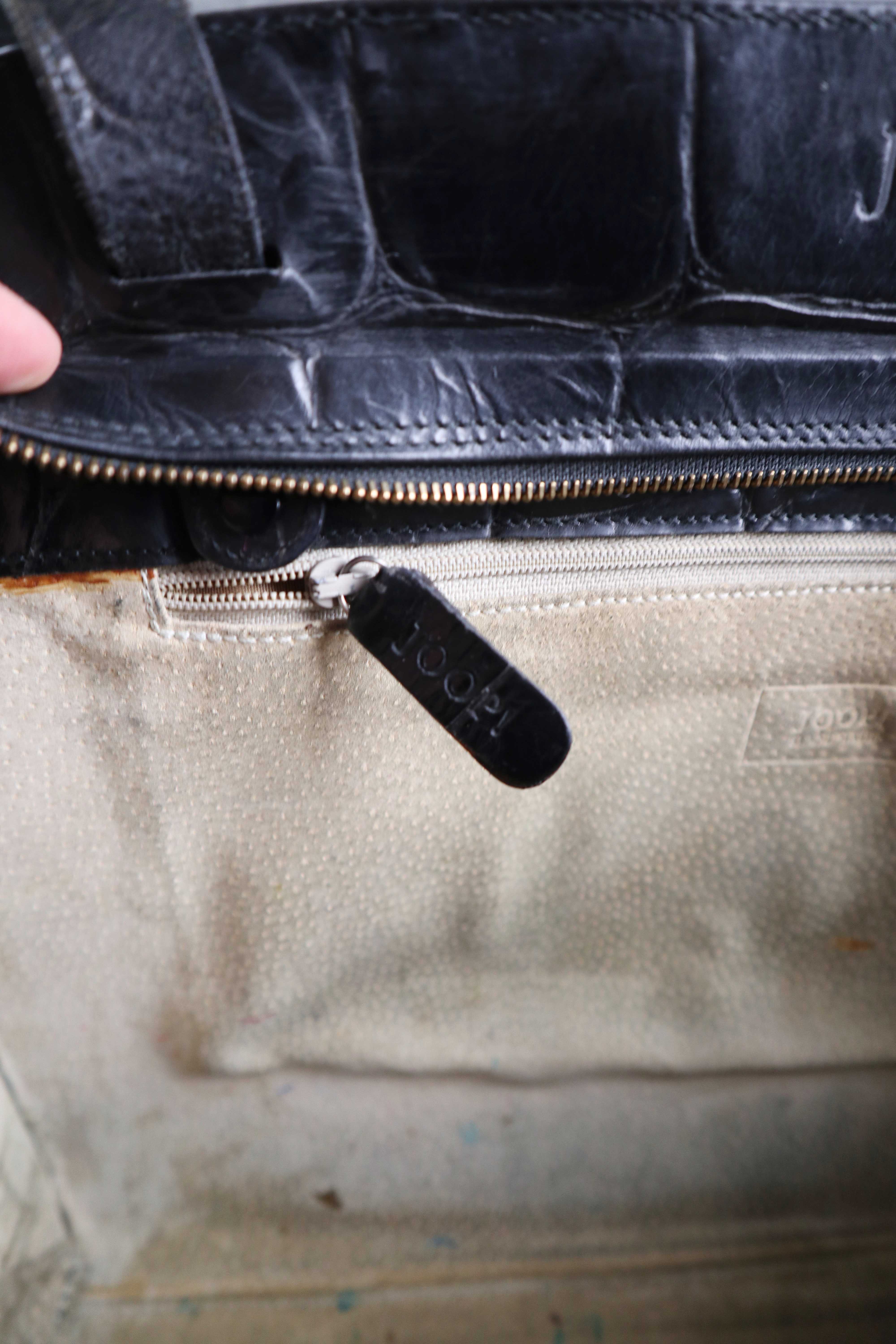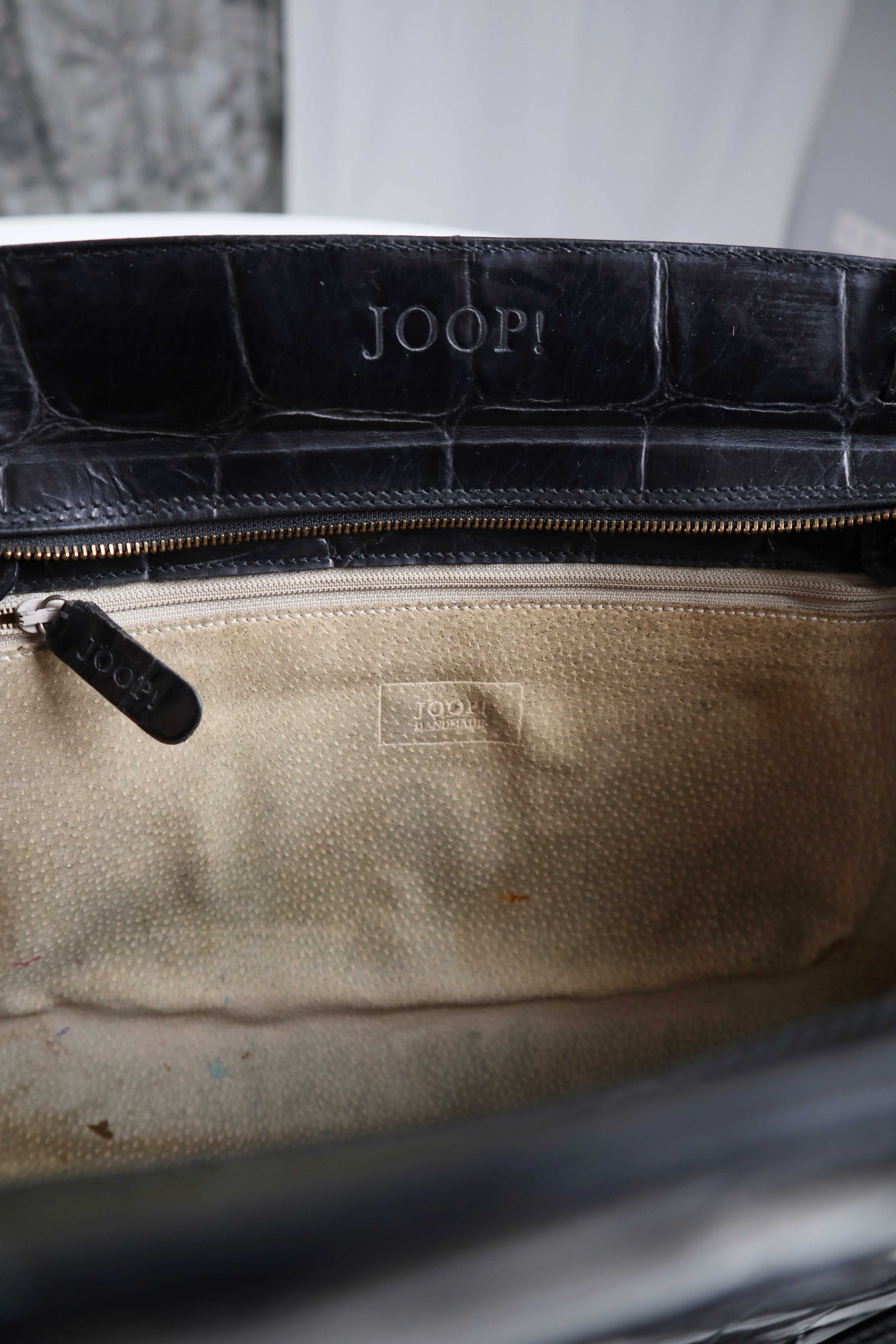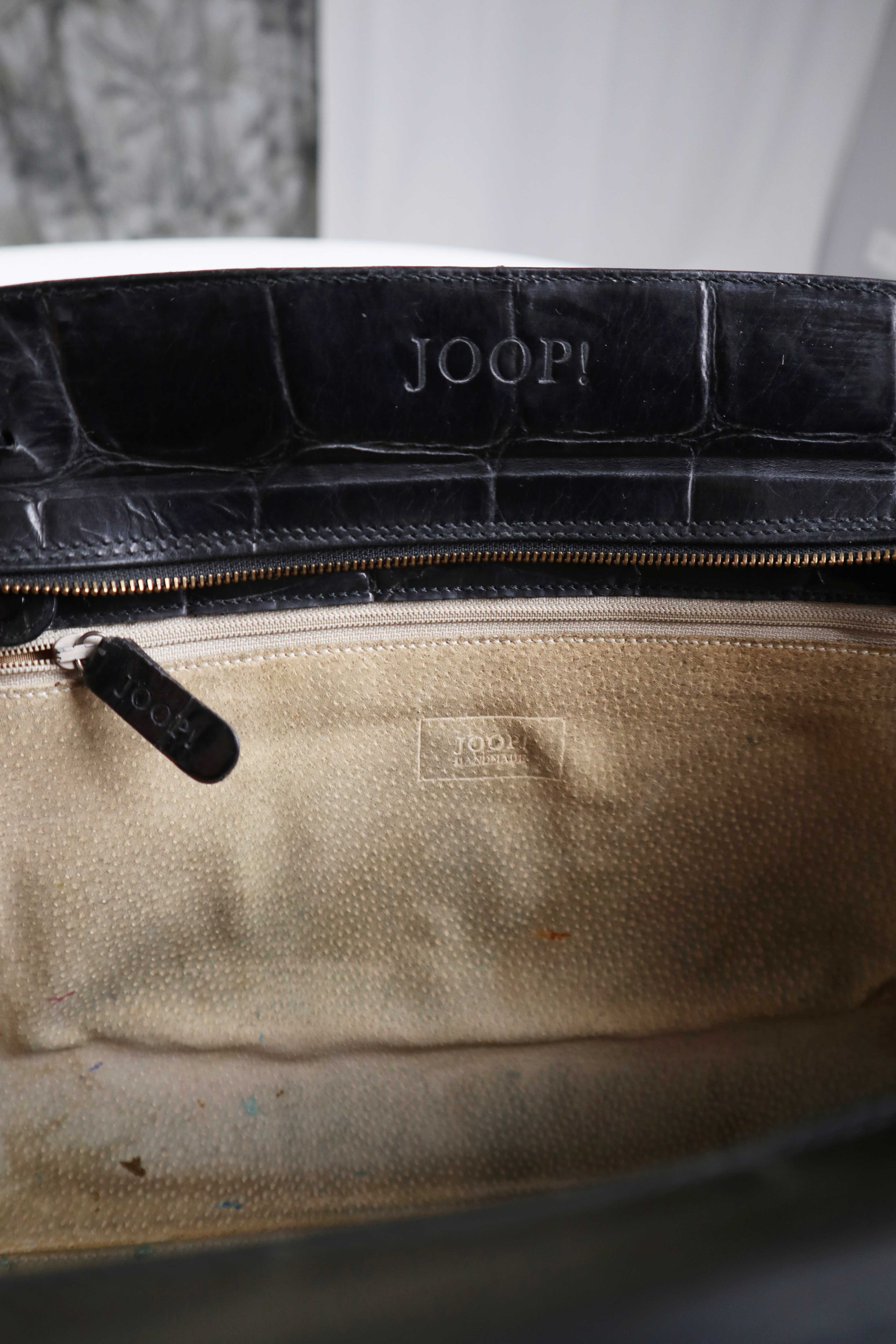 Schwarze Ledertasche, true Vintage, von Joop. Die Henkel sind in Überlänge und Größenverstellbar, innen sind kleine Druckknöpfe. Sie ist sehr geräumig, hat oben einen Reißverschluss und sehr gut erhalten. Innen beiges Leder mit Benutzungsspuren. 36 cm Breite. Plus Versand