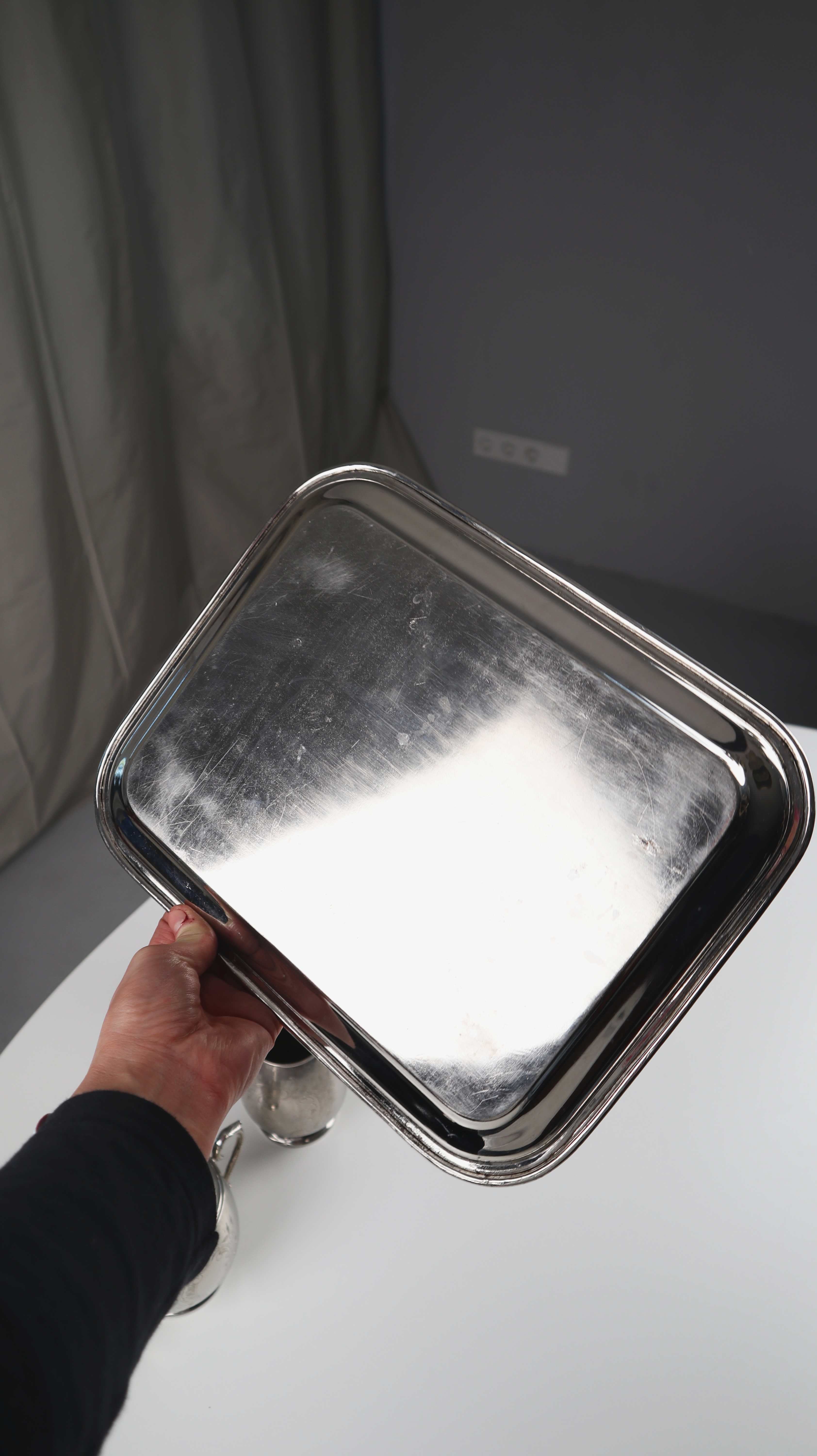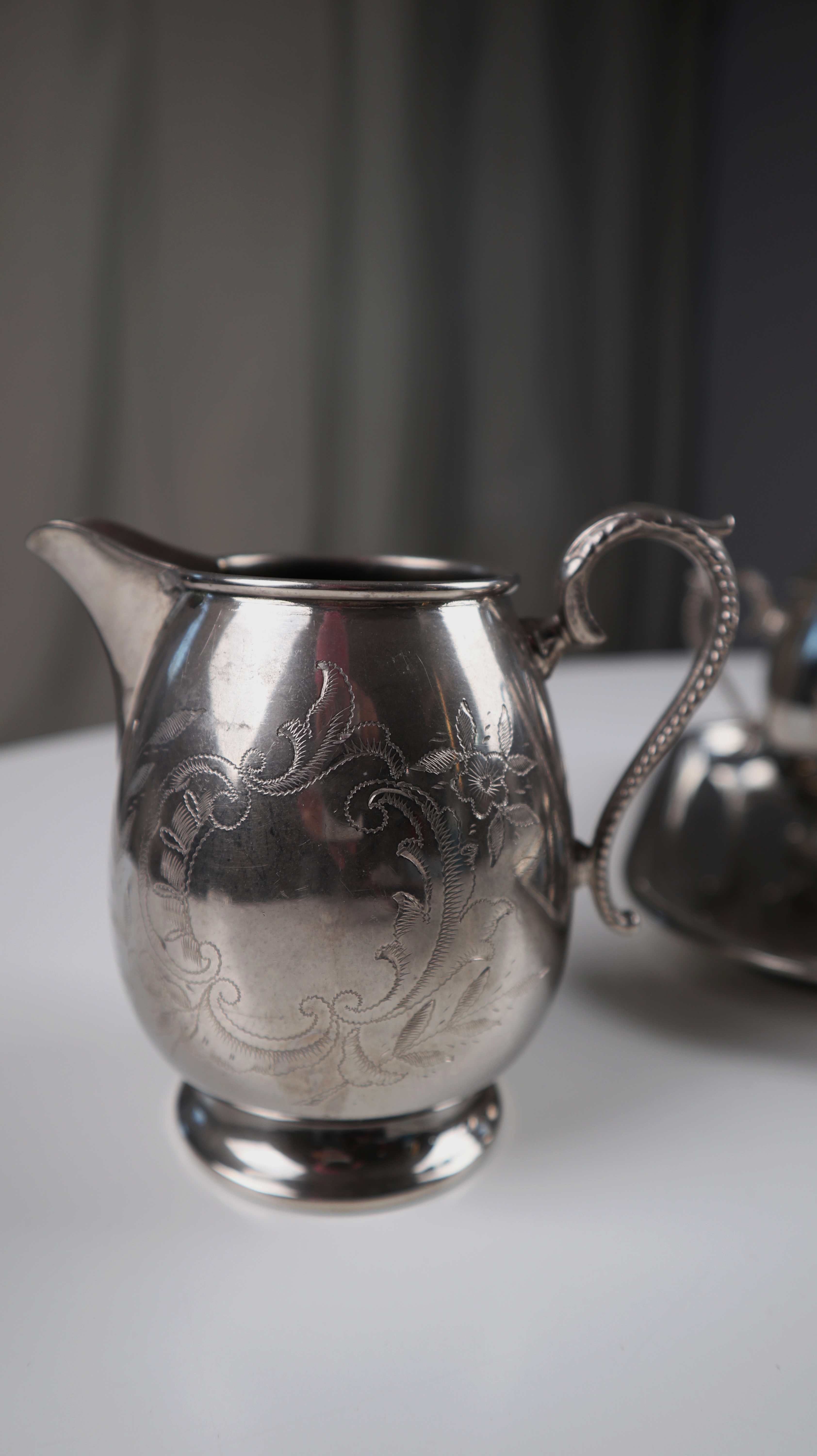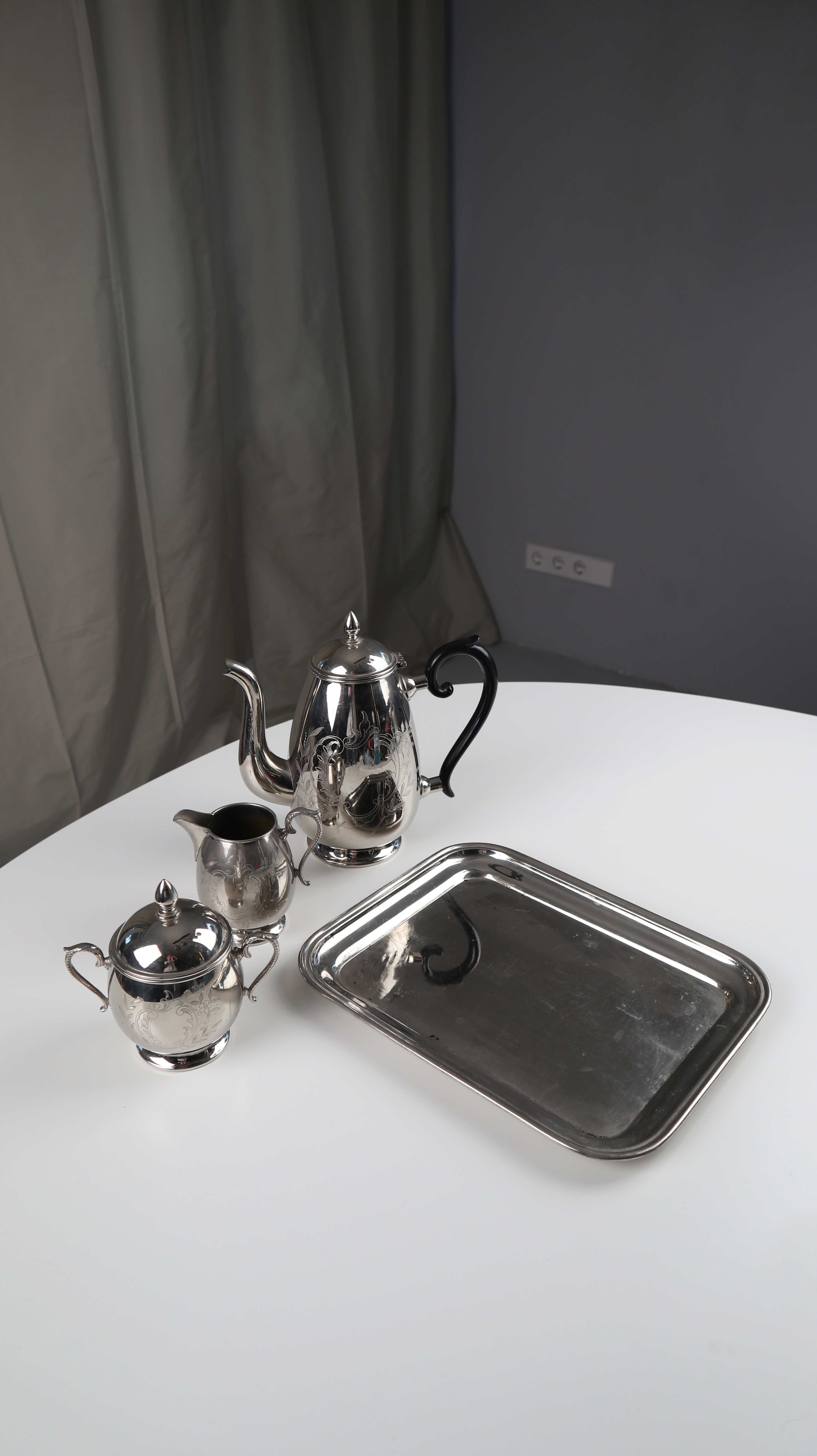 Versilbertes Set aus einer Milchkanne, Zuckerdose und einer Teekanne mit Tablett. Leichte Beschädigungen und Gebrauchsspuren vorhanden. Vermutlich versilbert. Plus Versand