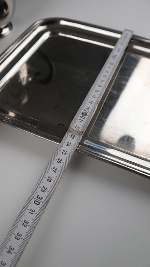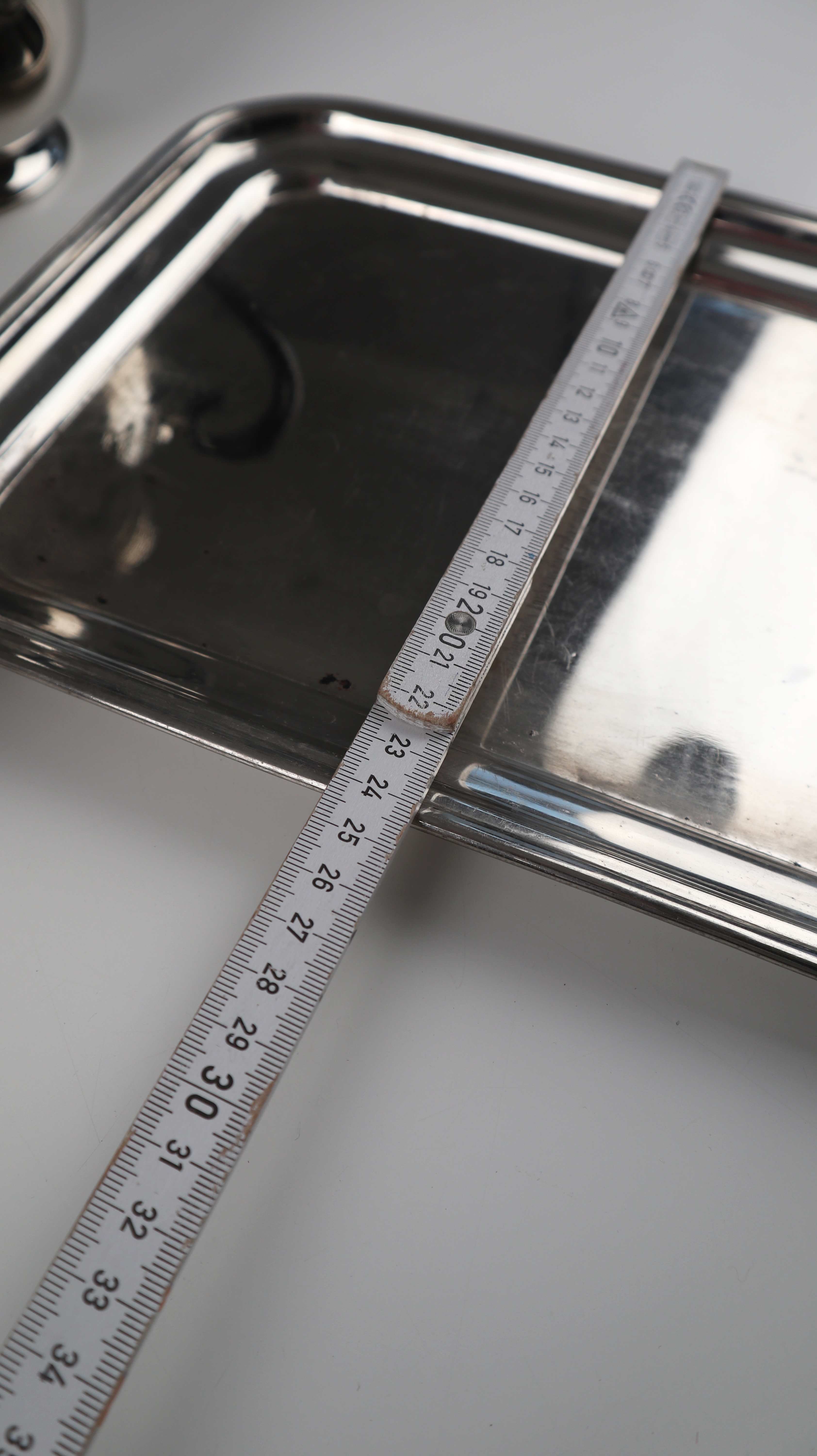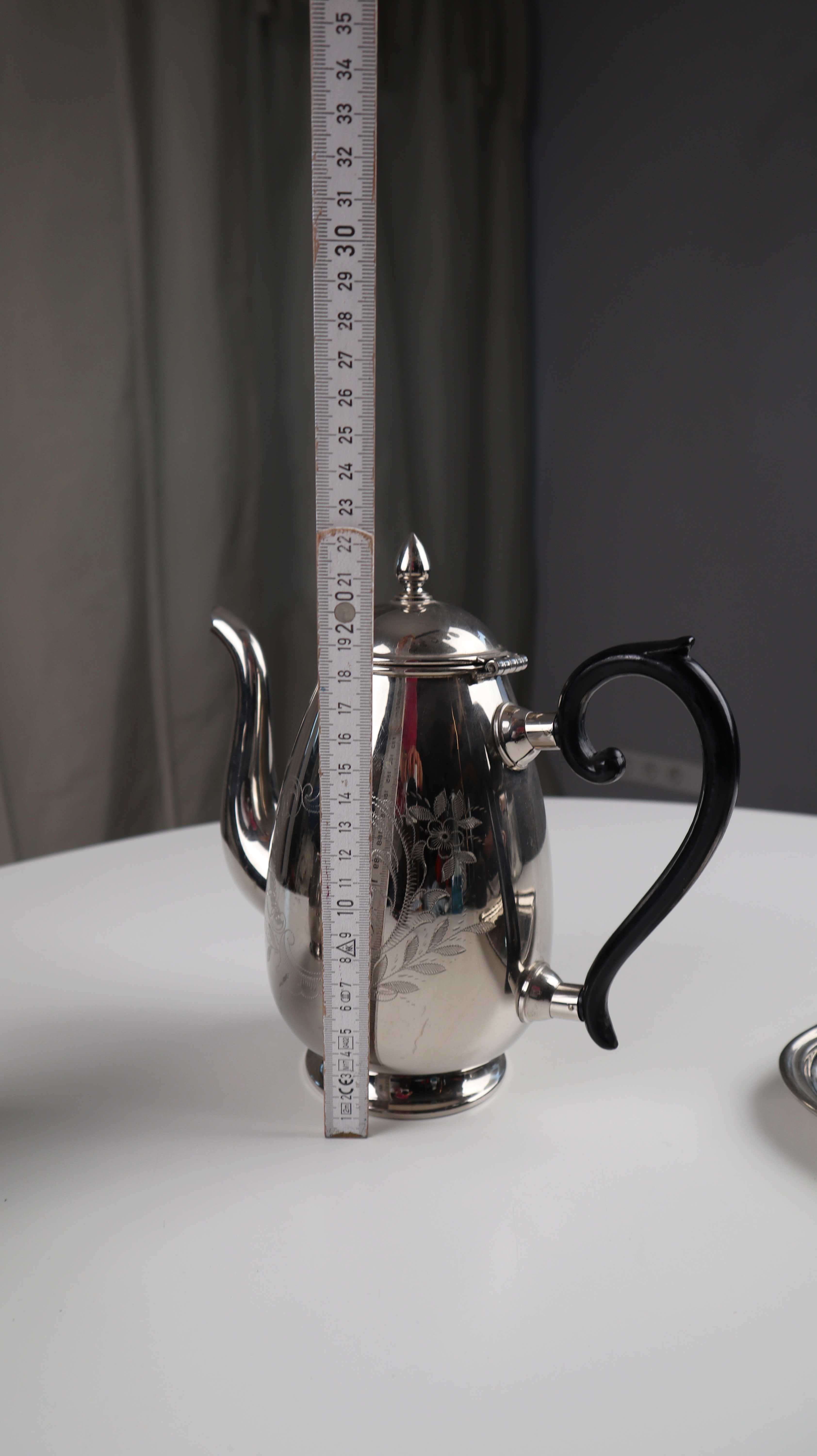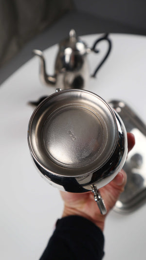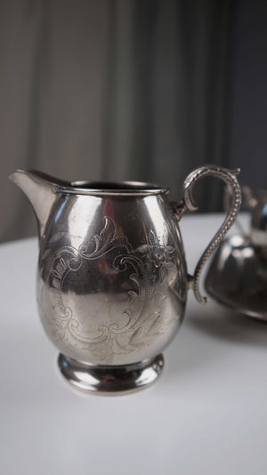 Versilbertes Set aus einer Milchkanne, Zuckerdose und einer Teekanne mit Tablett. Leichte Beschädigungen und Gebrauchsspuren vorhanden. Vermutlich versilbert. Plus Versand