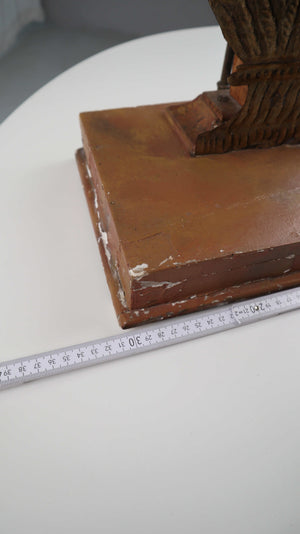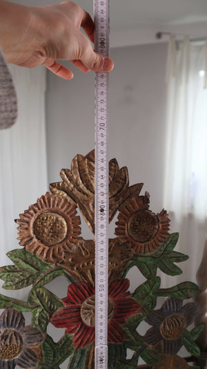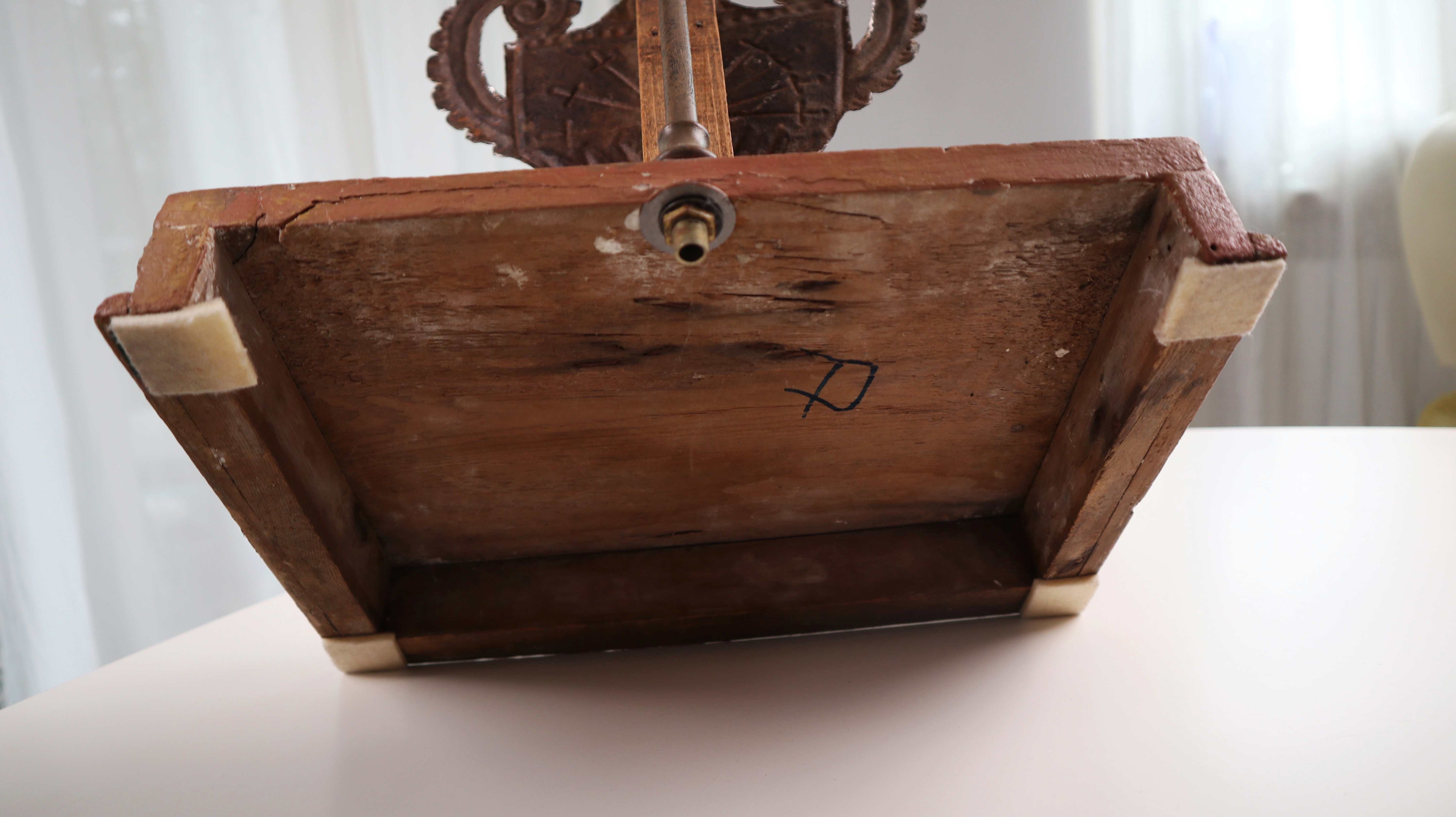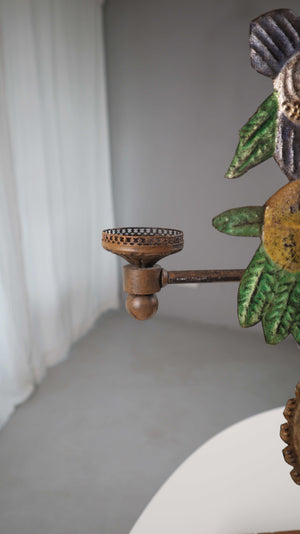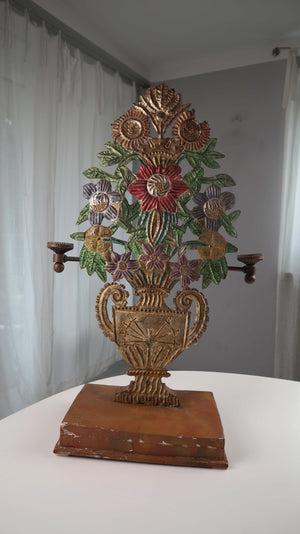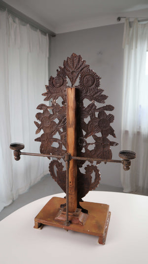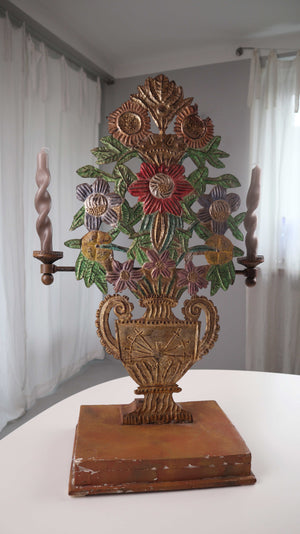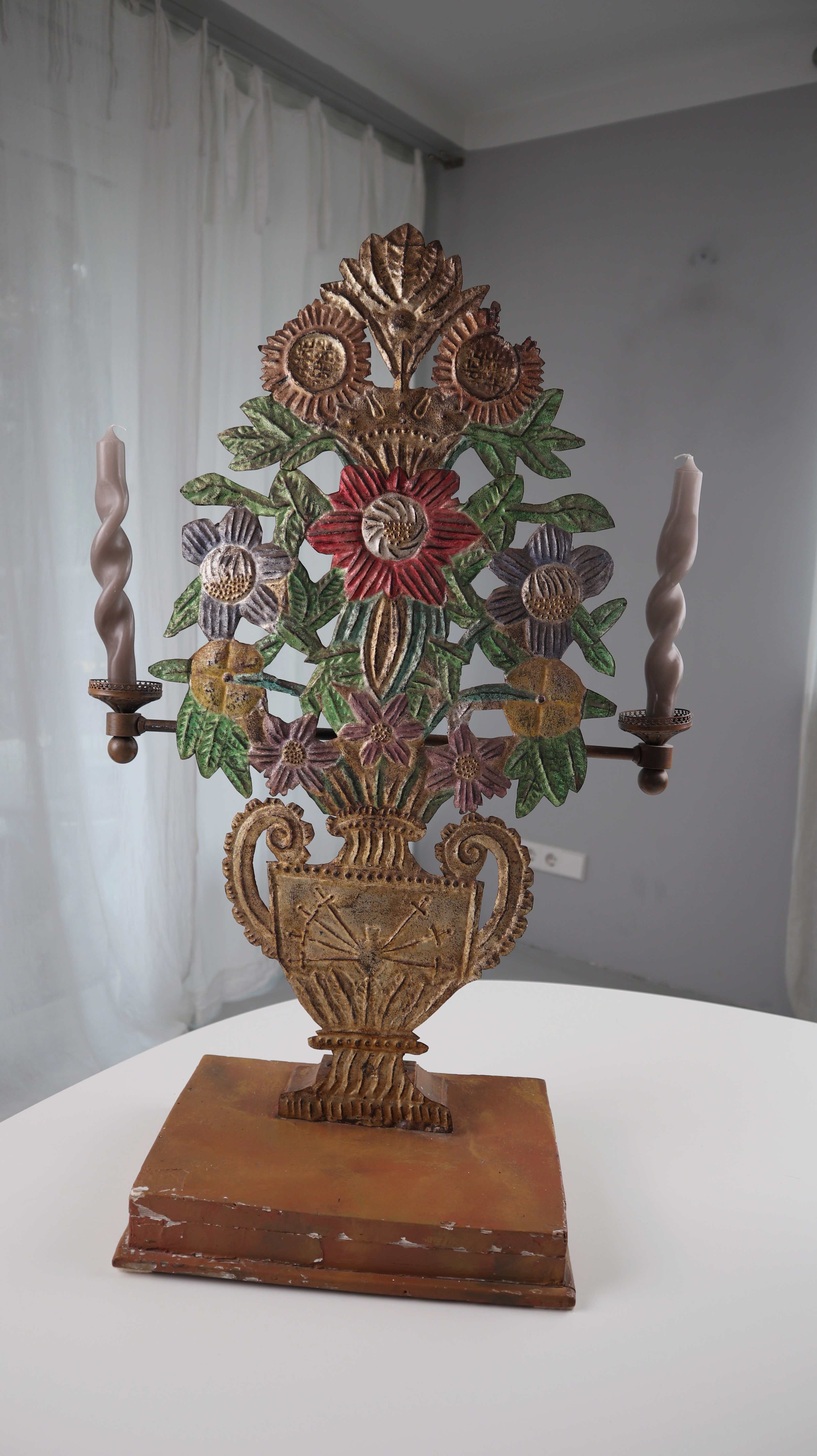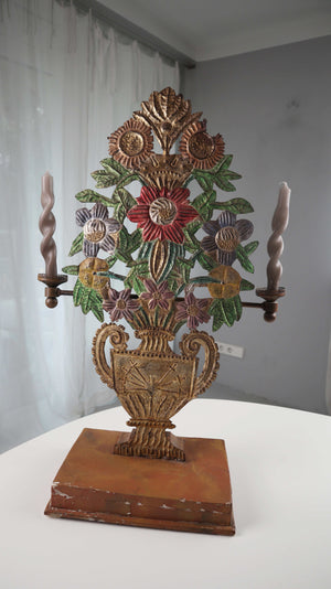 Kerzenhalter aus geschlagenen Metall. Befestigt auf einem Holzsockel, Abplatzungen an den Ecken vorhanden. Zweiarmig, coloriert. Guter Zustand. Plus Versand