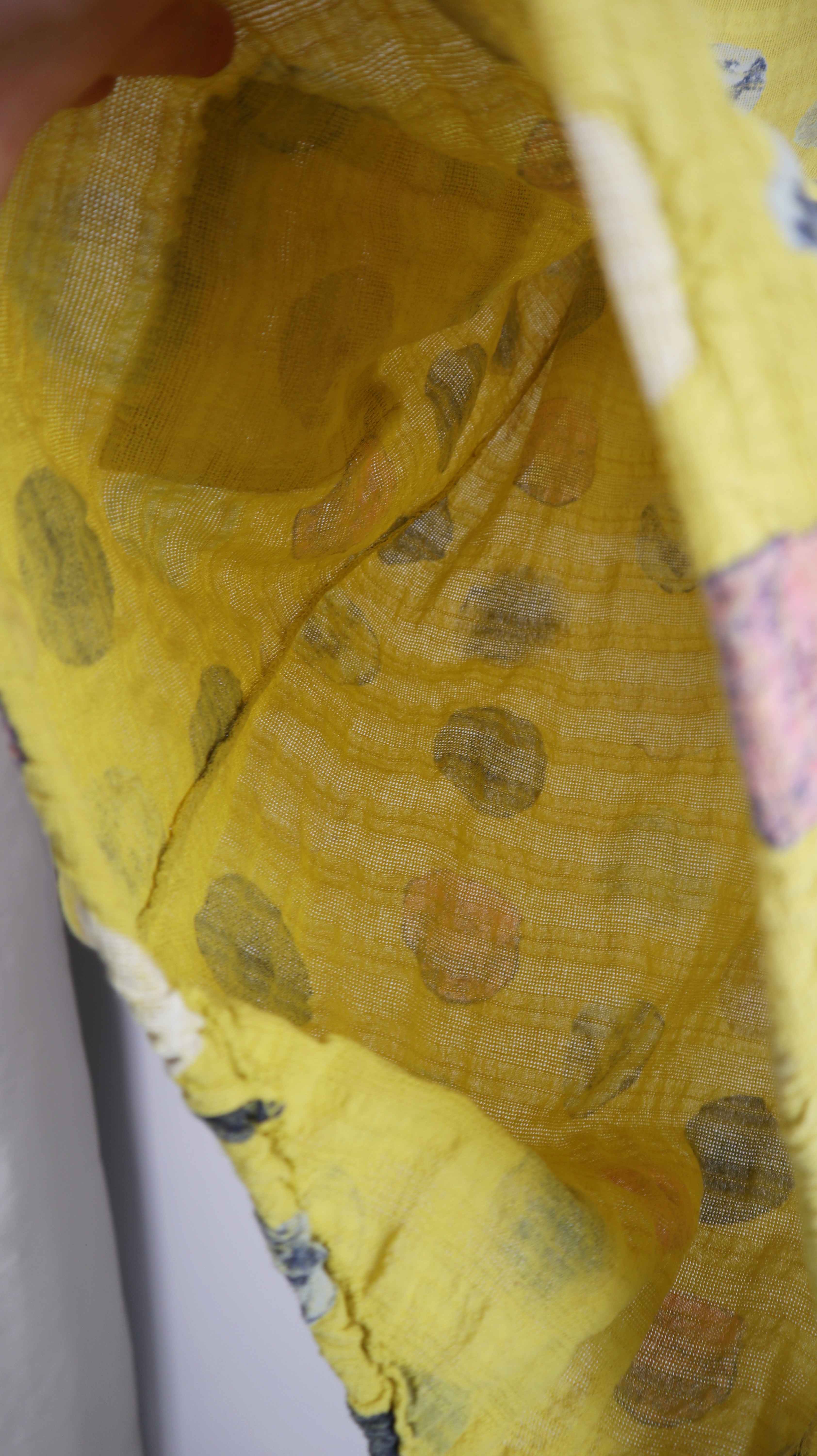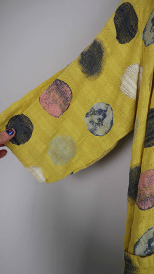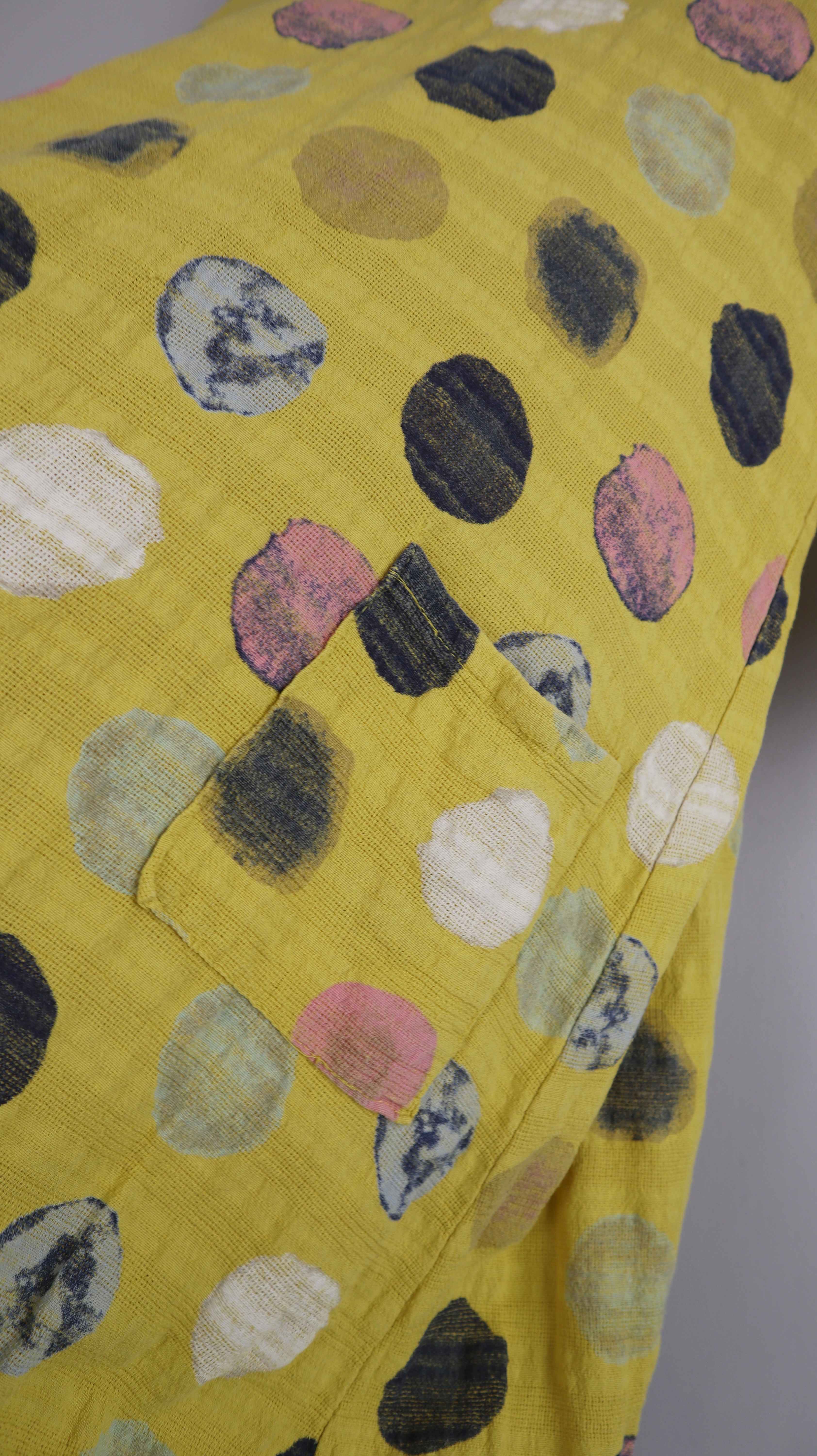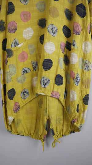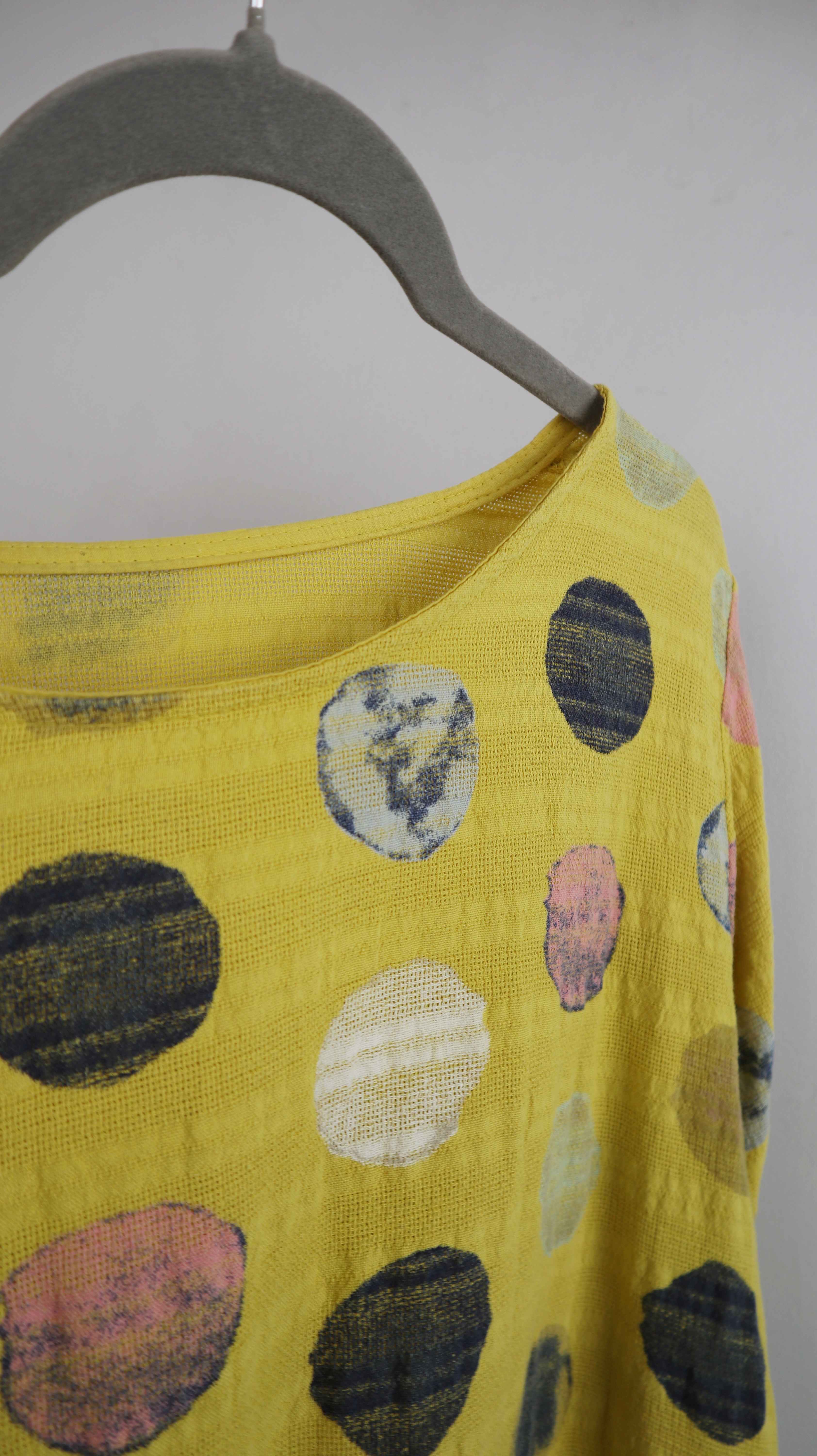 Midikleid bzw. längeres Shirt in gelb mit Punkten ohne Marke. 55 cm Achselweite und 62 cm Länge vorne, 85 cm Länge hinten. Plus Versand