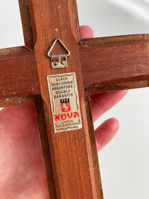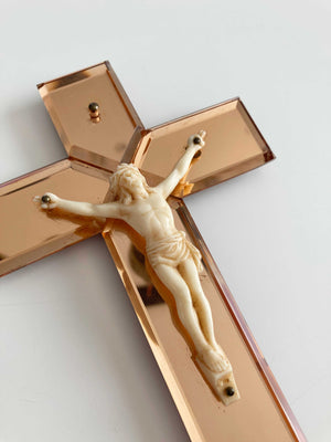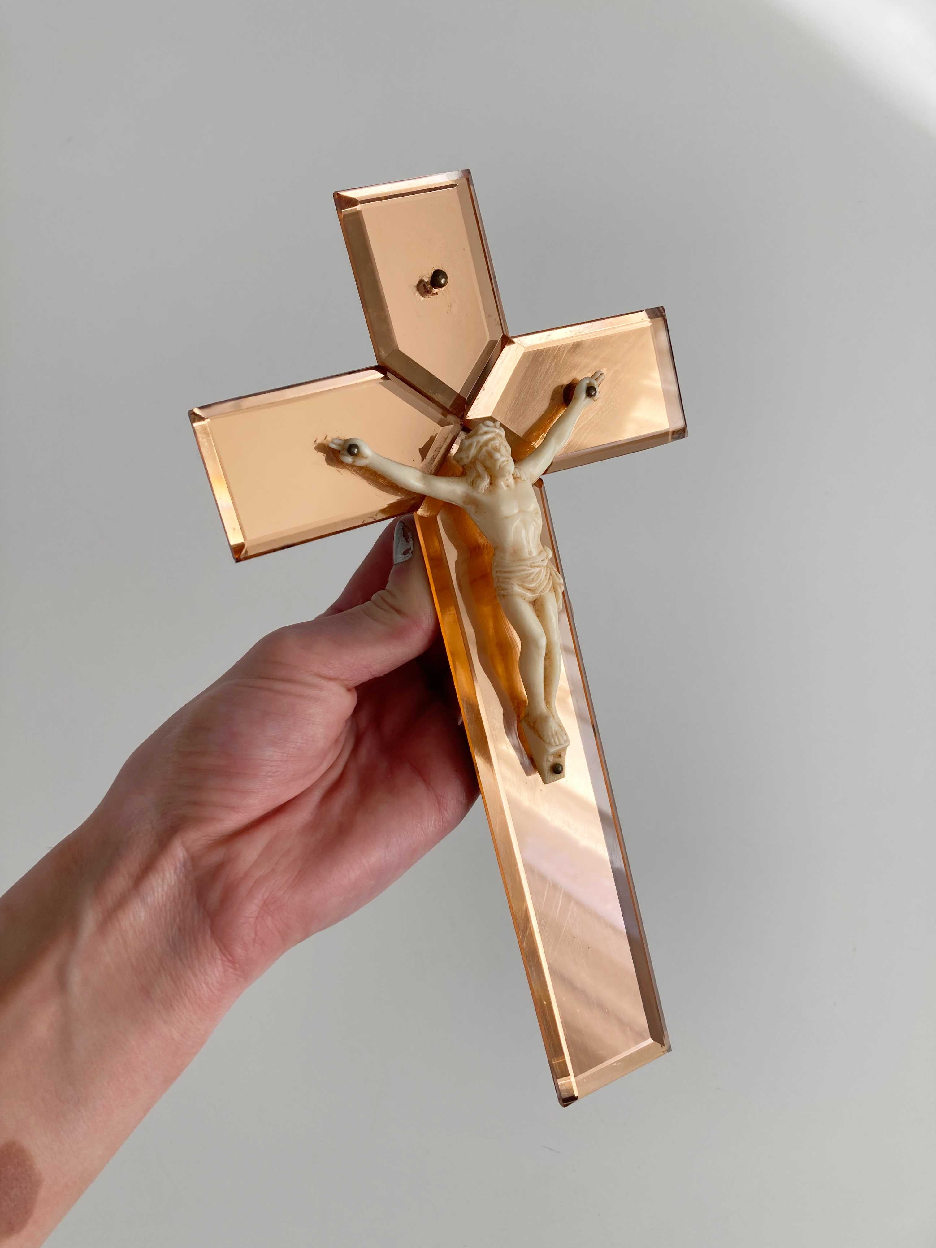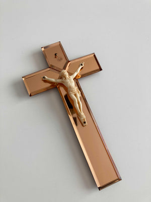 Verspiegeltes Kruzifix in Orange mit Jesus, vermutlich Horn. Es ist aus Frankreich, Rückseitig ist Lyon auf dem Sticker als Herkunftsort angegeben. Plus Versand