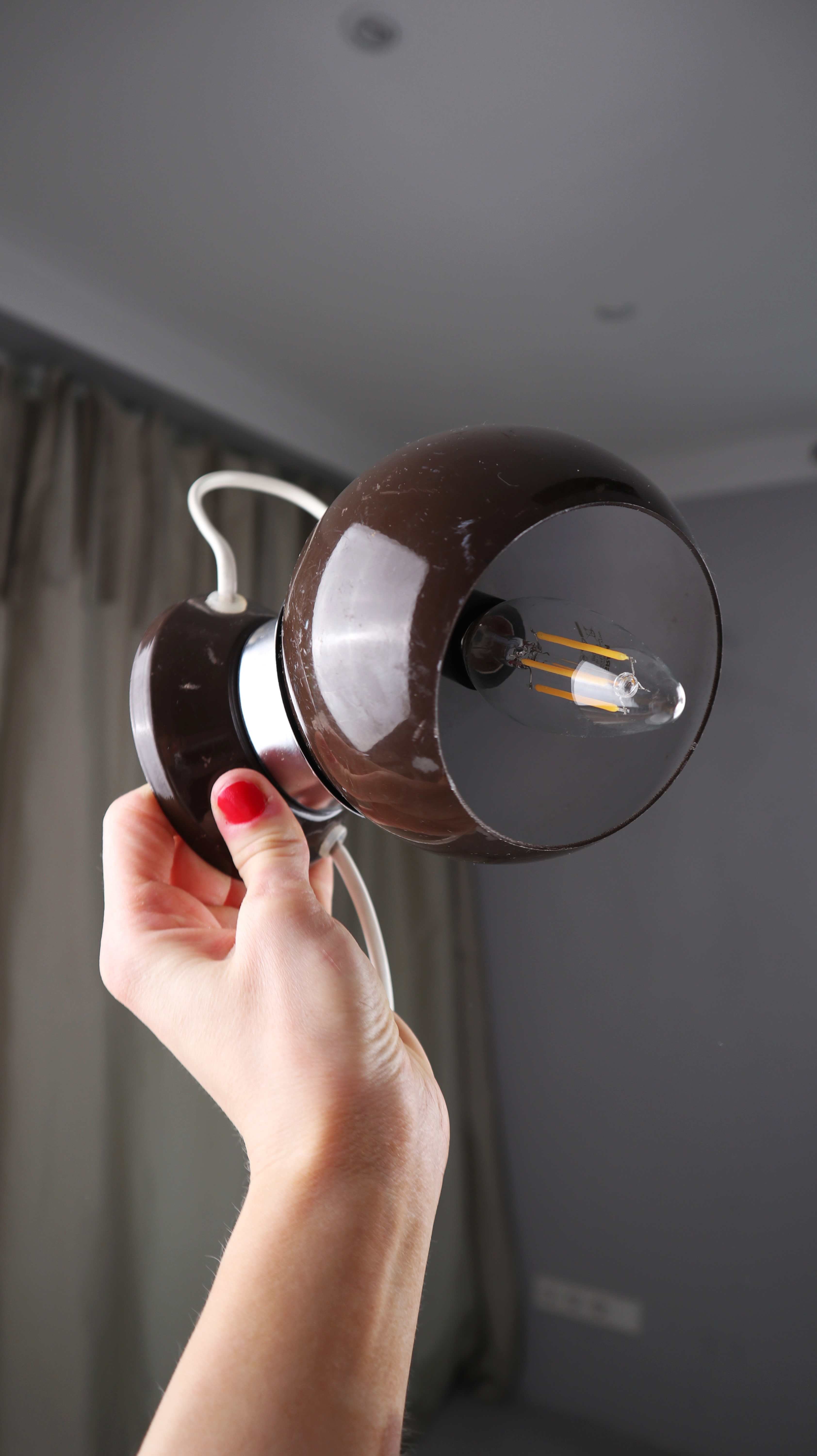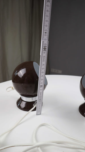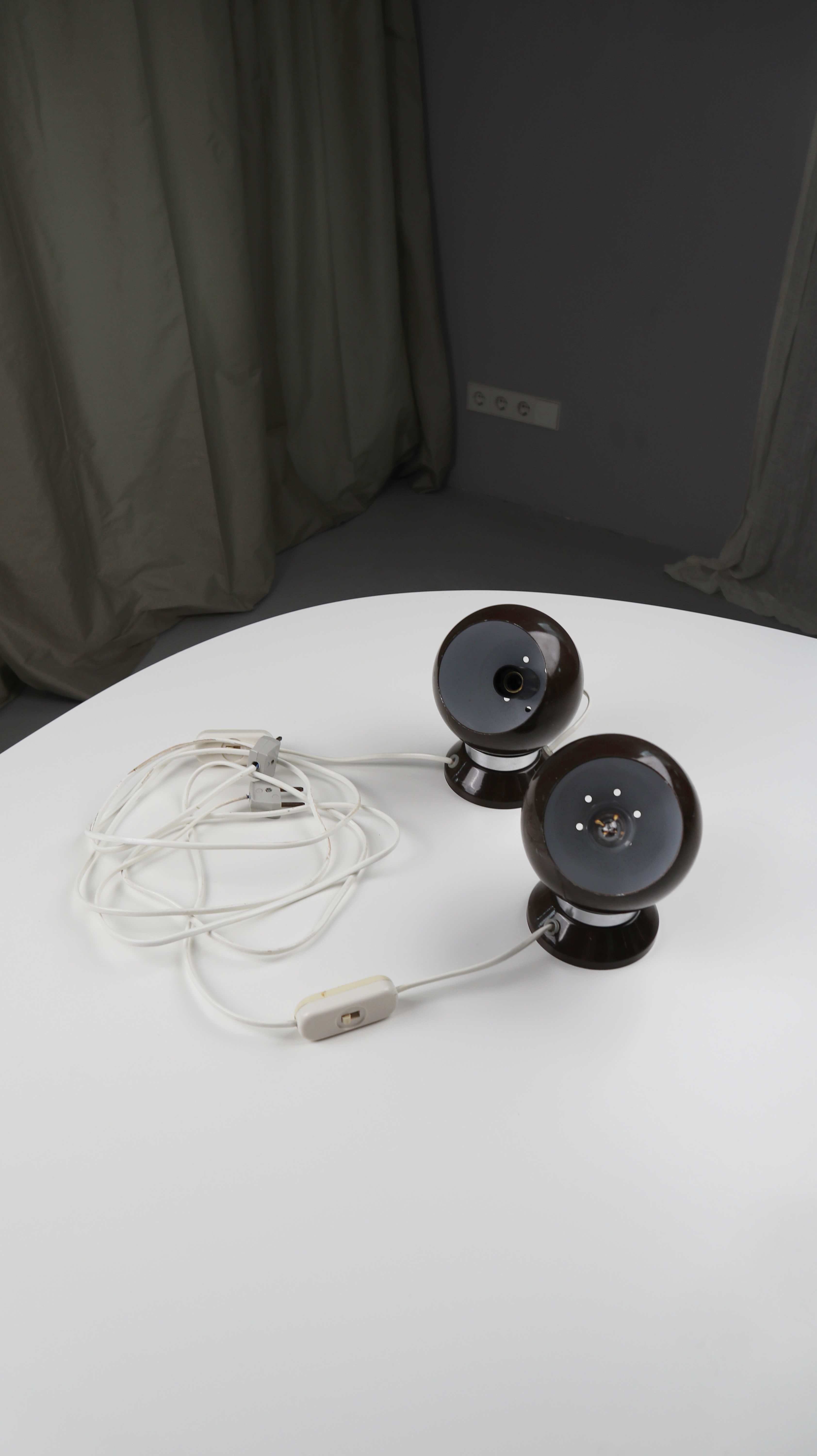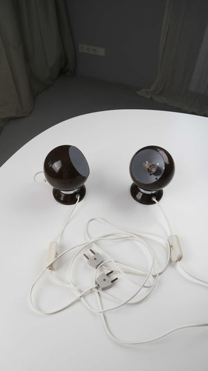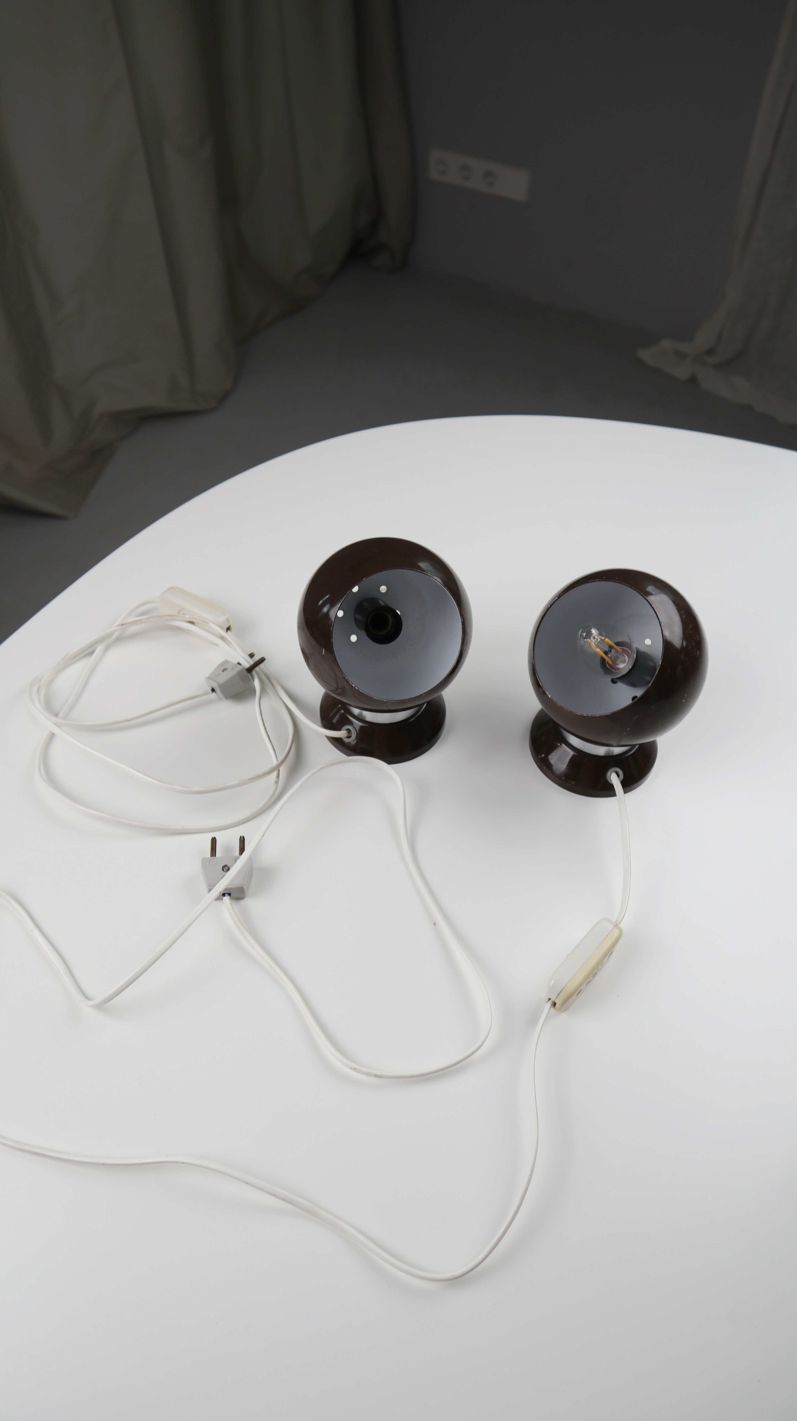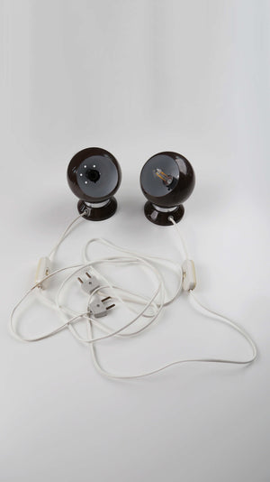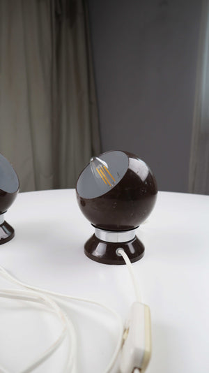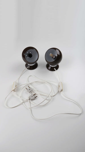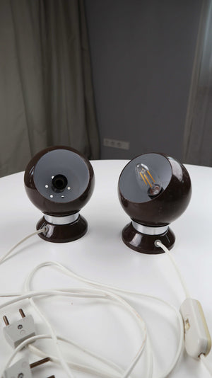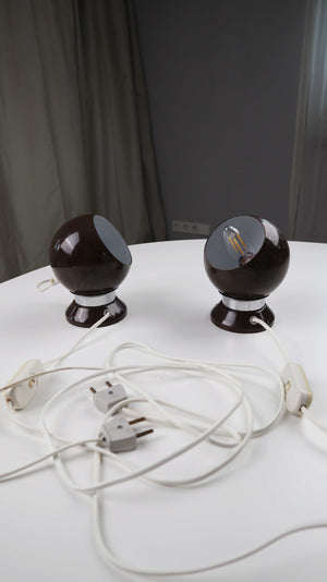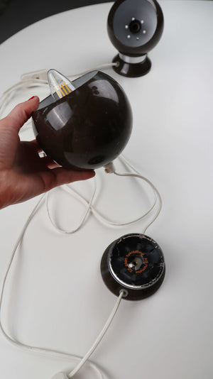 Zwei Braune Kugellampen für die Wand. Man kann durch eine Magnetbefestigung die Lampe in jegliche Richtung drehen. Sie haben beide Gebrauchsspuren und sind aus den 70ern. Ebenfalls funktionieren beide und sind getestet. Plus Versand