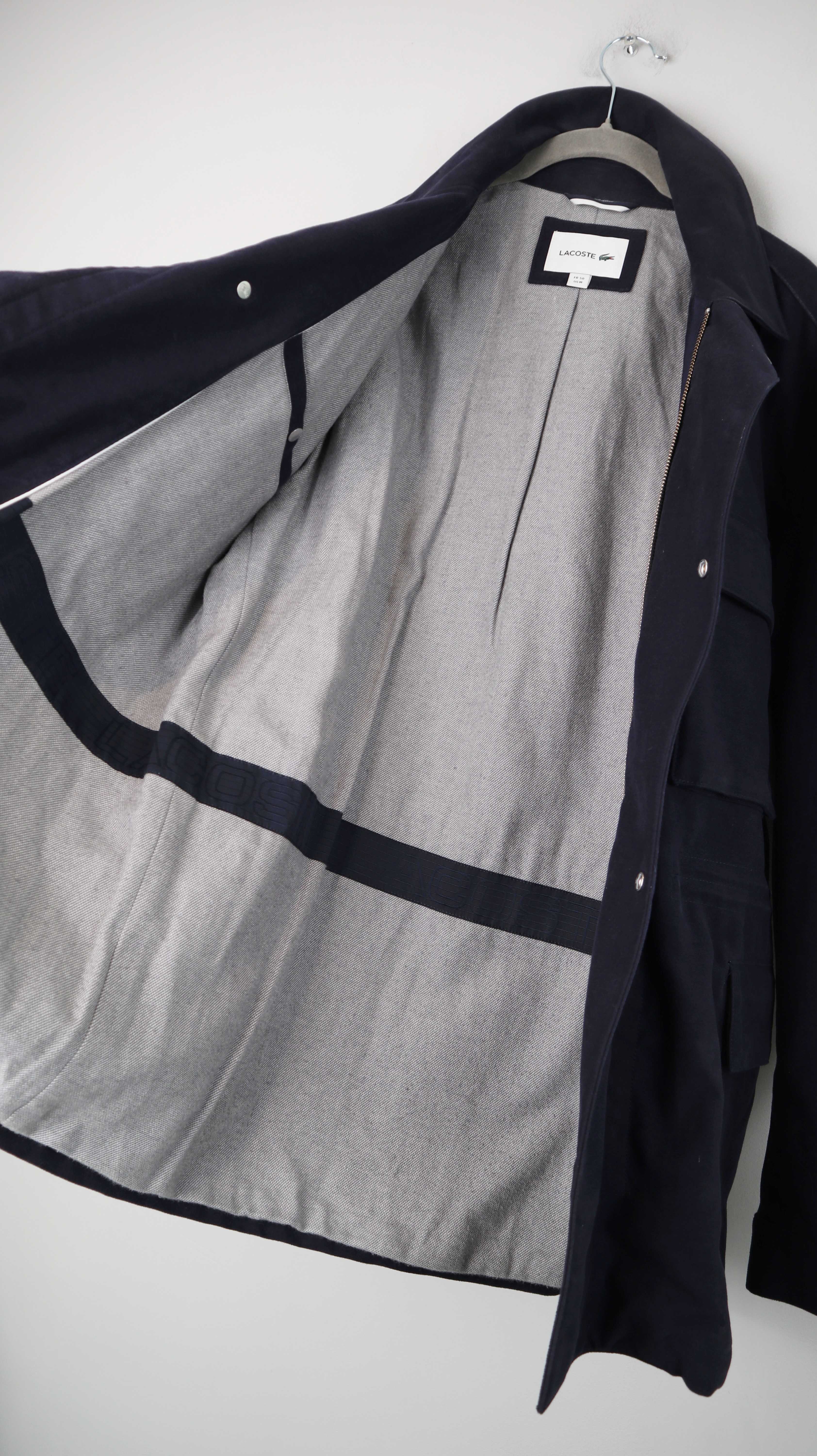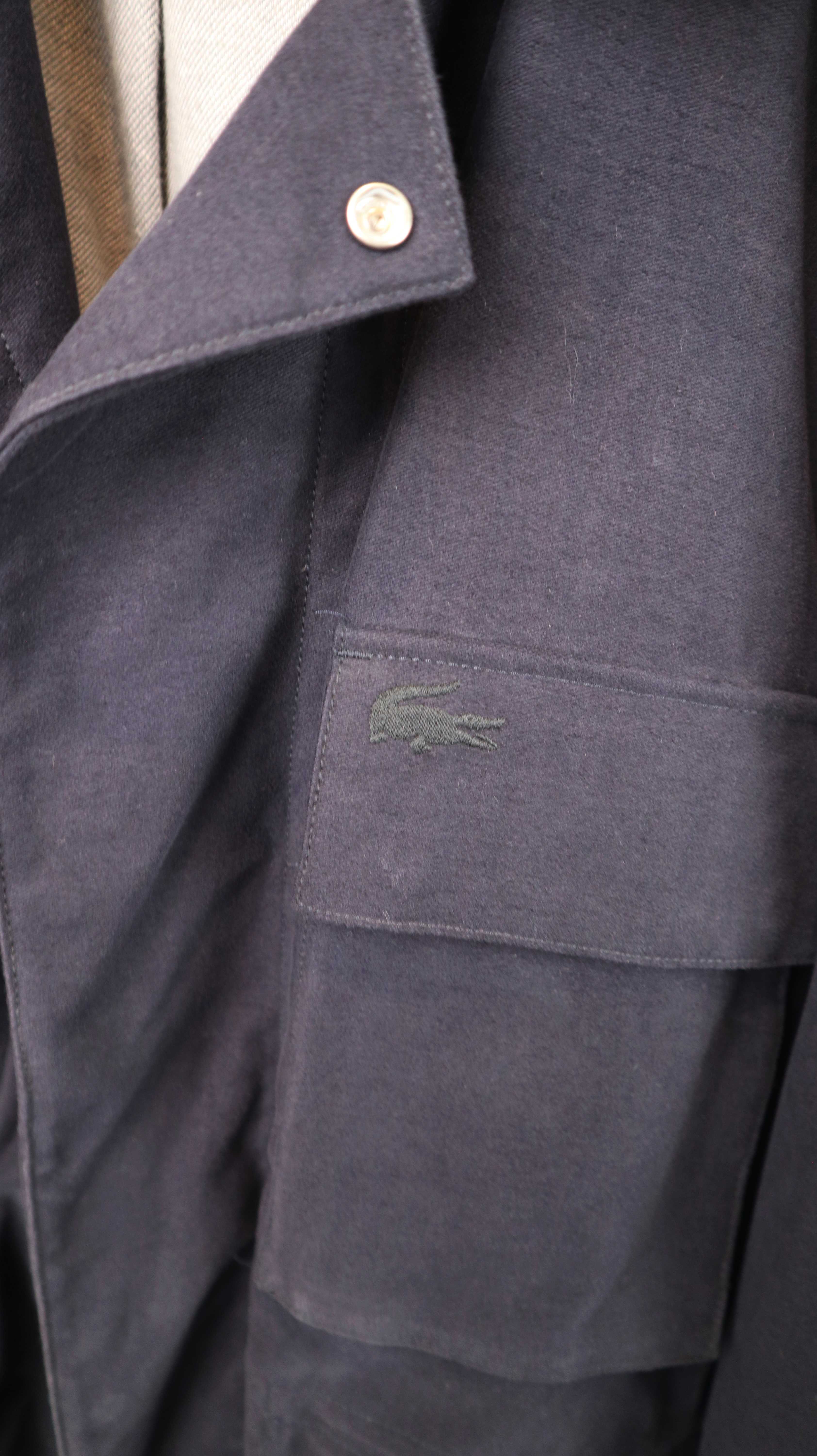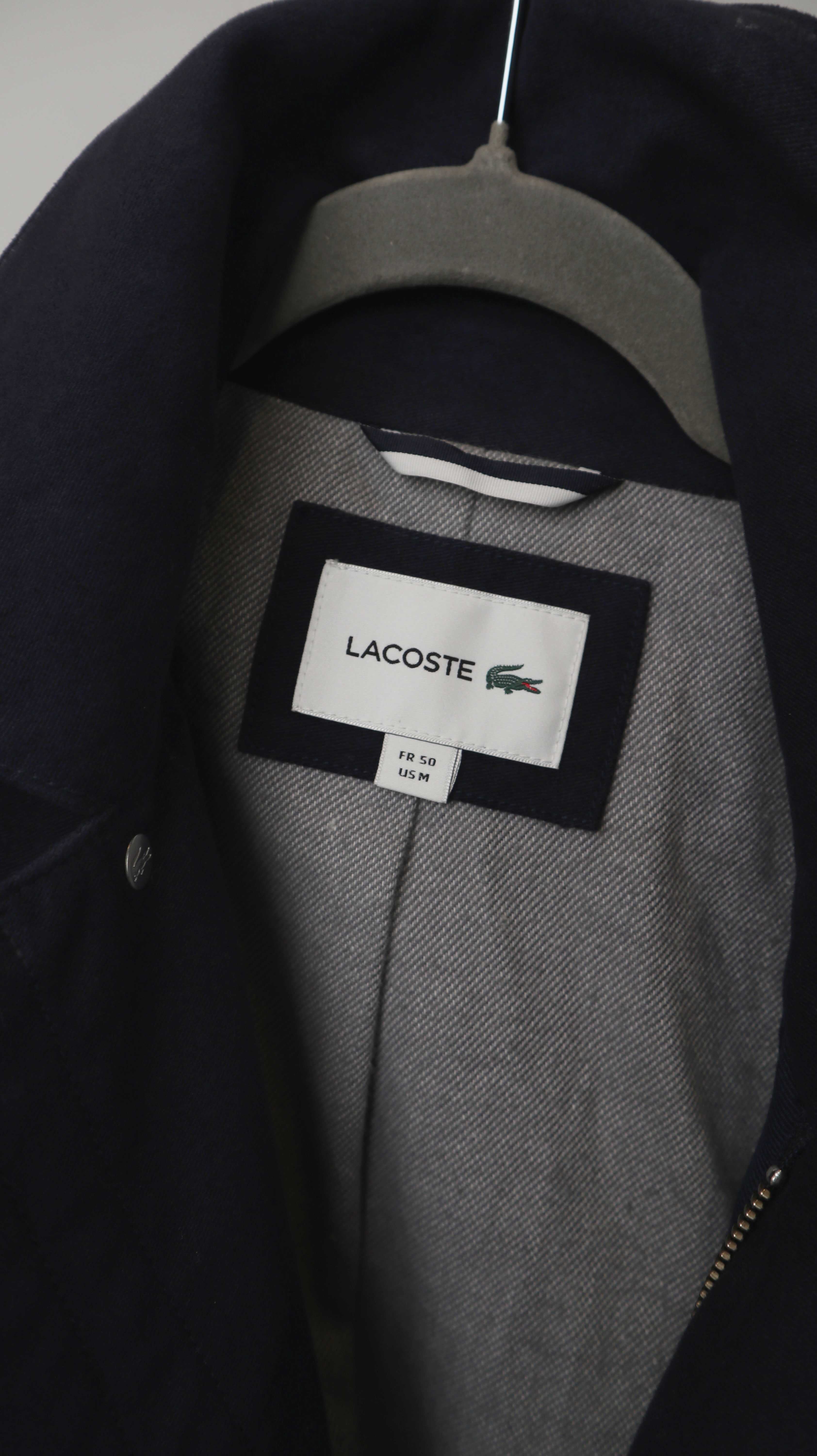Dunkelblaue Jacke aus Baumwolle von Lacoste. Sie ist in M und hat innen ein Gummiband, sodass man es taillieren kann. 58 cm Achselweite und 80 cm Länge. Plus Versand