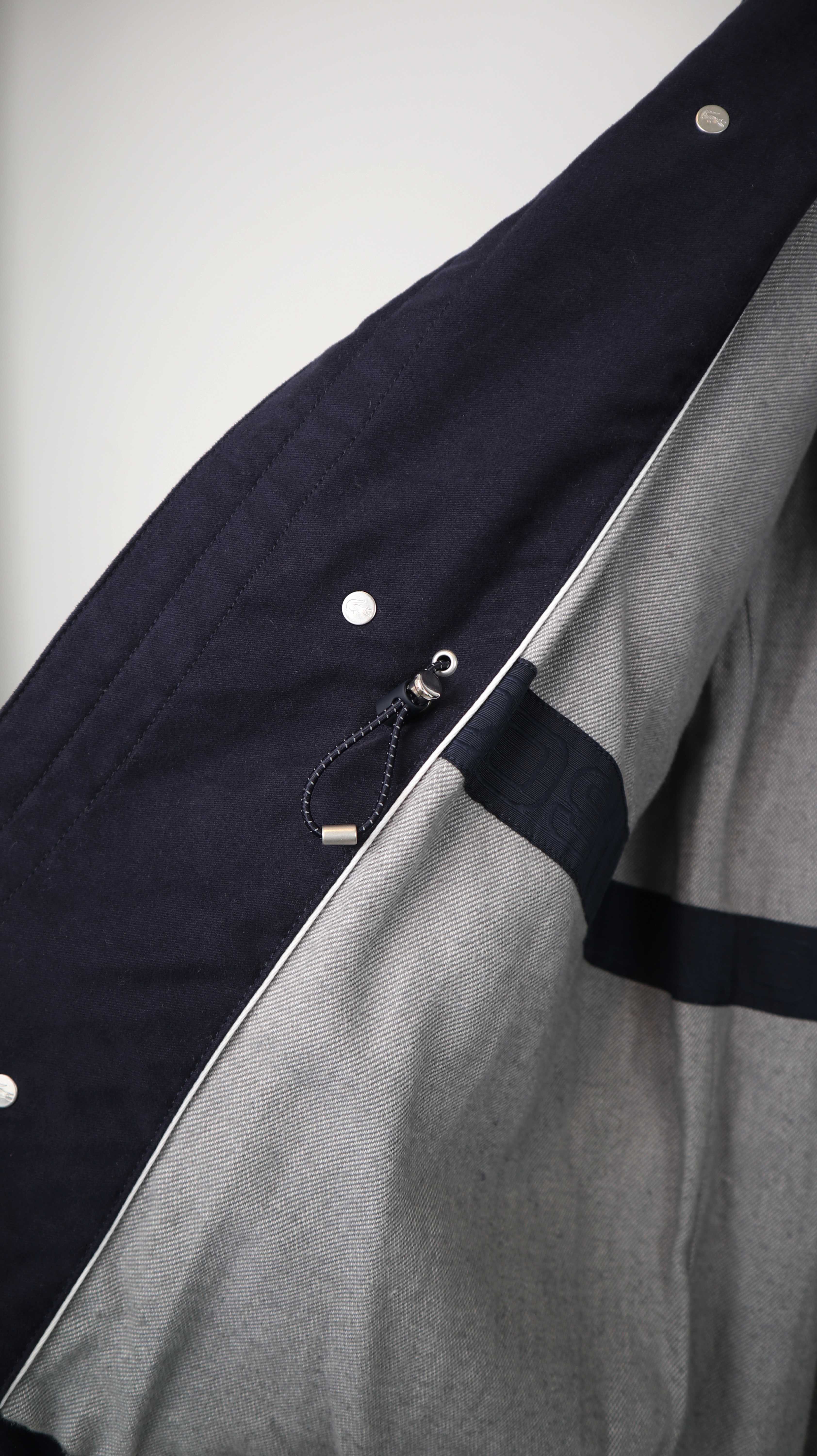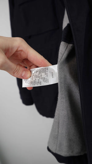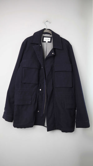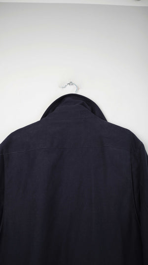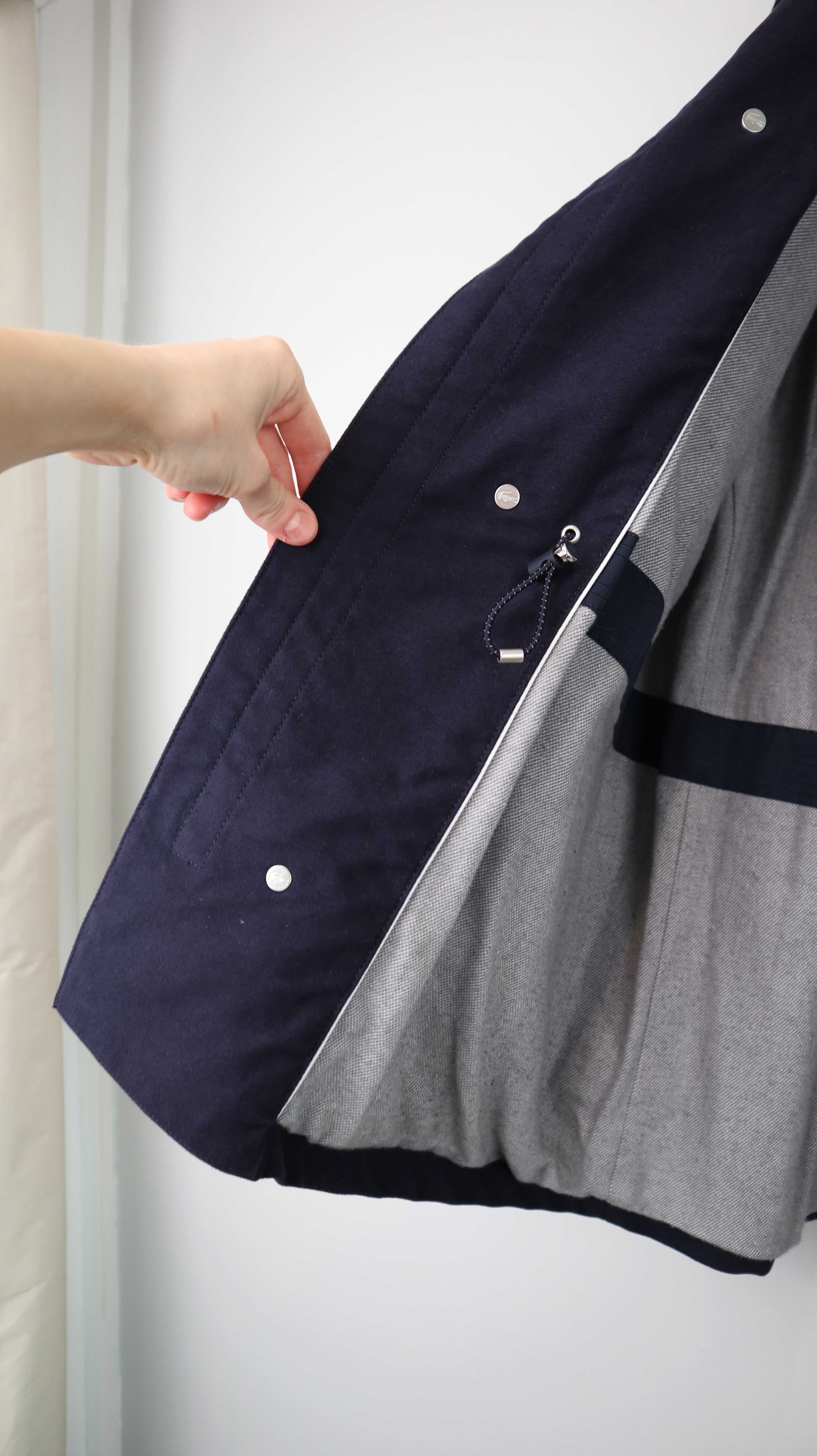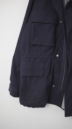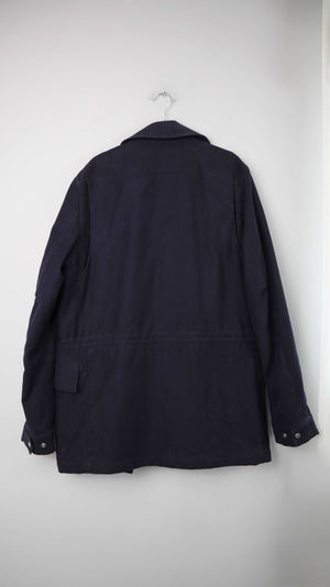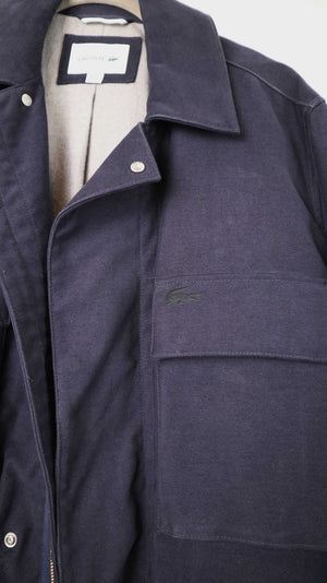 Dunkelblaue Jacke aus Baumwolle von Lacoste. Sie ist in M und hat innen ein Gummiband, sodass man es taillieren kann. 58 cm Achselweite und 80 cm Länge. Plus Versand