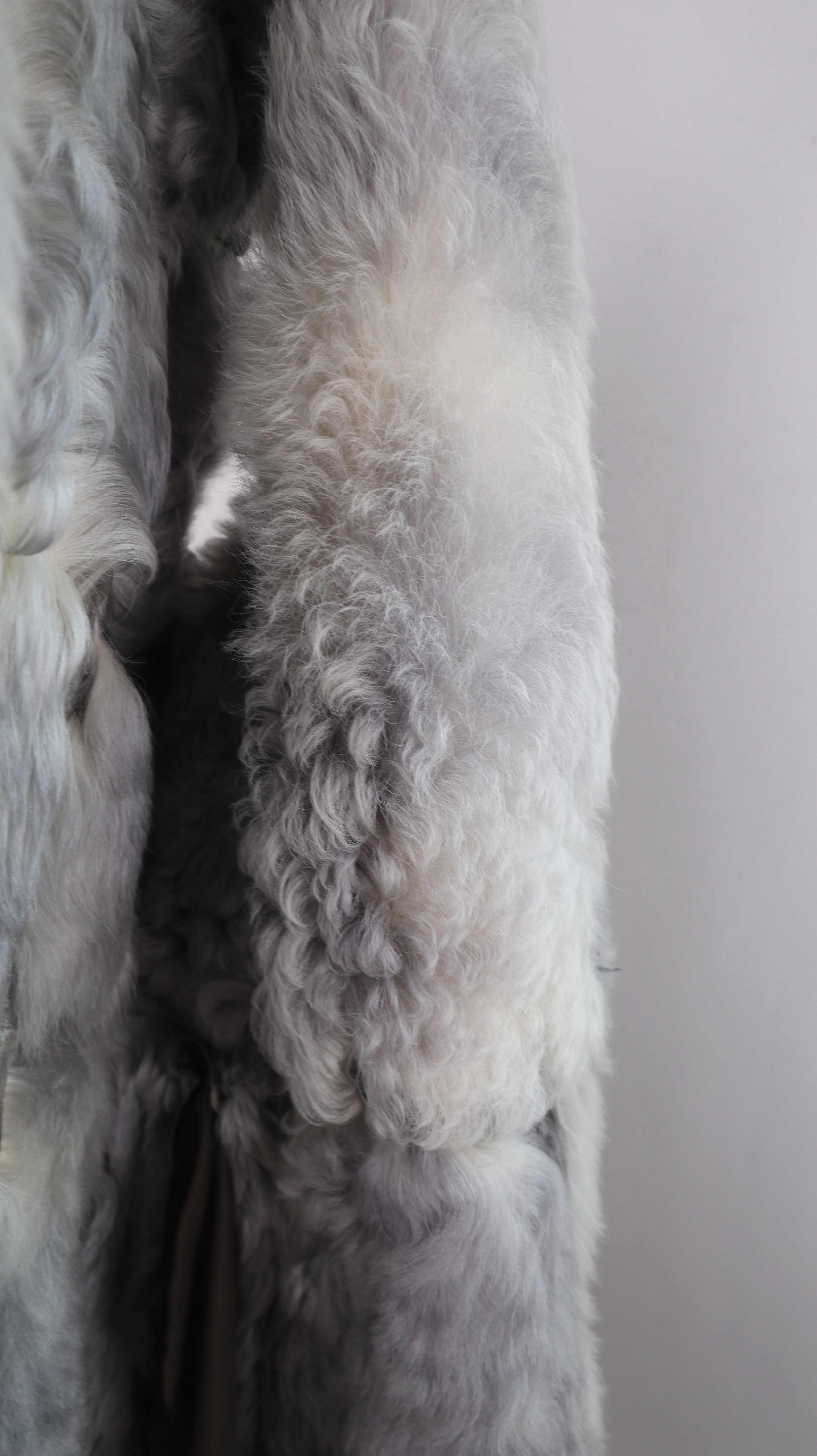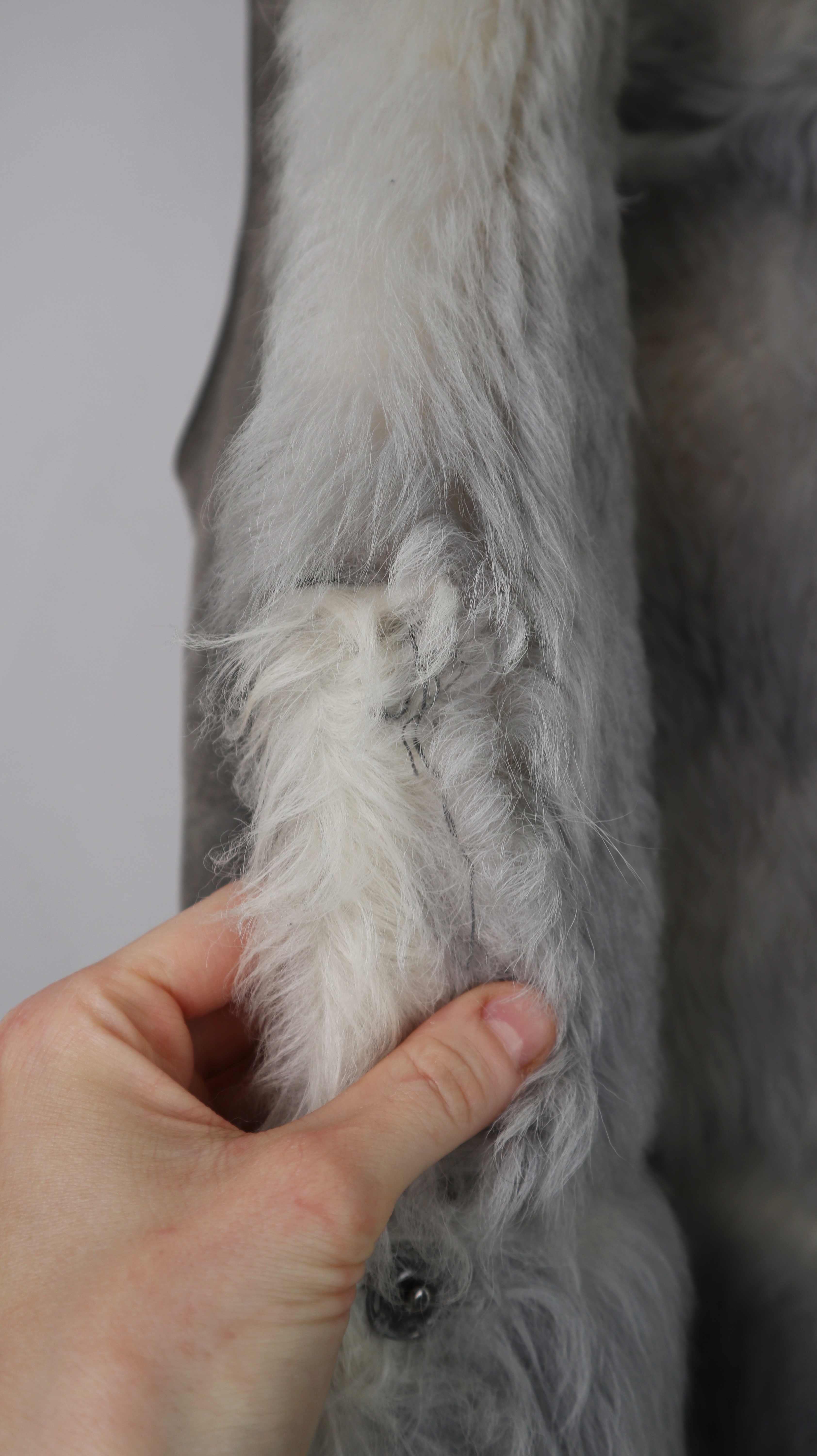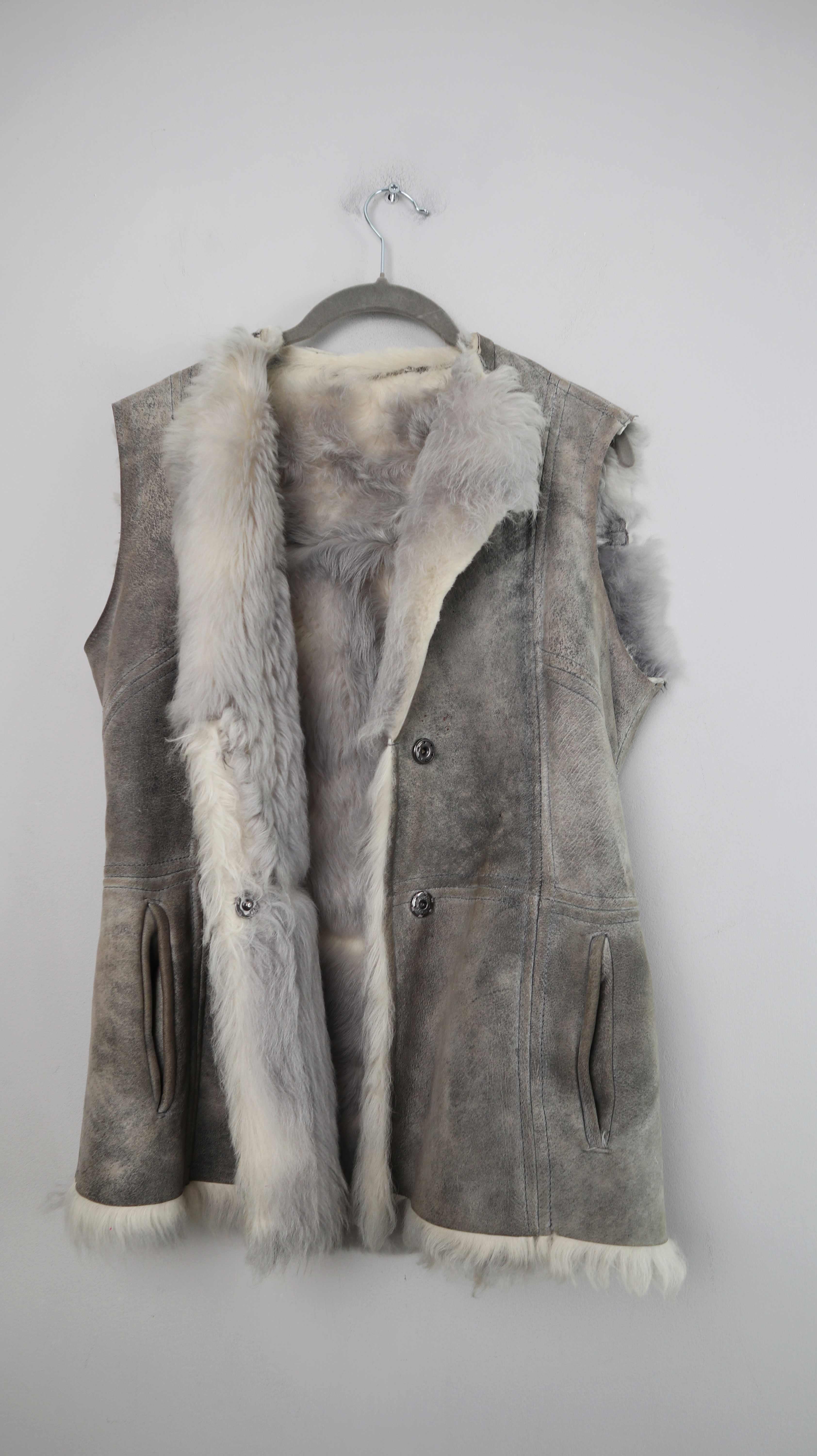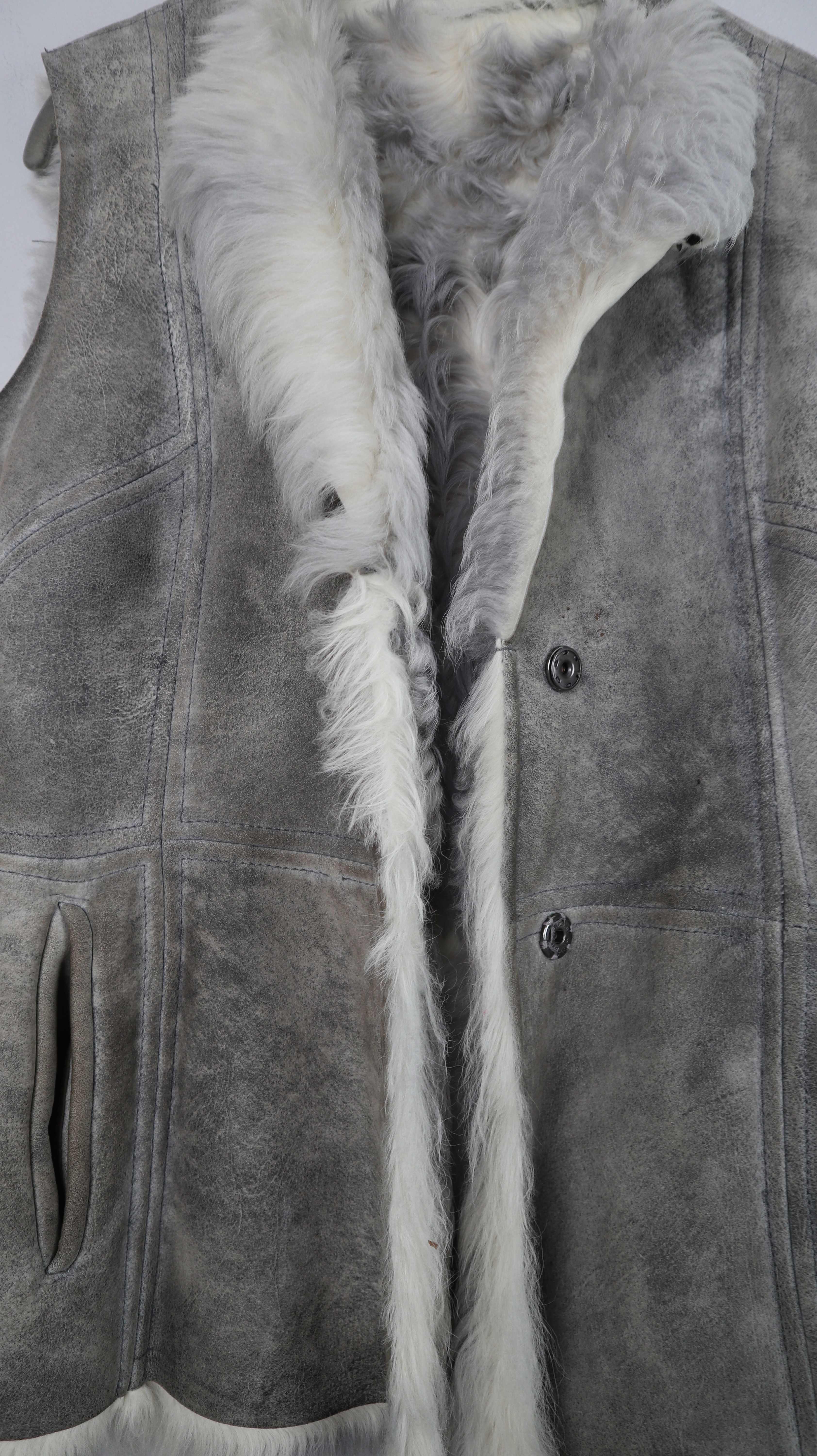 Graue Lammfellweste ohne Marke. Leider fehlt ein Knopf und auf der Rückseite gibt es am Fell eine kleine gelbe Stelle. 45 cm Achselweite und 69 cm Länge. Plus Versand