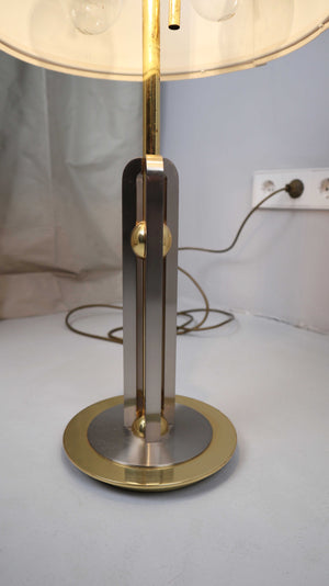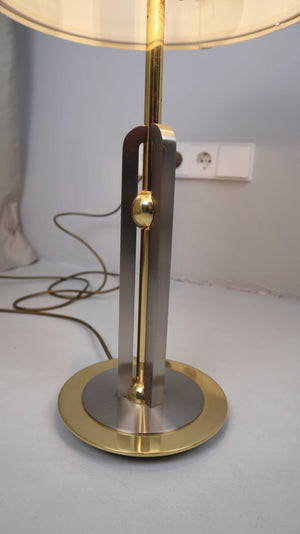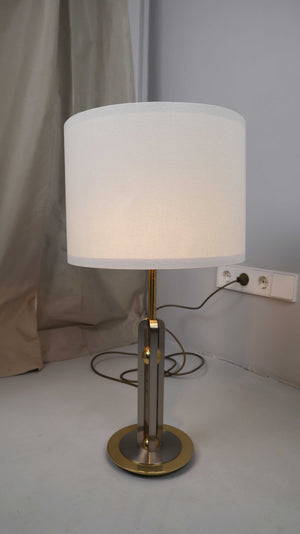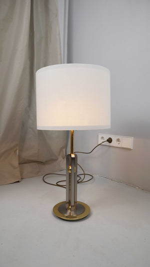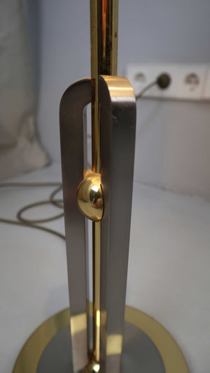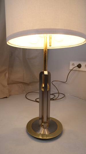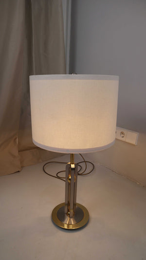 Vintage Tischlampe in Gold mit weißem Schirm. Der Schirm wurde manuell zur Lampe gewählt. Durch einen Strap hat man die Option die Lampe in drei Lichtstufen anzustellen. Plus Versand