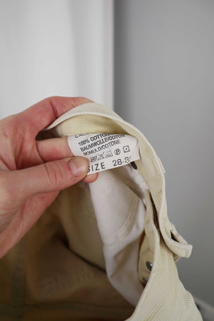Gelbe Hose von Lee in einer 28. Vintage, das Modell heißt California. Vorne ein schwarzer Fleck, der ggf. nicht mehr rausgeht. 34 cm Bundweite, 26 cm Schritthöhe und 67 cm Innenbeinlänge. Plus Versand
