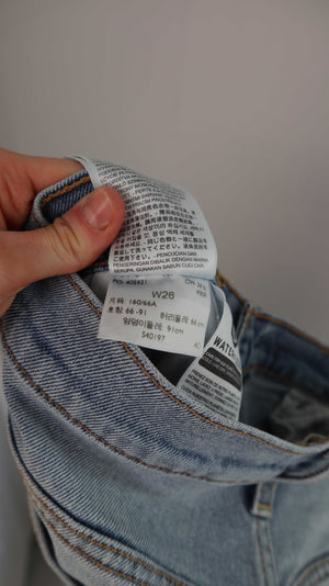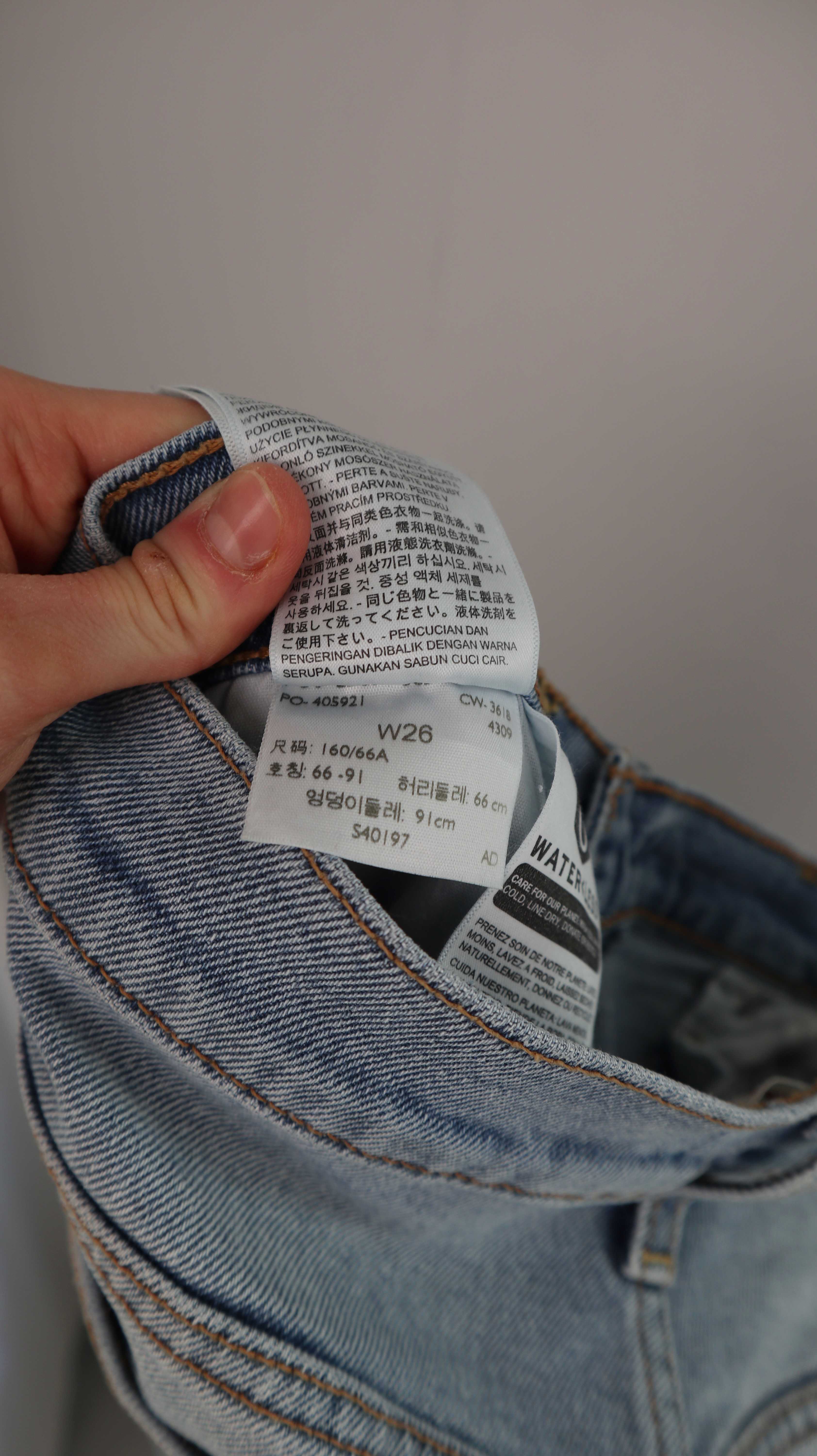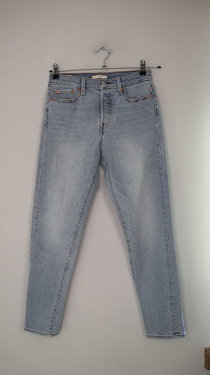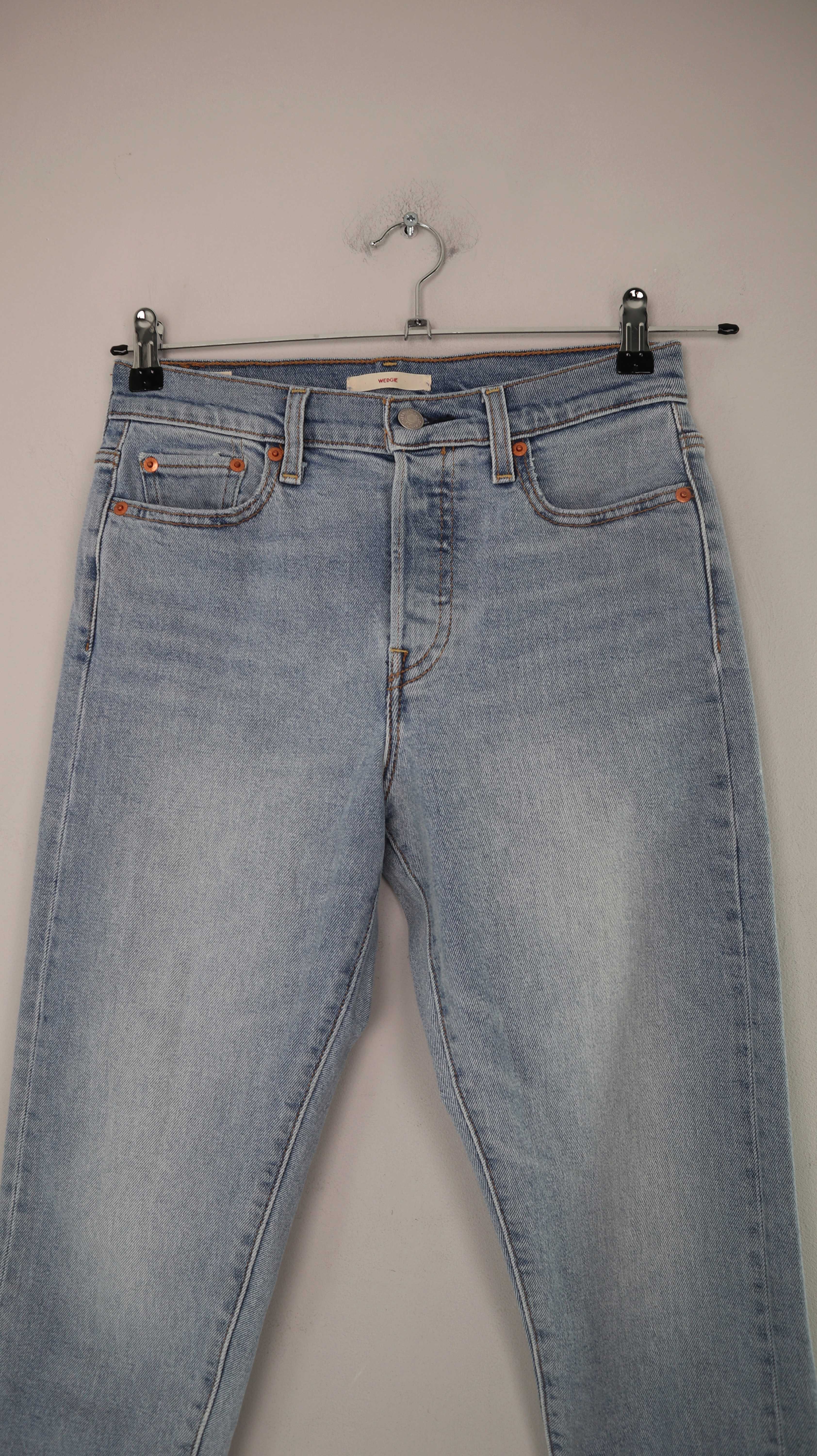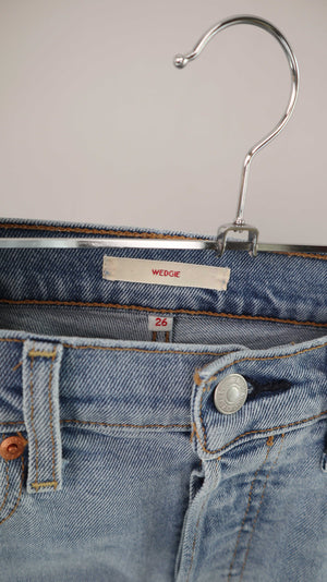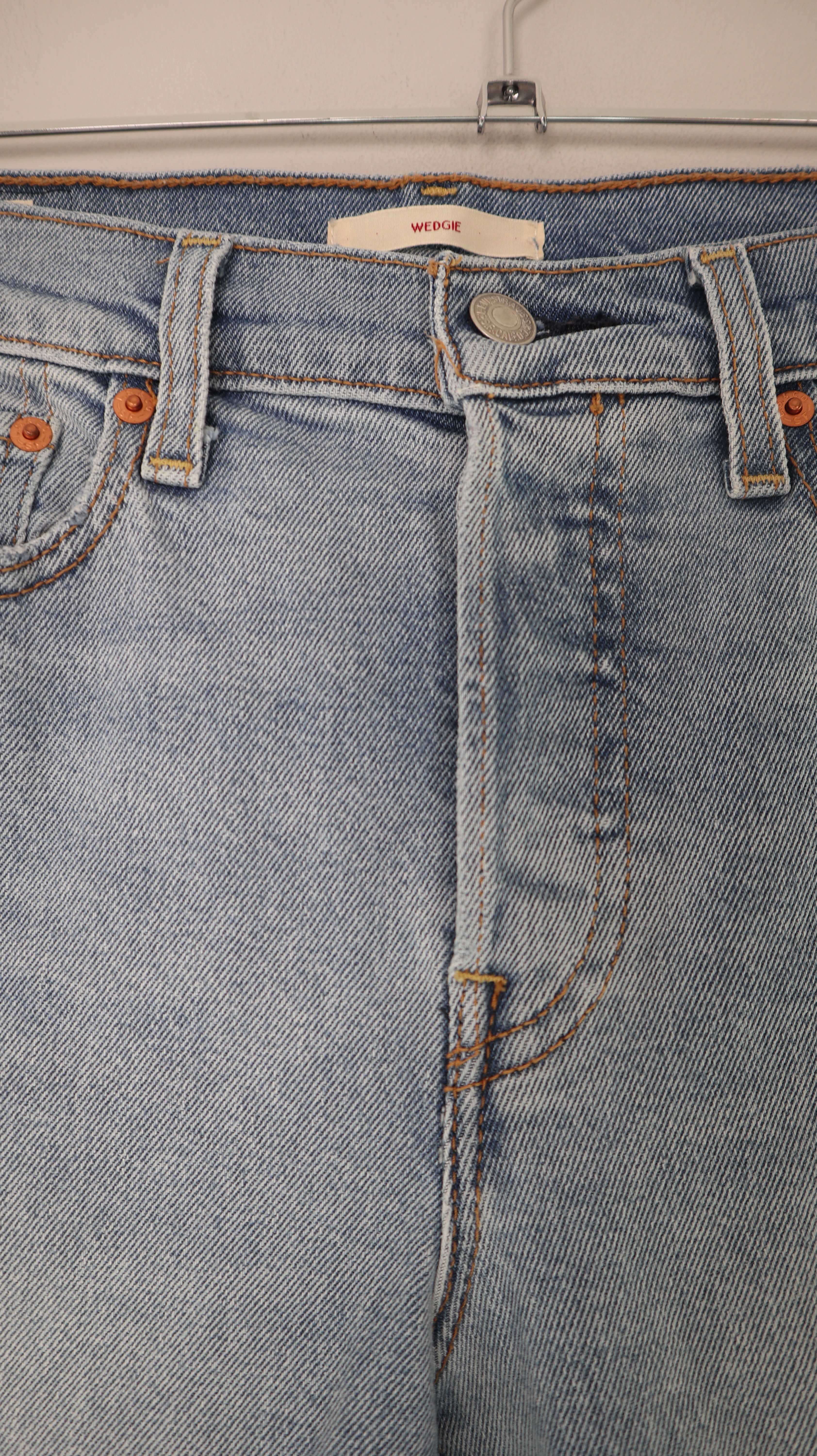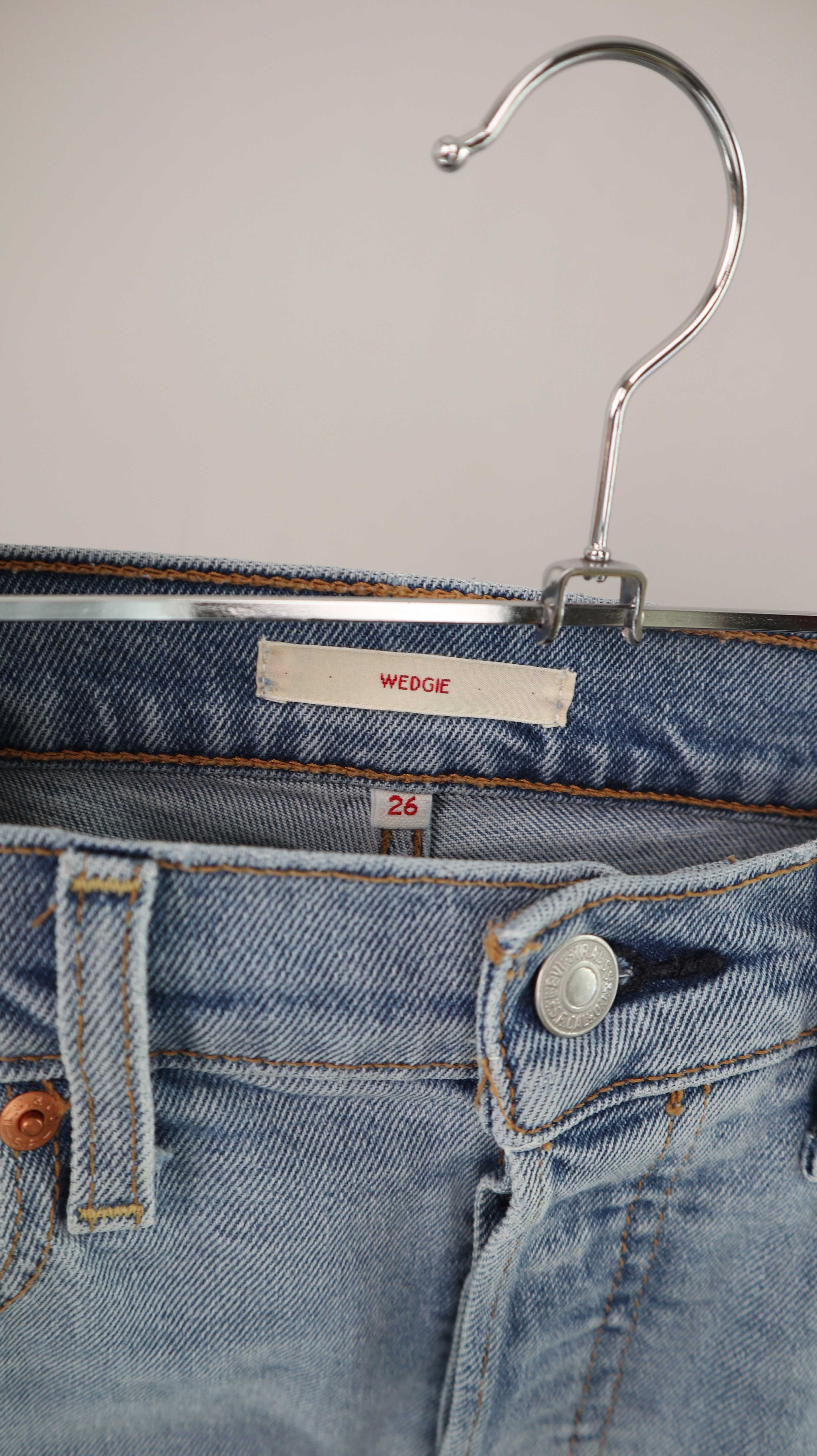Blaue Jeans von Levis, das Modell ist Wedgie in W26. 37 cm Bundweite, 28 cm Schritthöhe und 68 cm Innenbeinlänge. Plus Versand