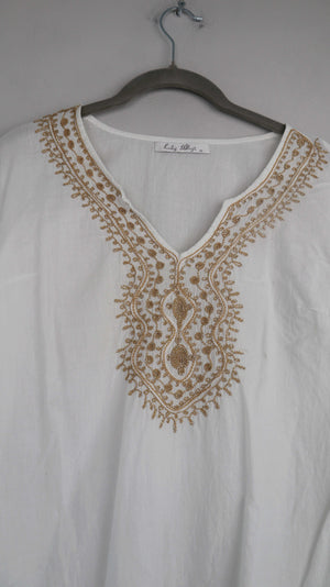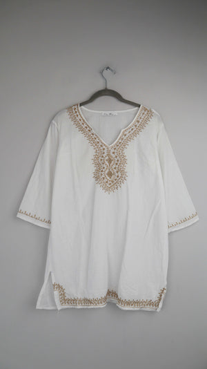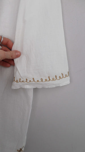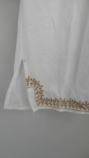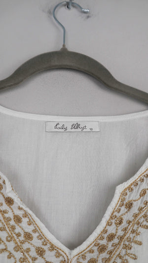 Weiße Bluse mit goldenen Bestickungen von Lily Whyt. Sie passt einer 38 M und ist aus Baumwolle. 49 cm Achselweite und 72 cm Länge. Plus Versand