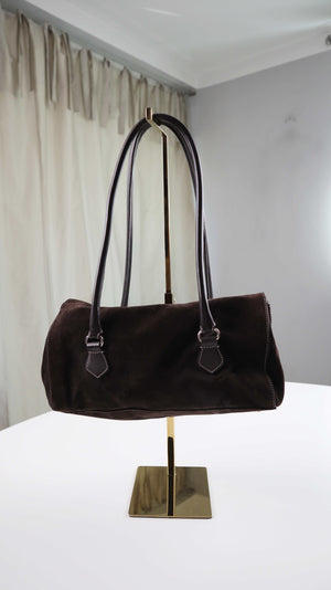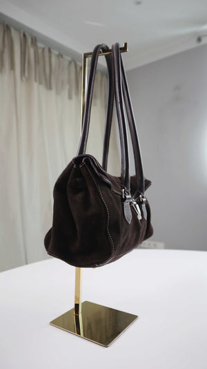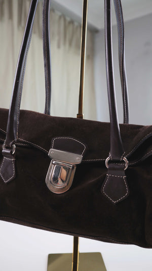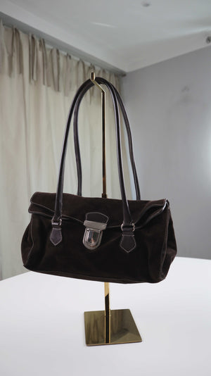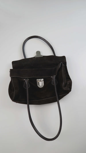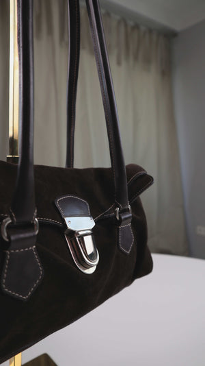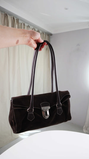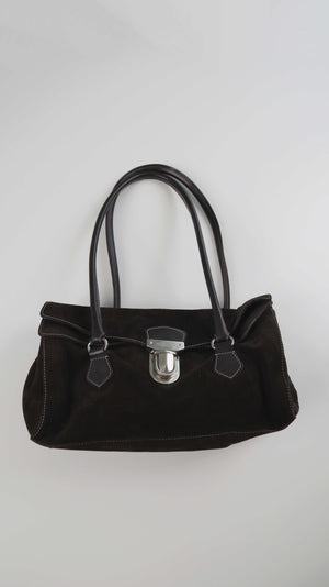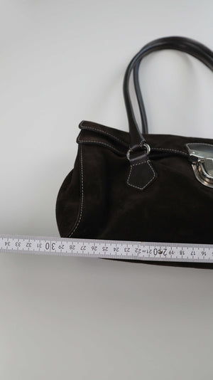 Dunkelbraune Schultertasche aus Wildleder mit einem Klipser vorne. Plus Versand