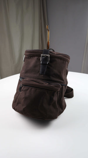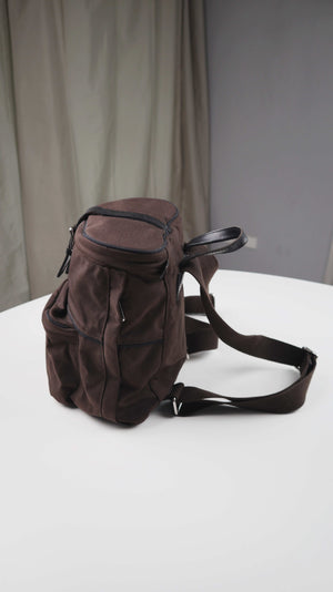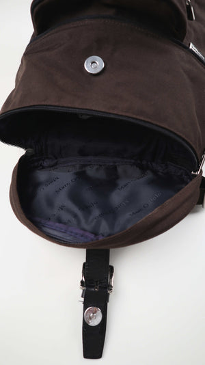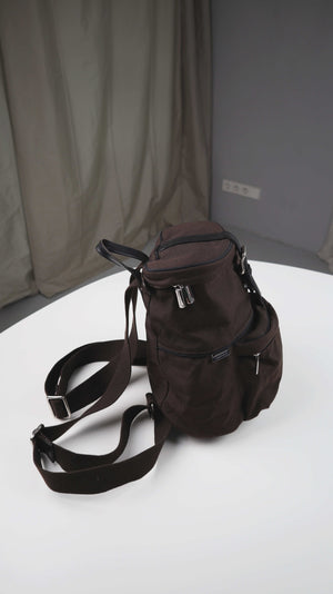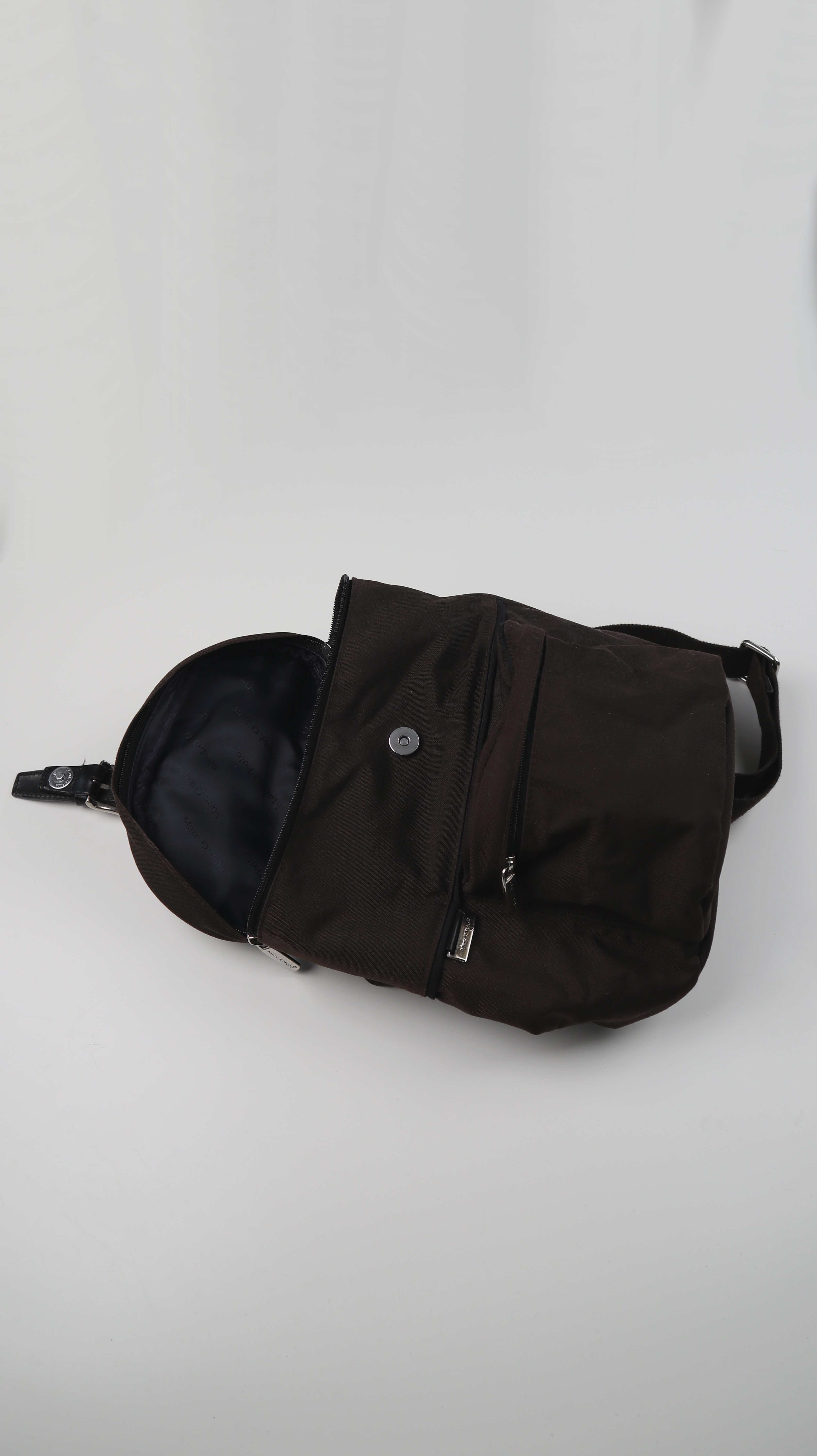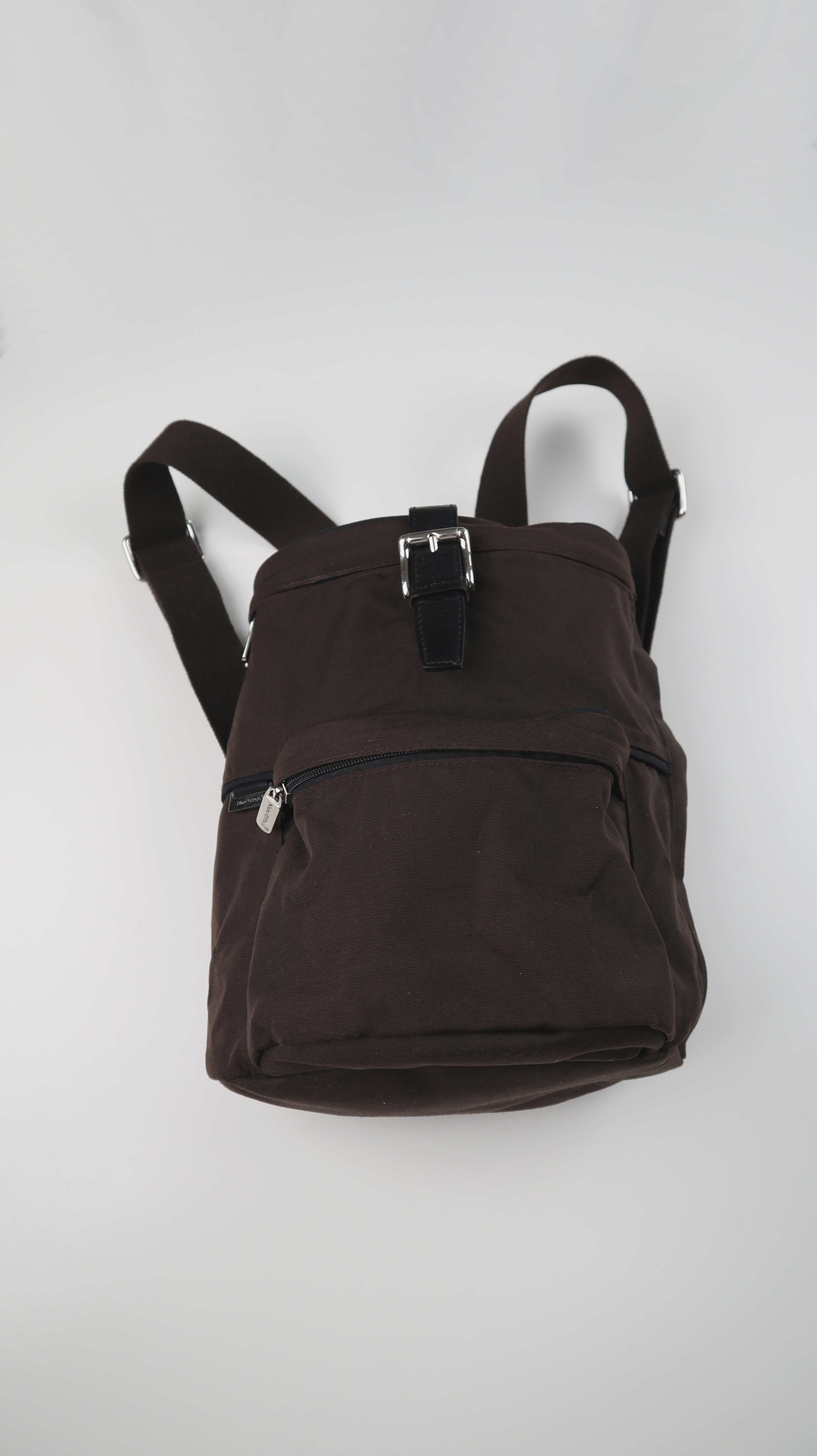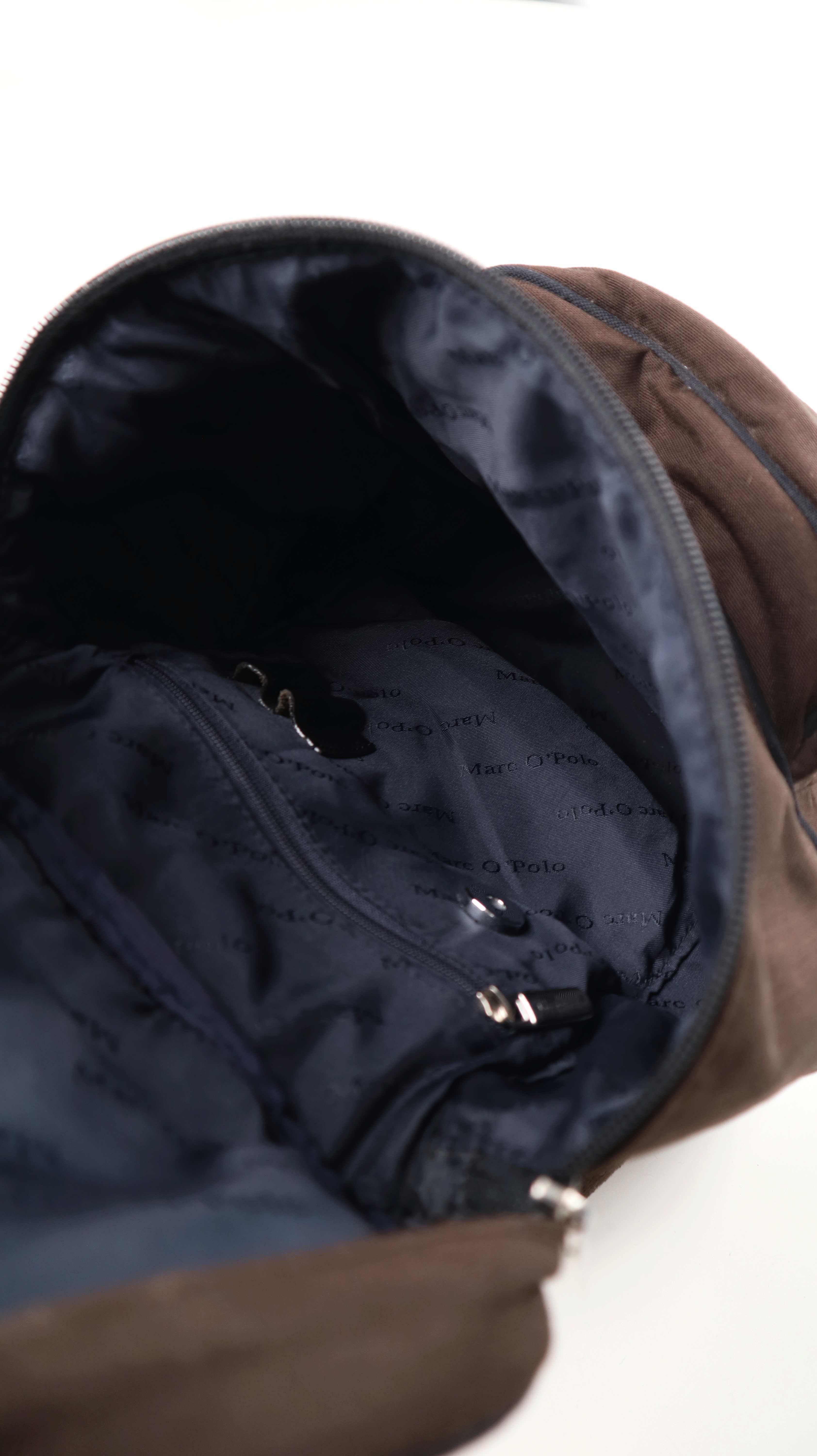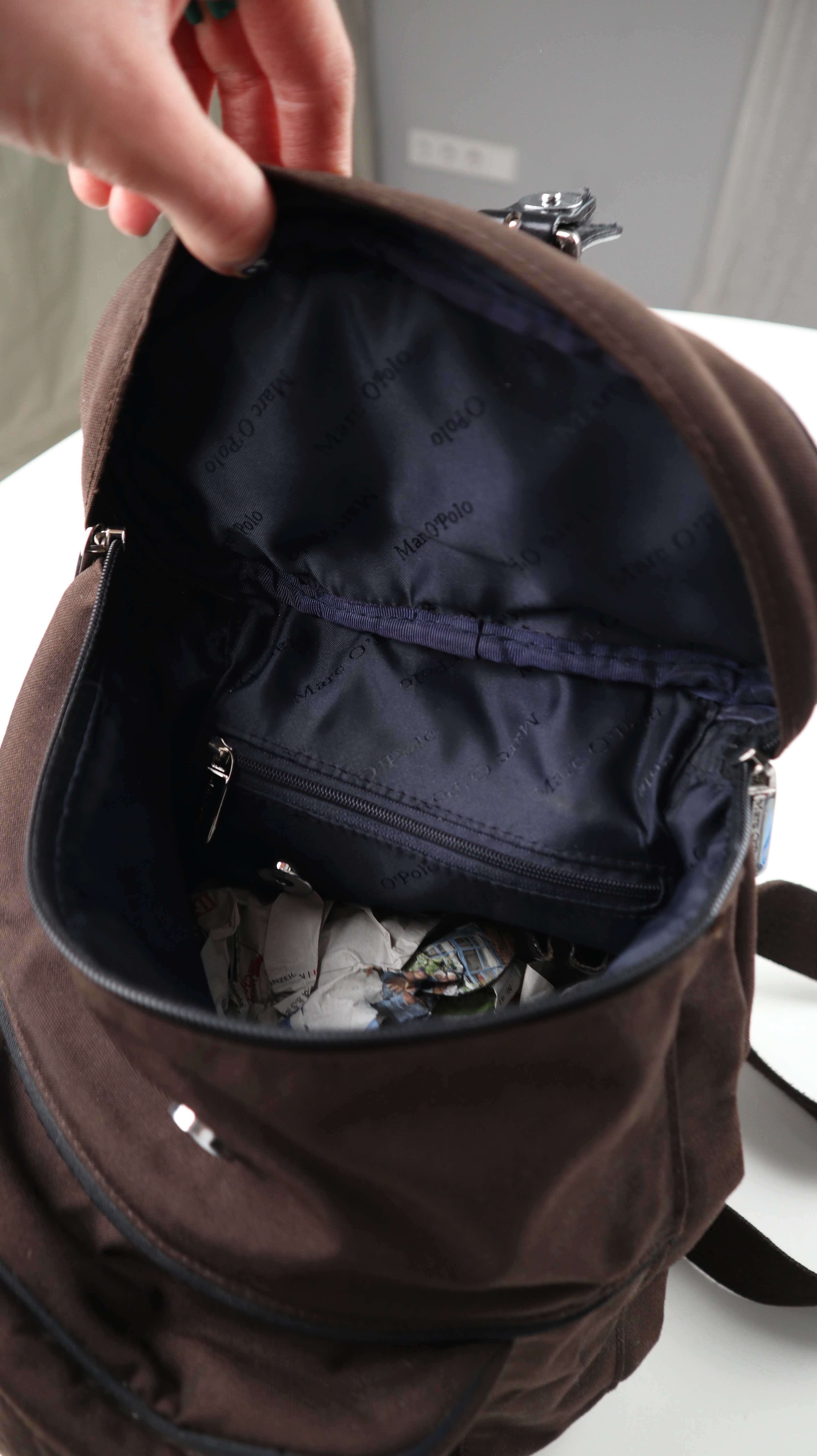 Kleiner brauner Rucksack von Marc O'Polo. Innen sind weitere Fächer vorhanden, seitlich hat er die möglichkeit über einen Reißverschluss schnell etwas rauszuholen. Plus Versand