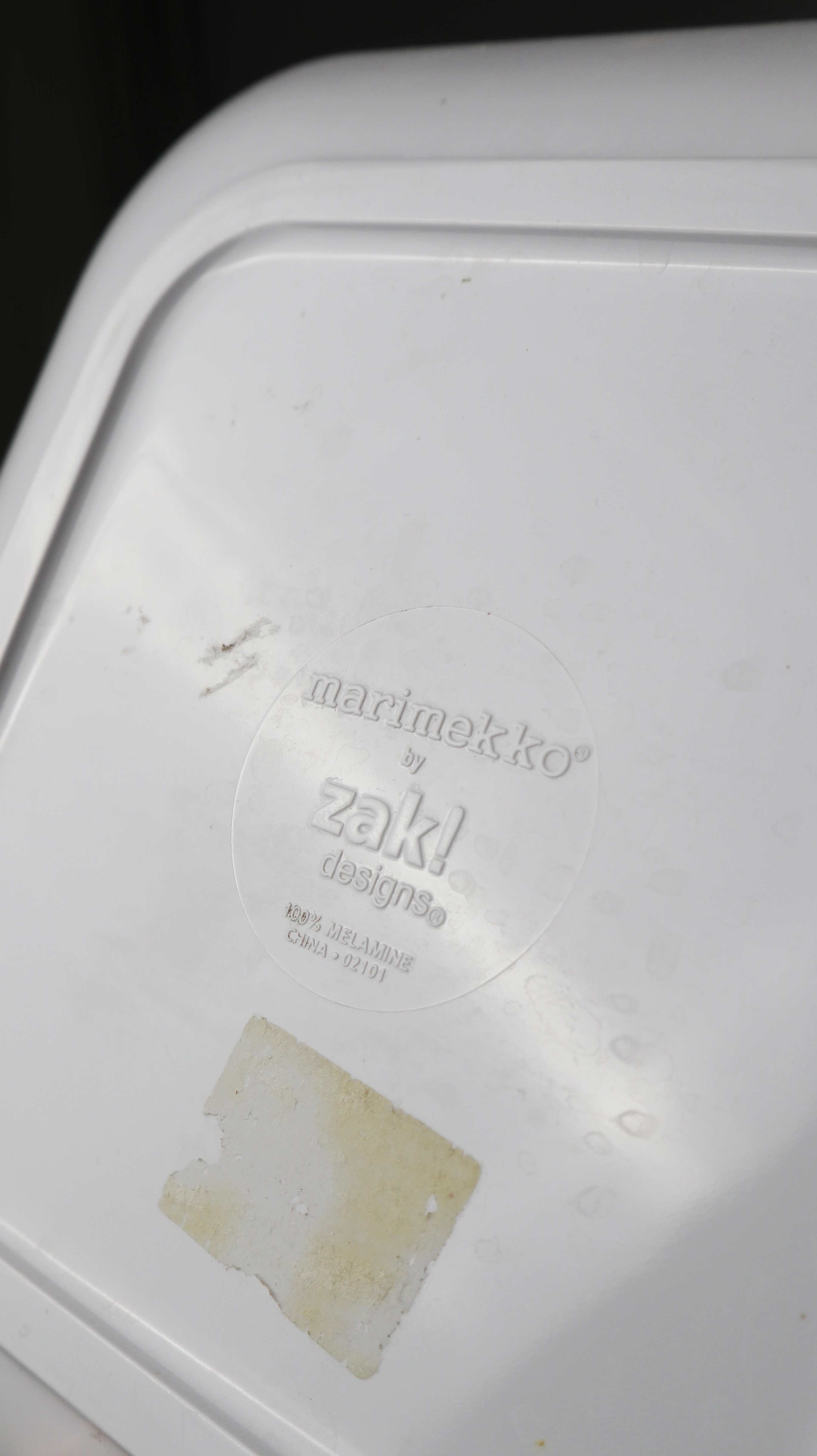 Set von vier normal genutzten Tellern aus Kunststoff von Marimekko. Sie haben normale kleine Gebrauchsspuren und sind ideal für unterwegs. Plus Versand