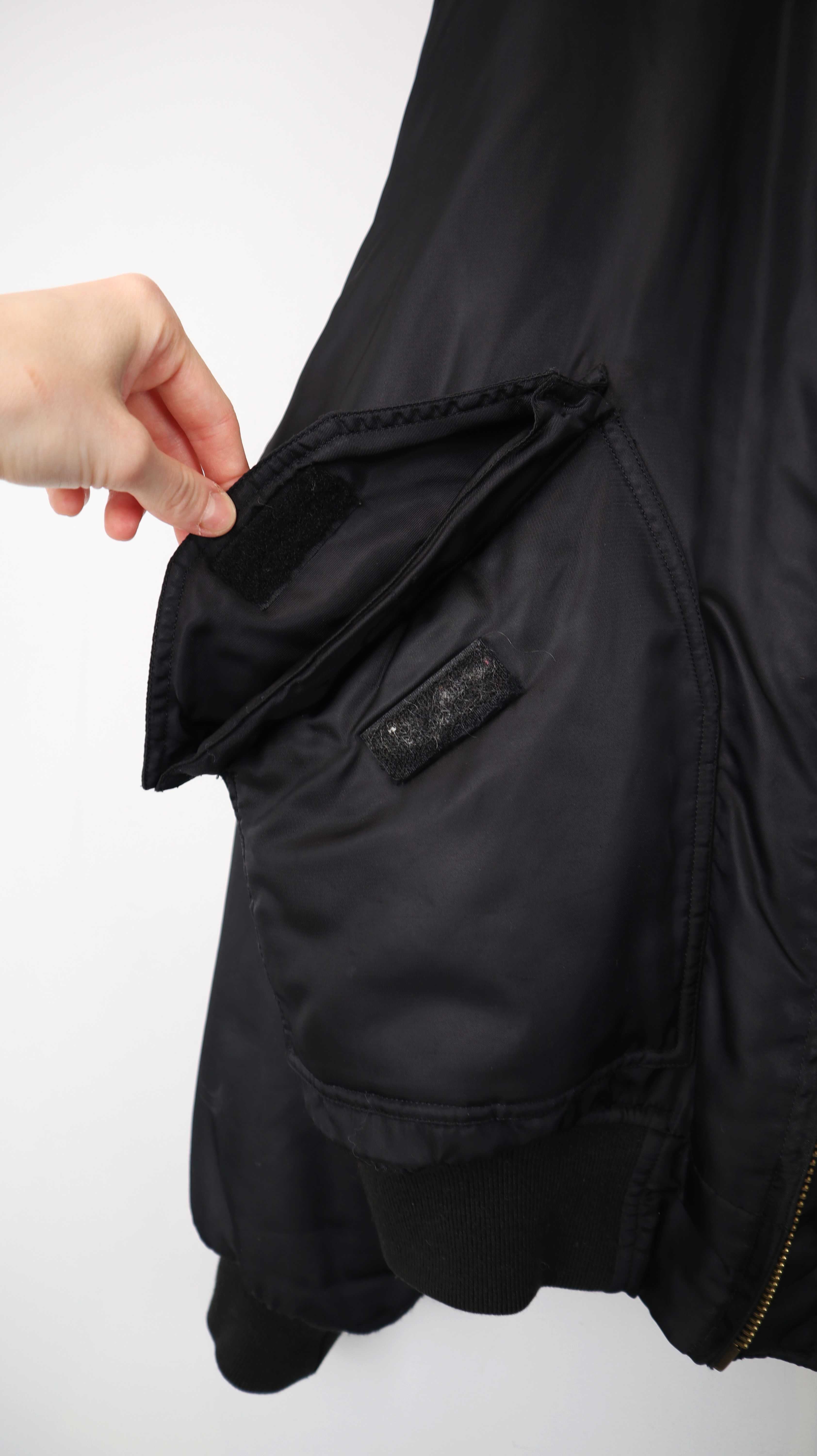 Schwarze Bomberjacke in L von McAllister. Sie ist locker geschnitten, innen gibt es ein Loch, was man beim Tragen nicht sieht. 62 cm Achselweite und 69 cm Länge. Plus Versand
