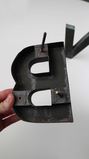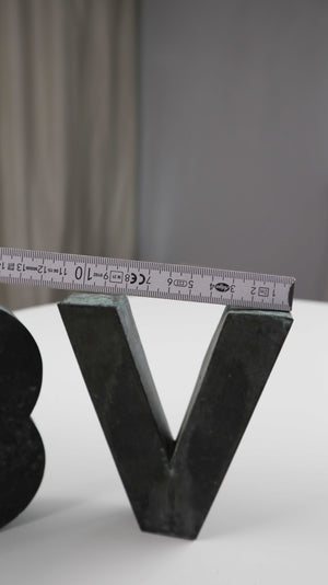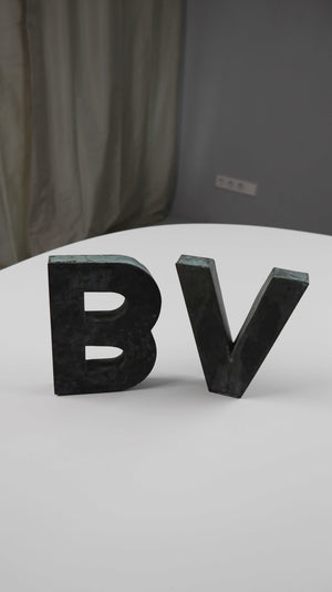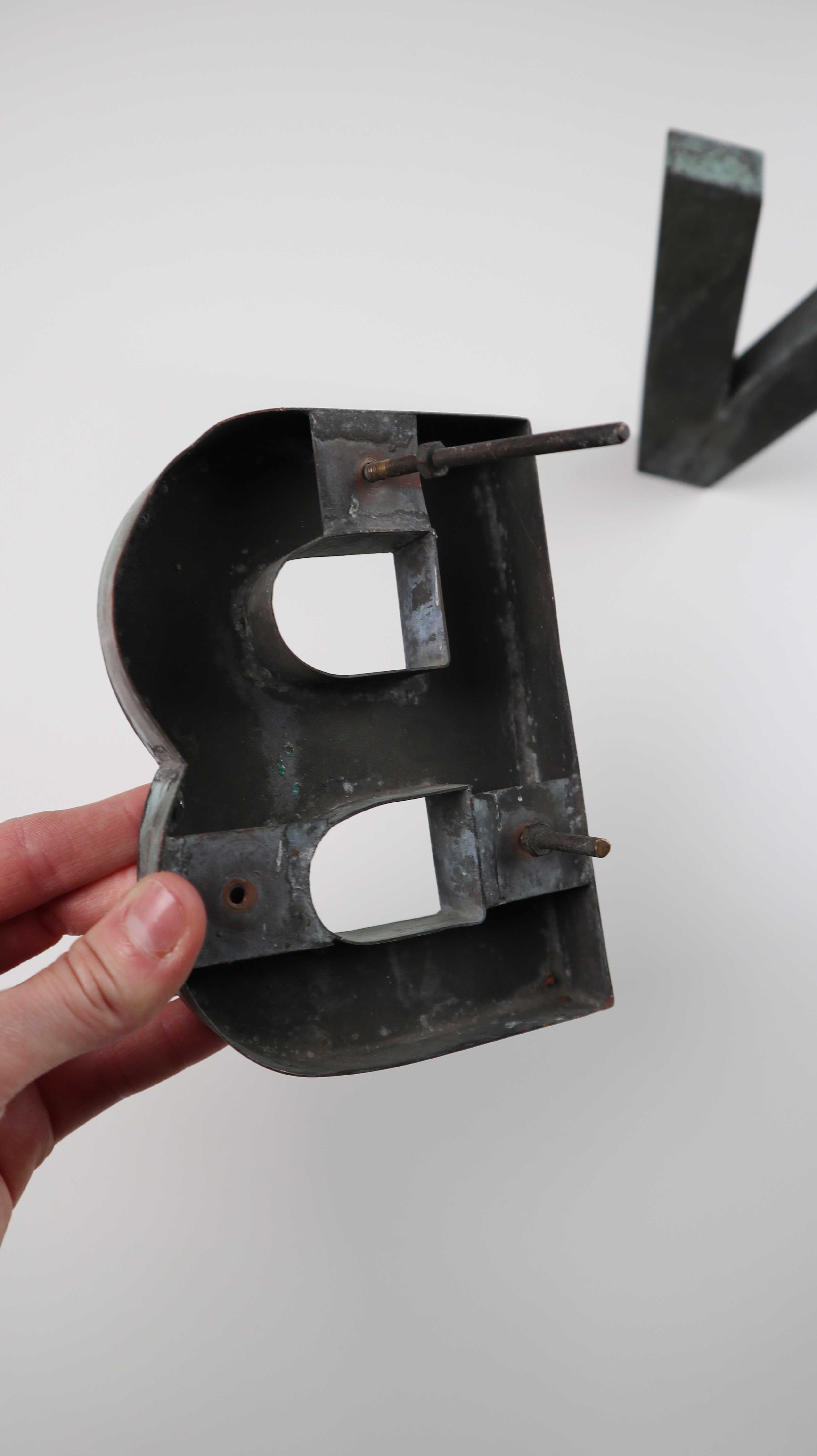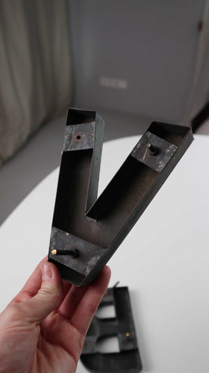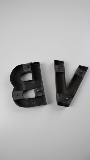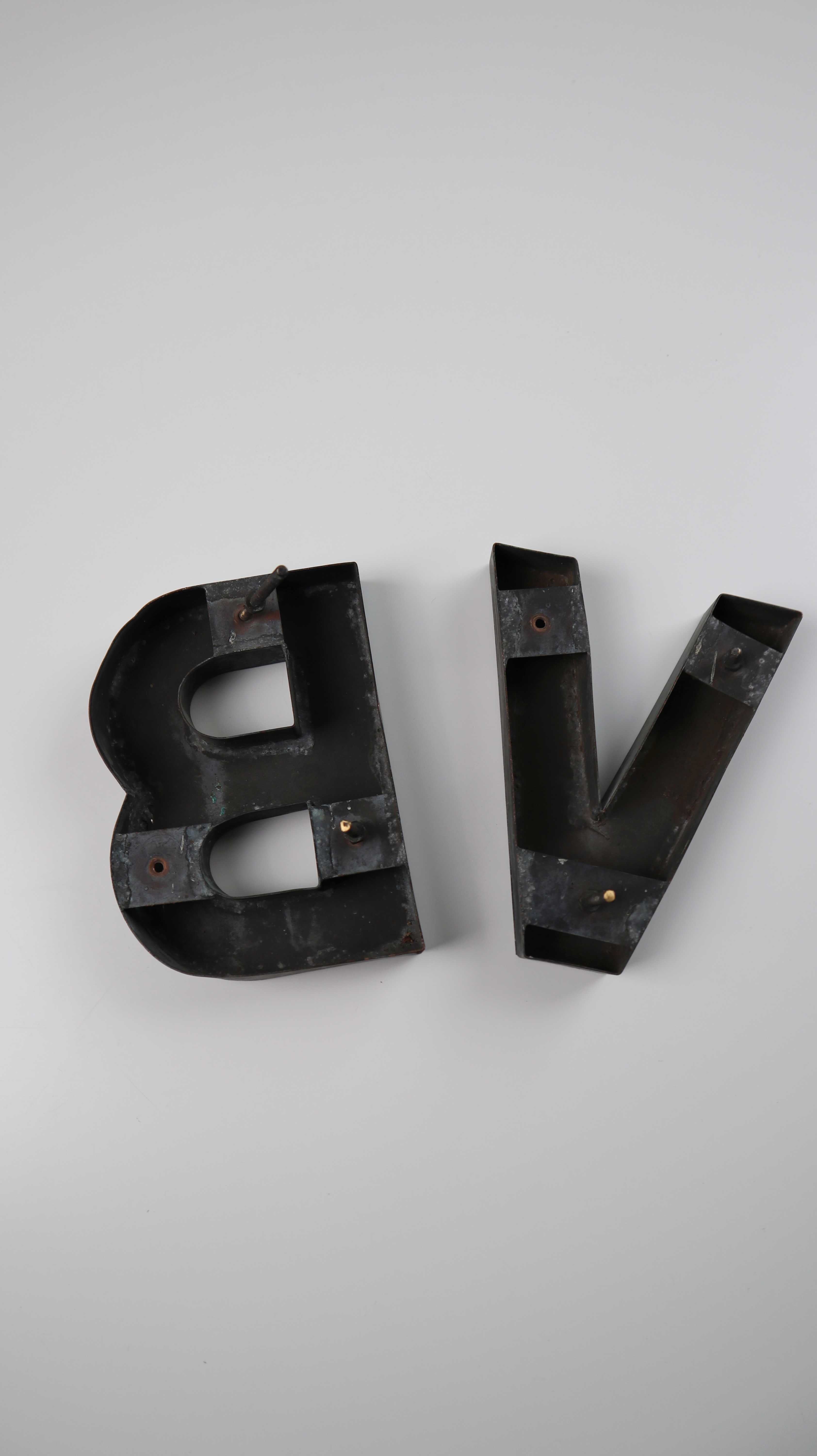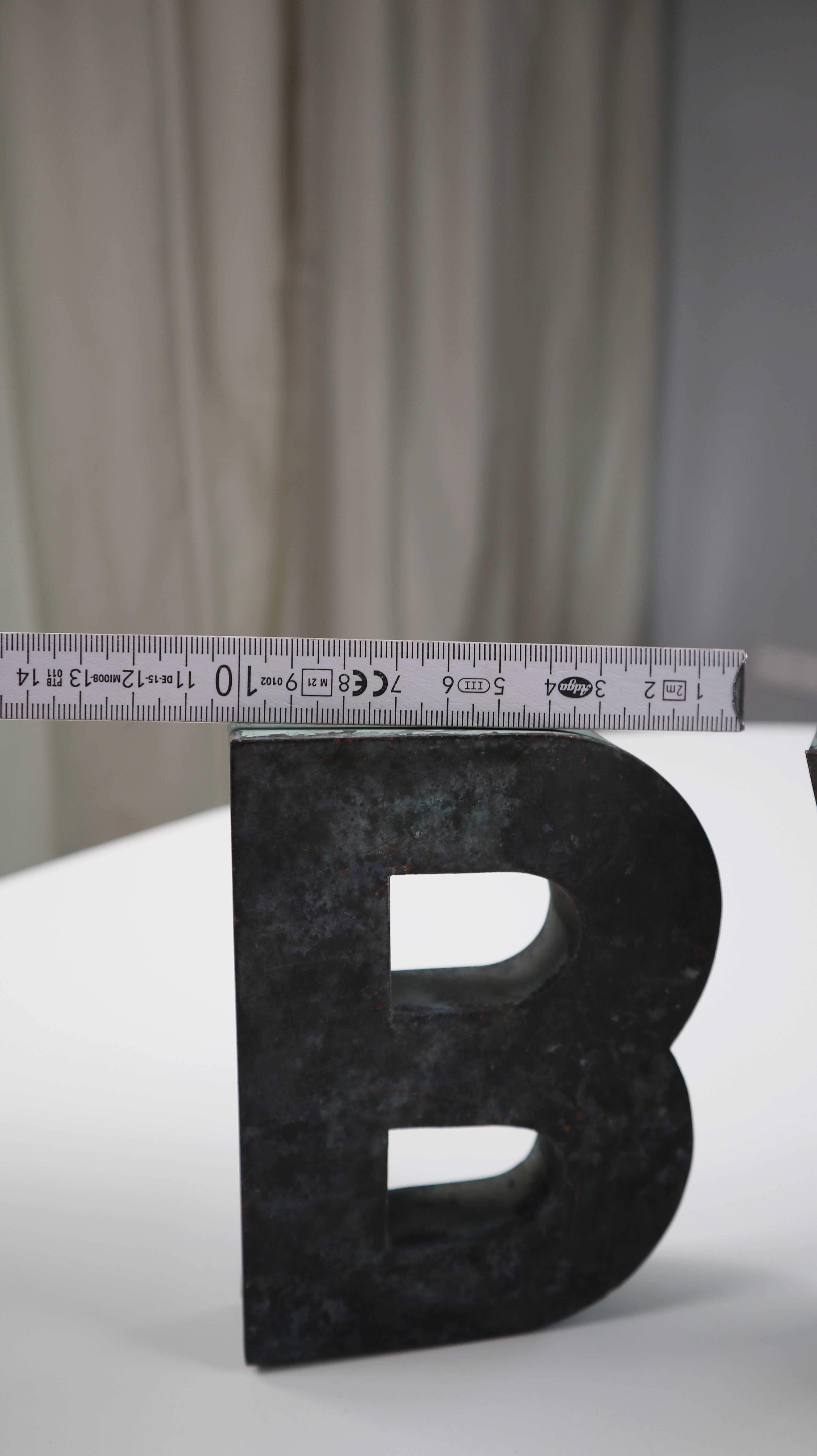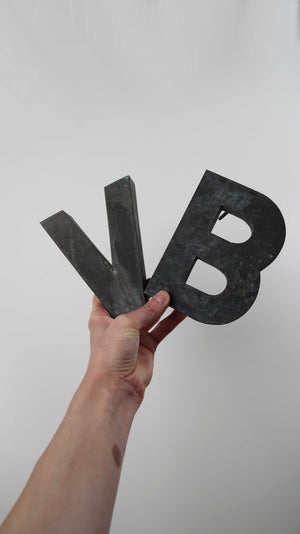 Zwei kleine, alte Metallbuchstaben in Grau mit Patina. Größe um die 10 cm. Plus Versand