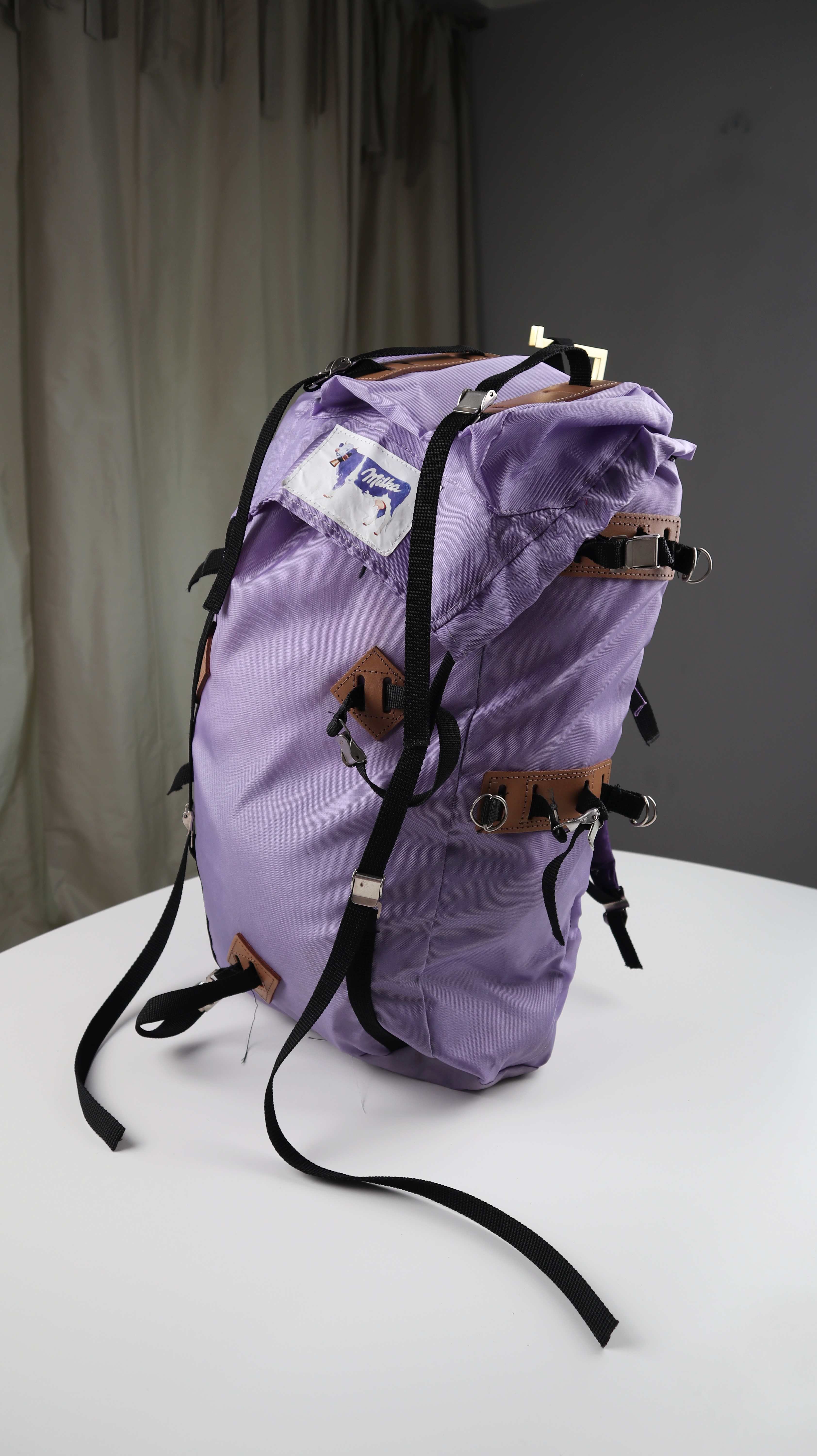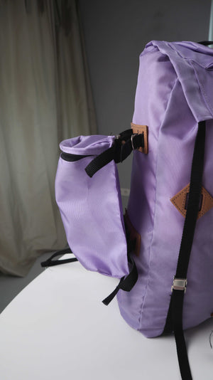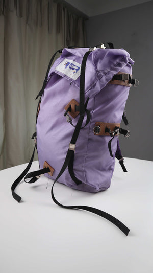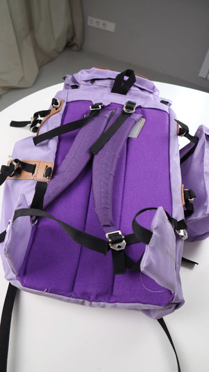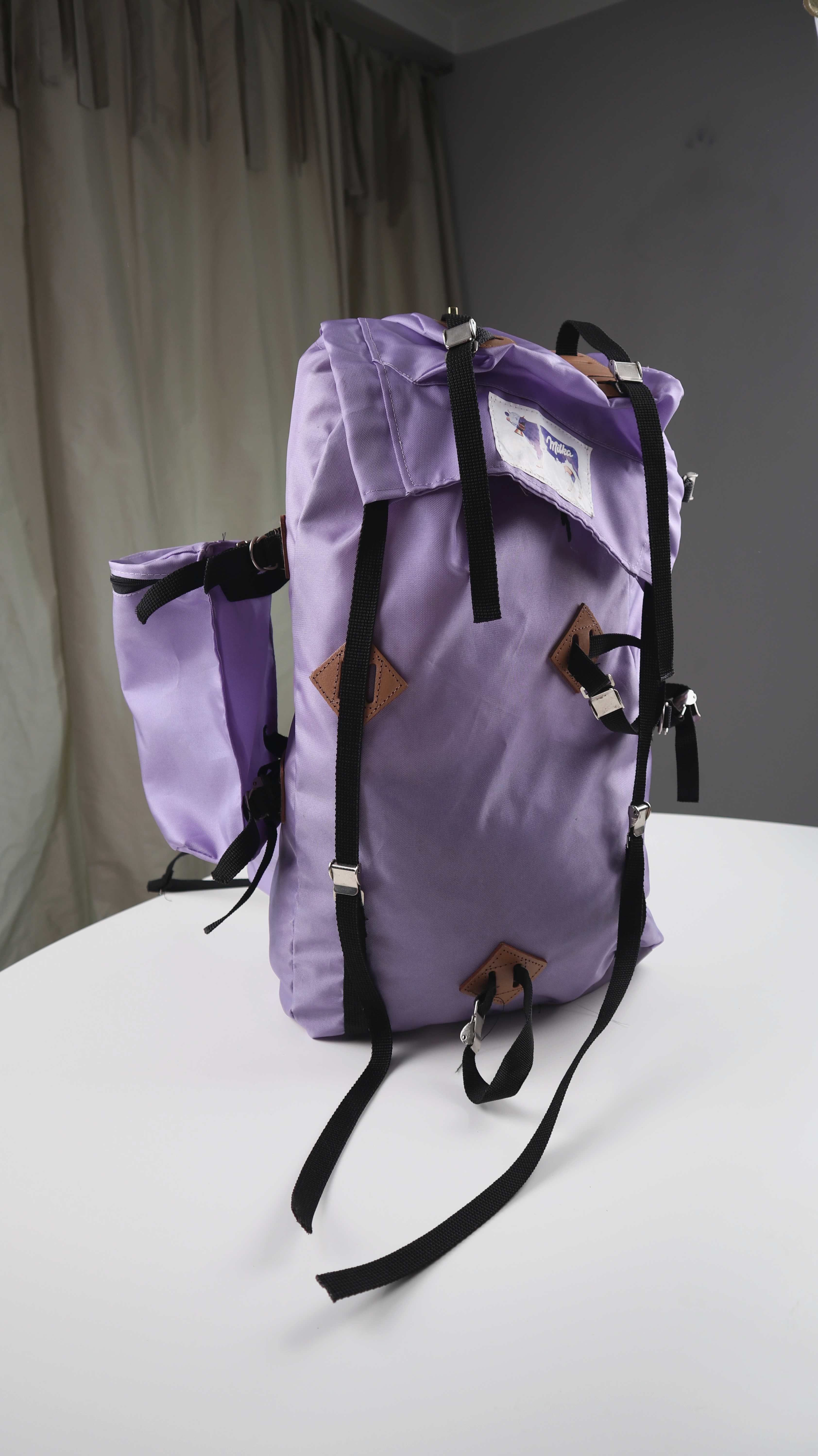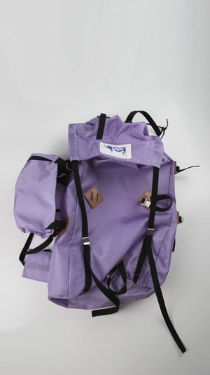 Wanderrucksack von Milka in Lila mit einer Seitentasche. Er ist Vintage und hat eine leichte Schulterpolsterung. Plus Versand