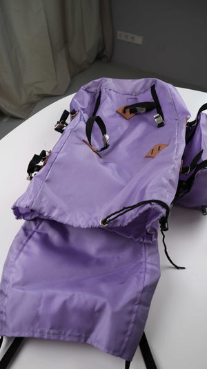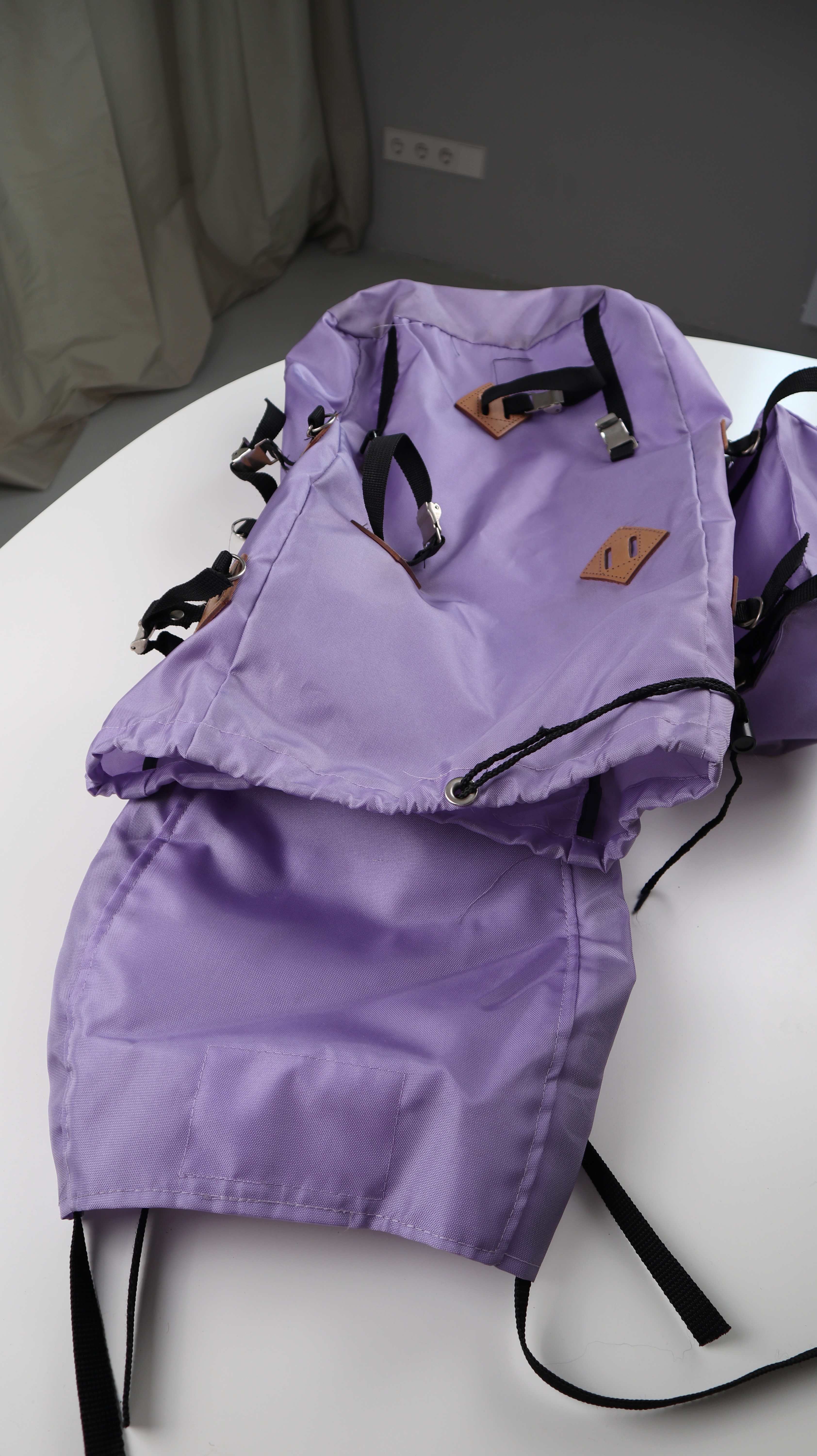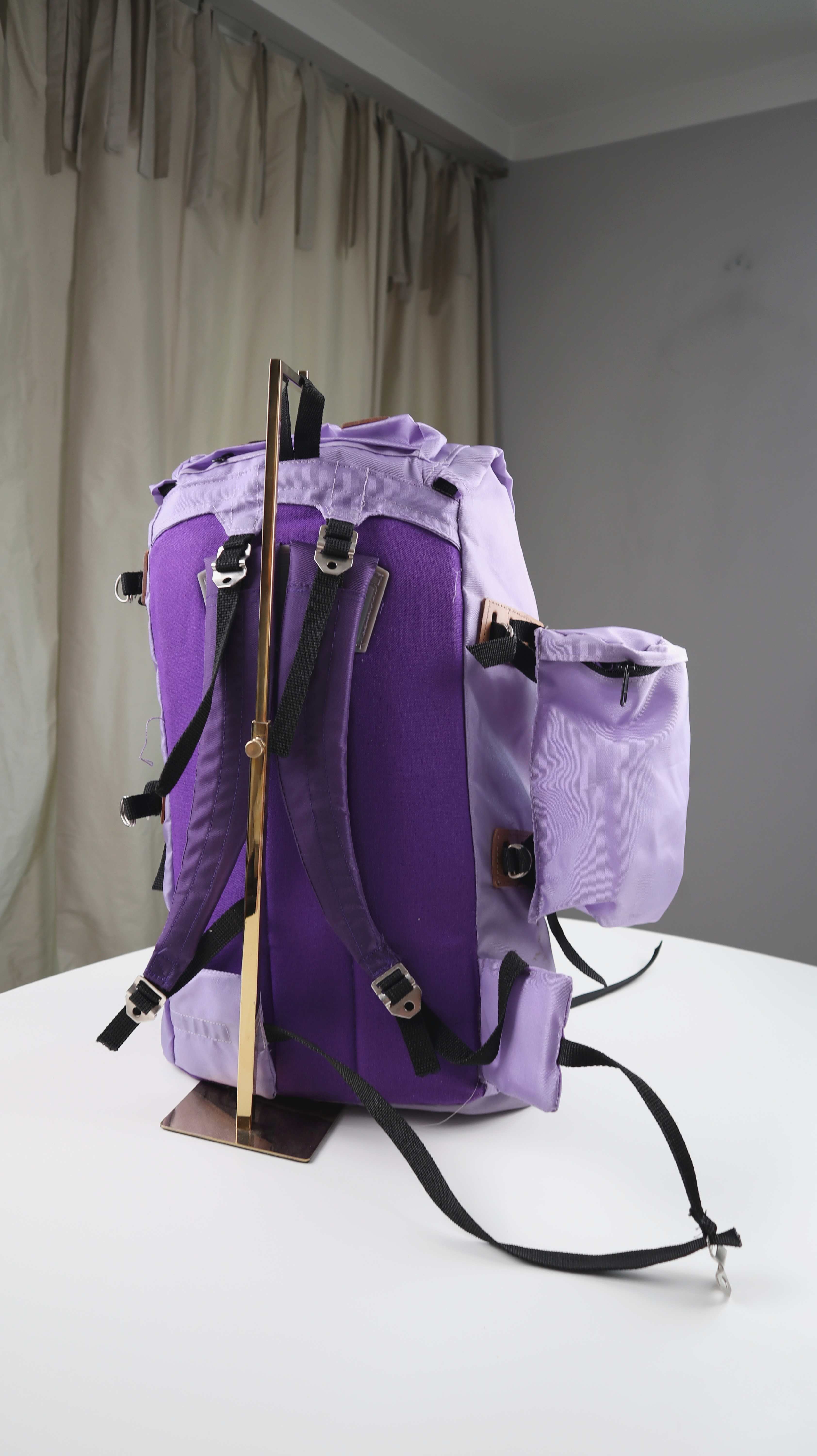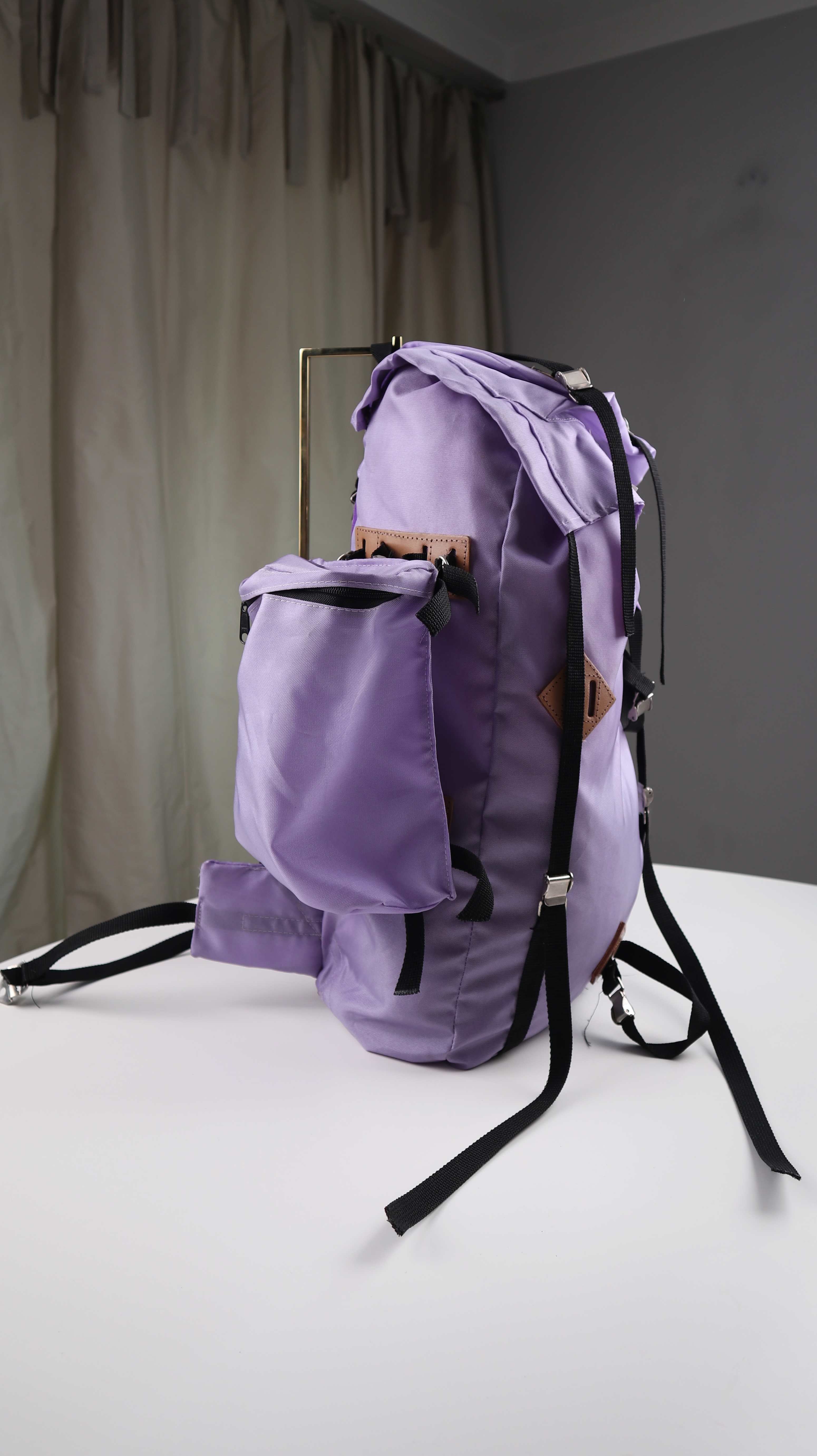 Wanderrucksack von Milka in Lila mit einer Seitentasche. Er ist Vintage und hat eine leichte Schulterpolsterung. Plus Versand