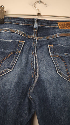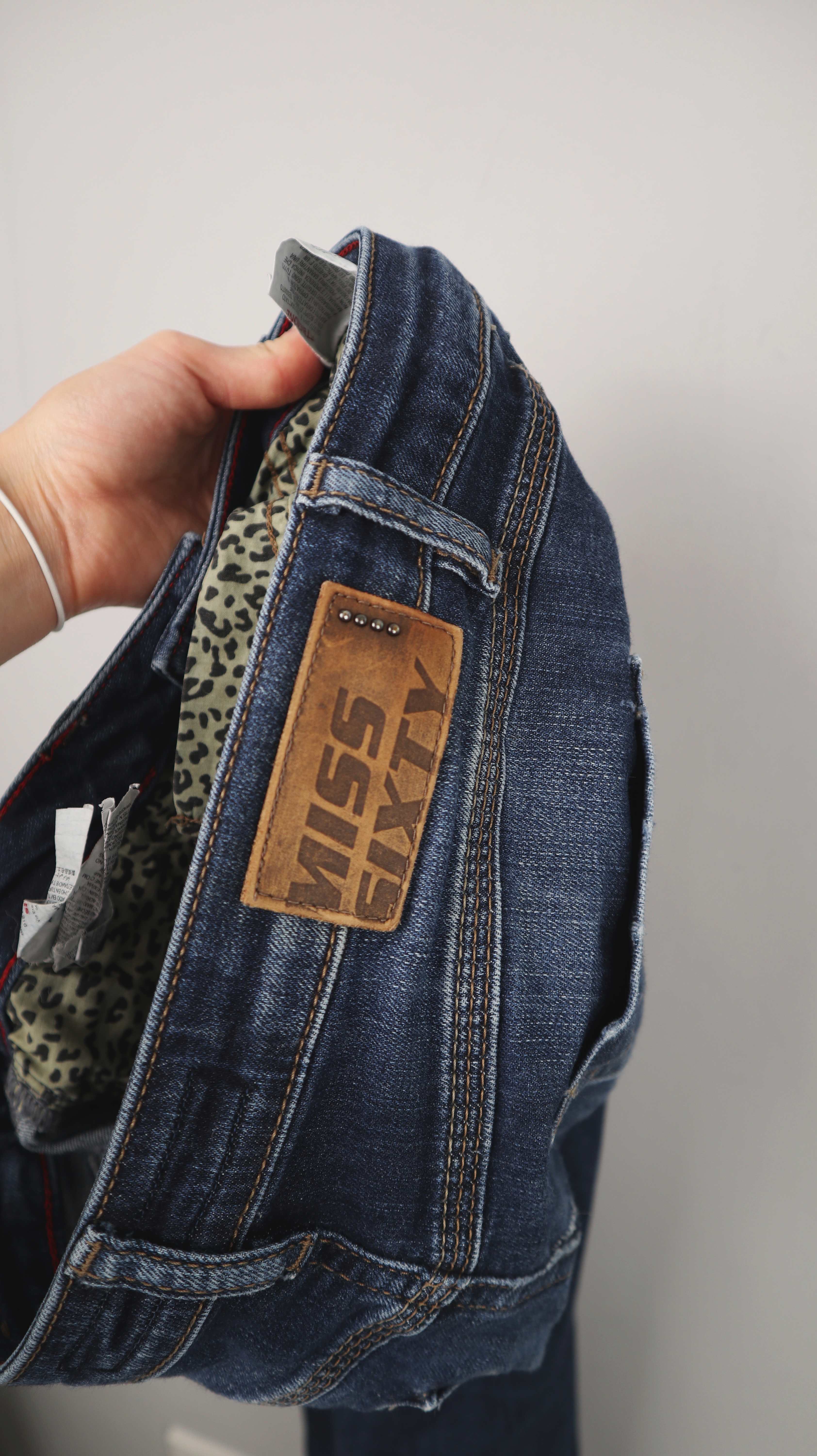 Dunkelblaue Jeans in einer 27 von Miss Sixty. Hinten am Po hat die eine leicht gerissene Naht. 38 cm Bundweite, 17 cm Schritthöhe und 76 cm Innenbeinlänge. Plus Versand