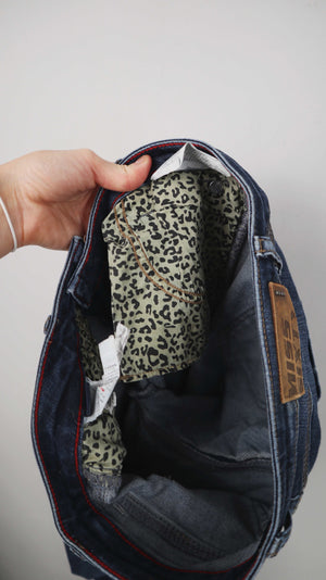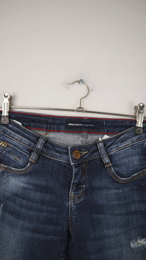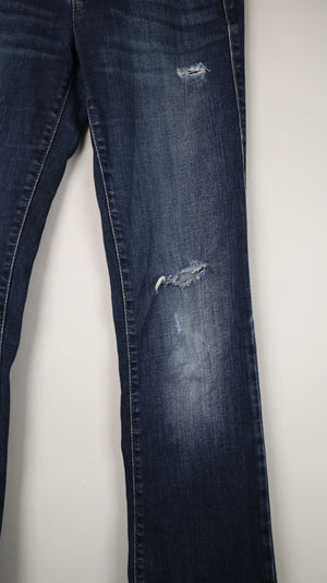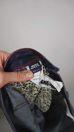 Dunkelblaue Jeans in einer 27 von Miss Sixty. Hinten am Po hat die eine leicht gerissene Naht. 38 cm Bundweite, 17 cm Schritthöhe und 76 cm Innenbeinlänge. Plus Versand