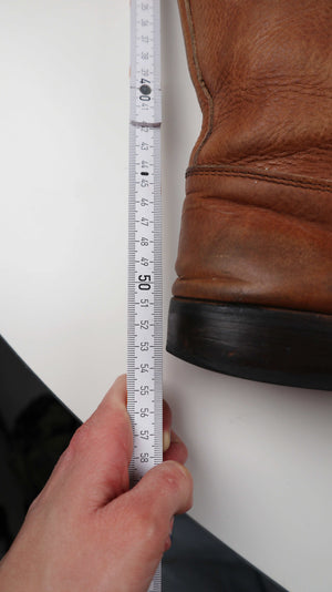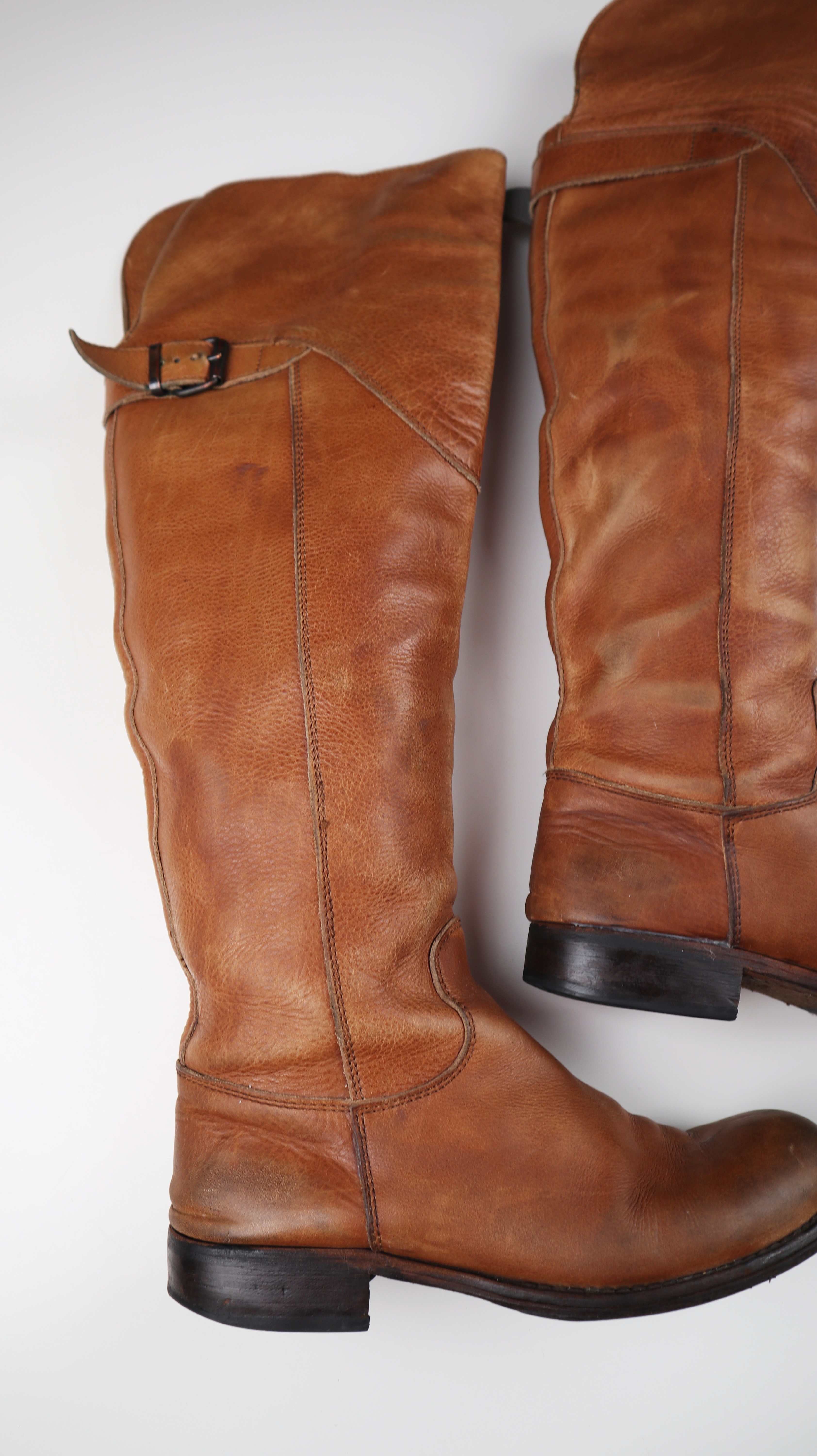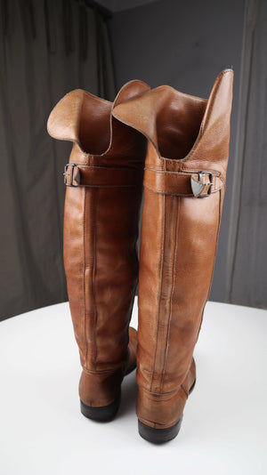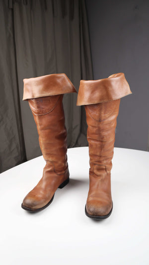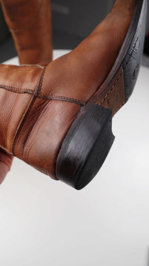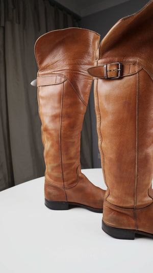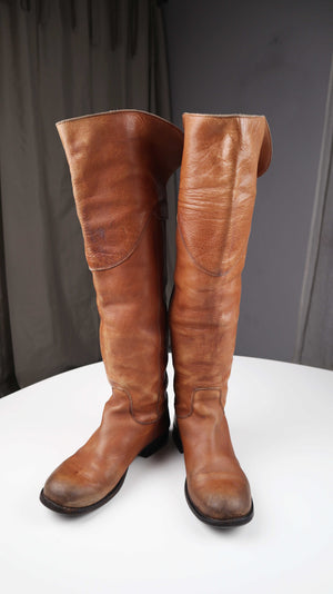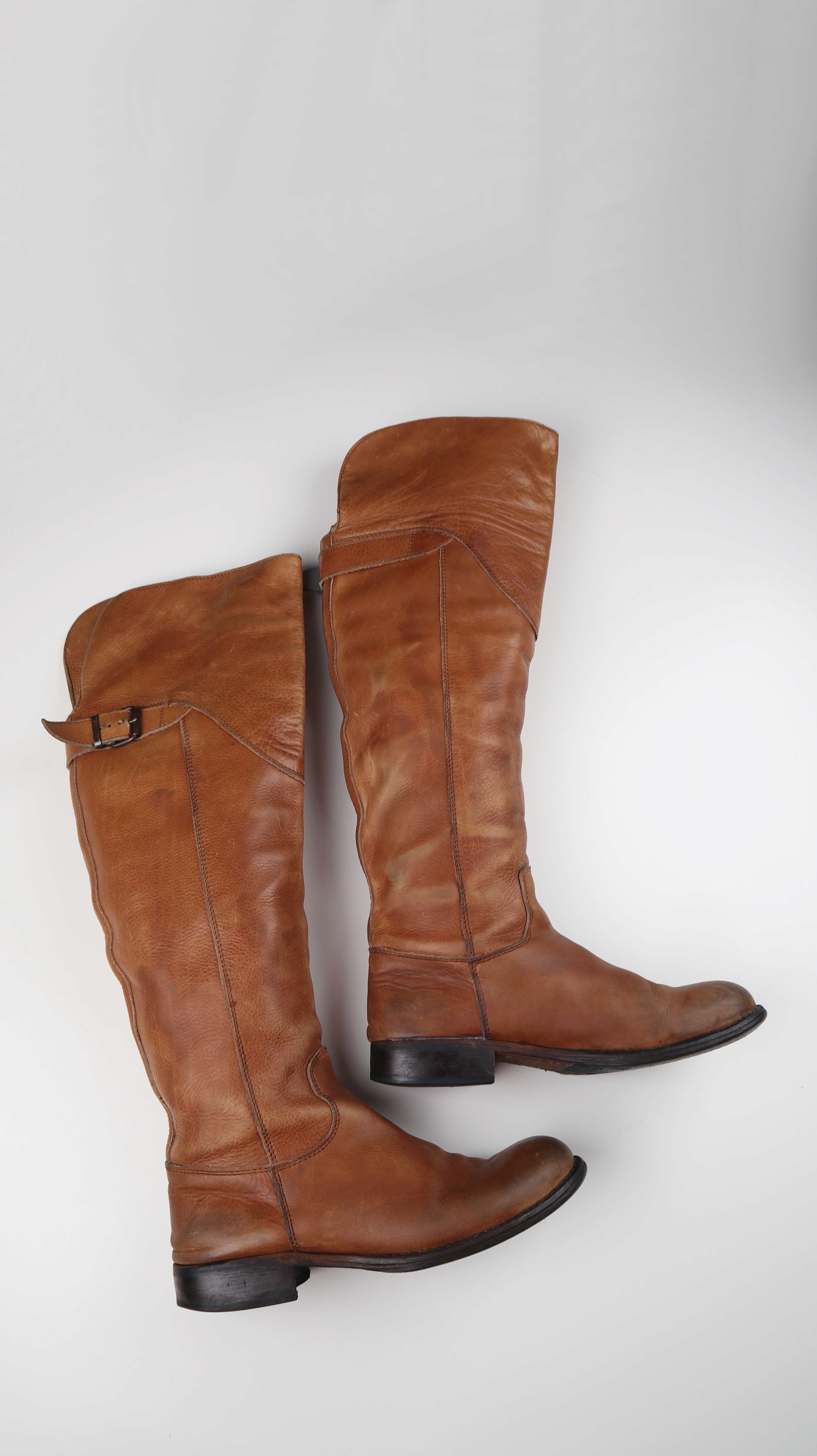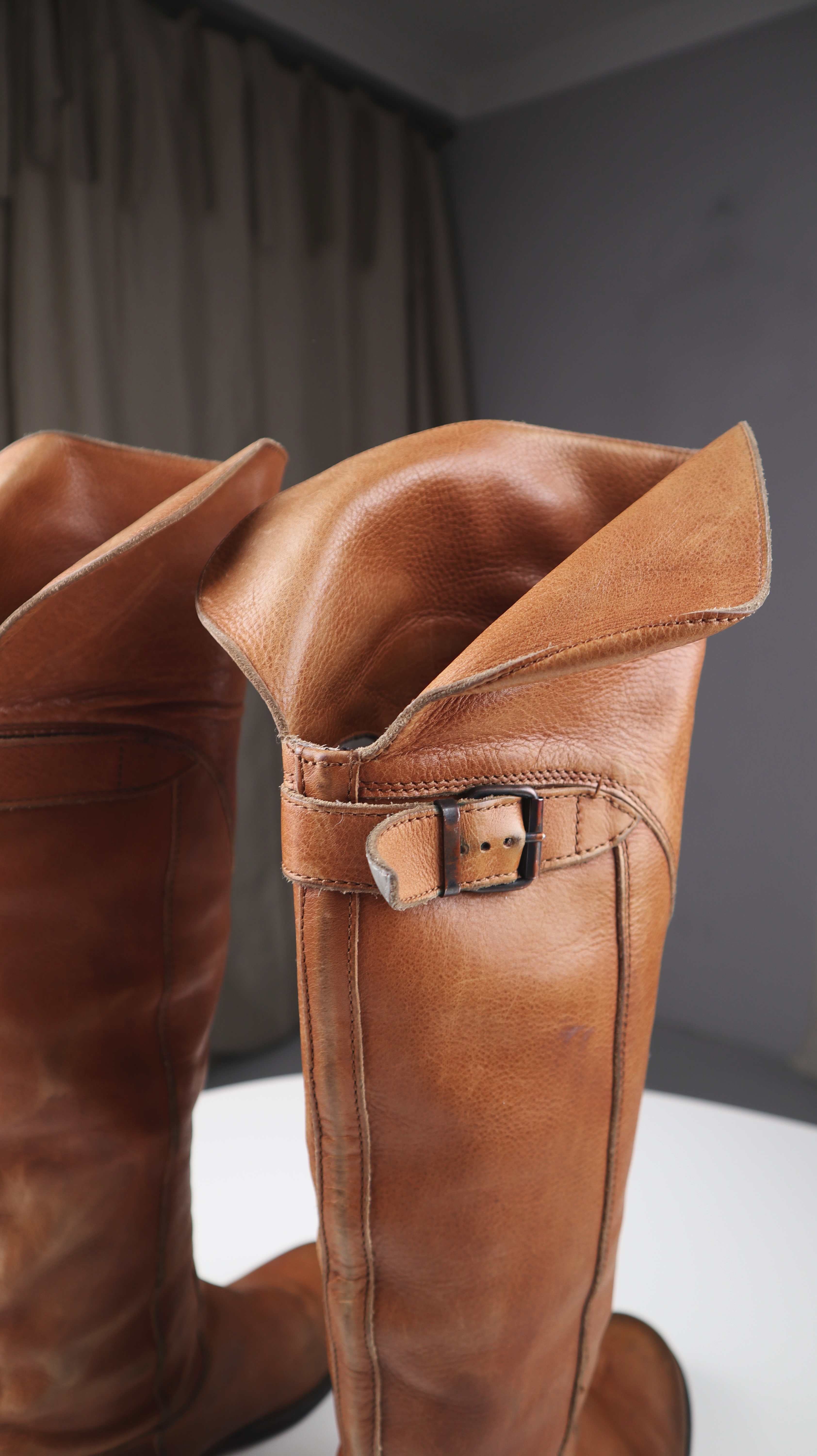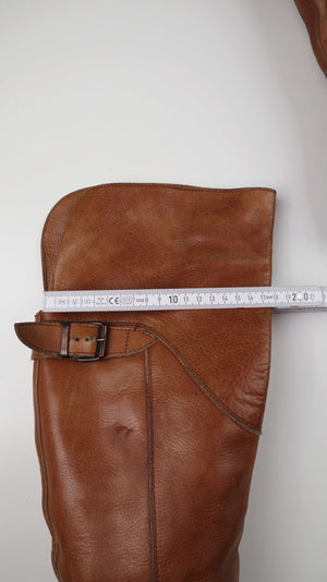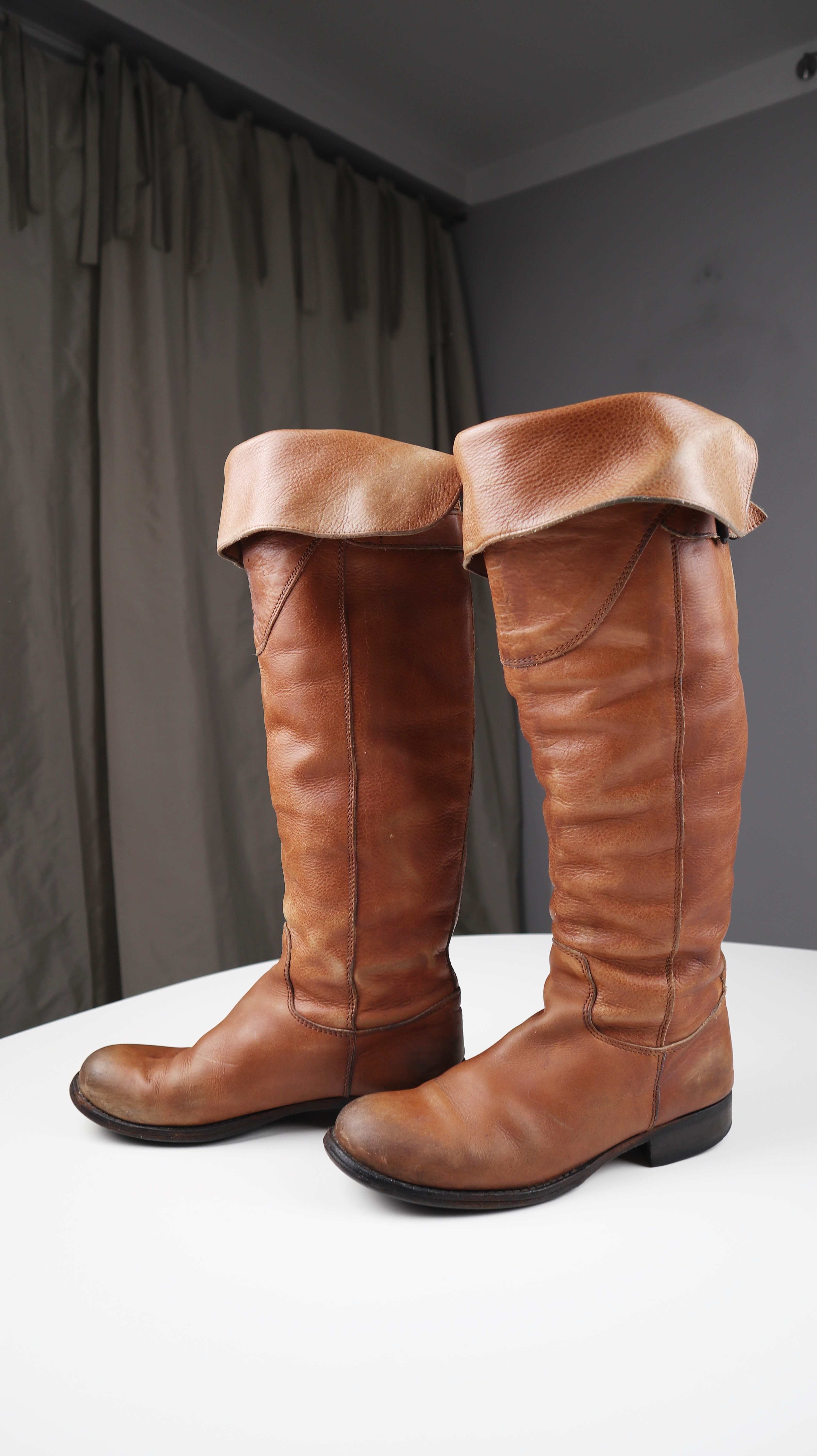 Lange Lederstiefel der italienischen Marke MoMa in 39. Sie sind oben zum Krempeln oder gehen alternativ über die Knie. Sie sind sehr robust und normal getragen. Plus Versand