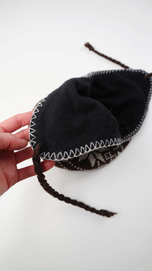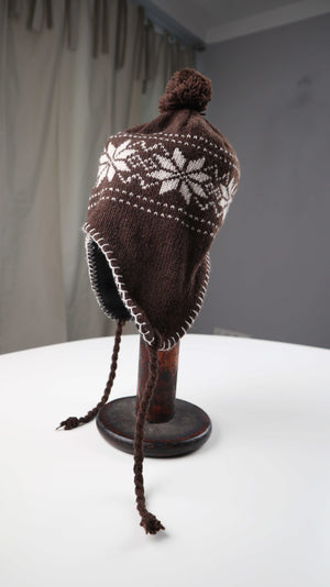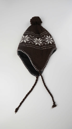 Braune Inkamütze mit Norwegermuster in braun weiß aus Wolle, innen Fleece. Plus Versand
