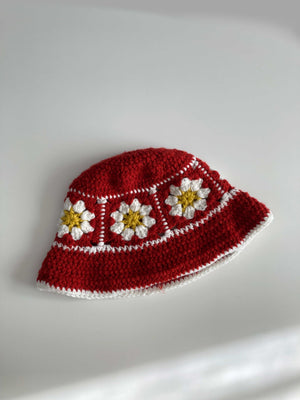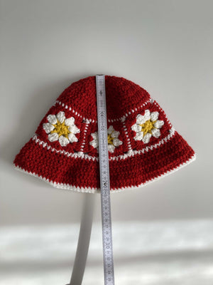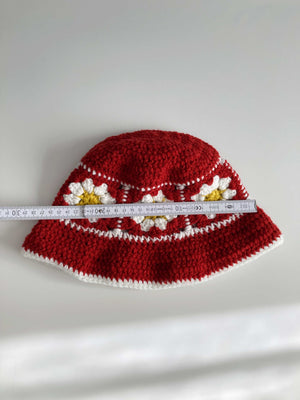 Mütze Kappe Häkelmütze Beanie Bucket hat rot Gänseblümchen Hippie Retro