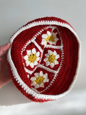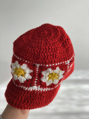 Rote Häkelmütze mit kleinen Gänseblümchen. Plus Versand