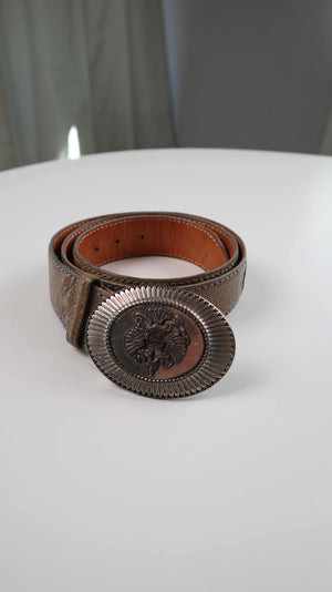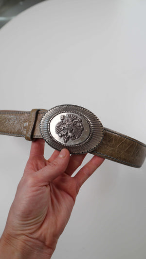 Ledergürtel mit einer großen Schnalle in silber. Er ist etwa 110 cm lang plus Schnalle. Plus Versand