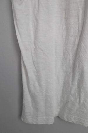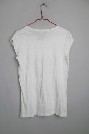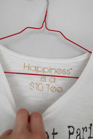Weißes Shirt von "Happiness is a 10 Dollar Tee" mit Print. Es passt einer 40 L. 44 cm Achselweite und 60 cm Länge. Plus Versand