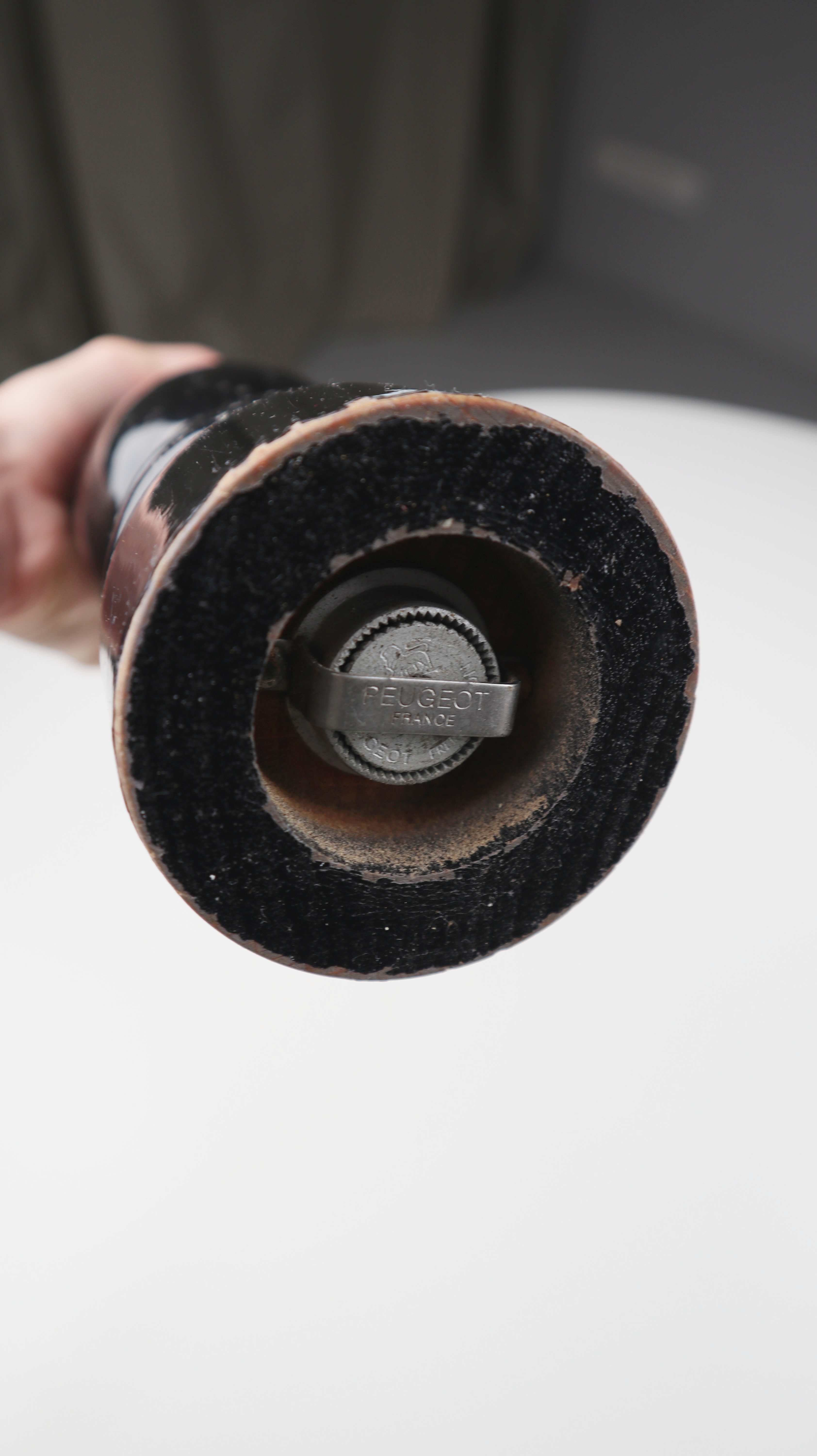 Großer, langer Pfefferstreuer bzw. Mühle mit Gebrauchsspuren an den Kanten und oben von Peugeot. Plus Versand
