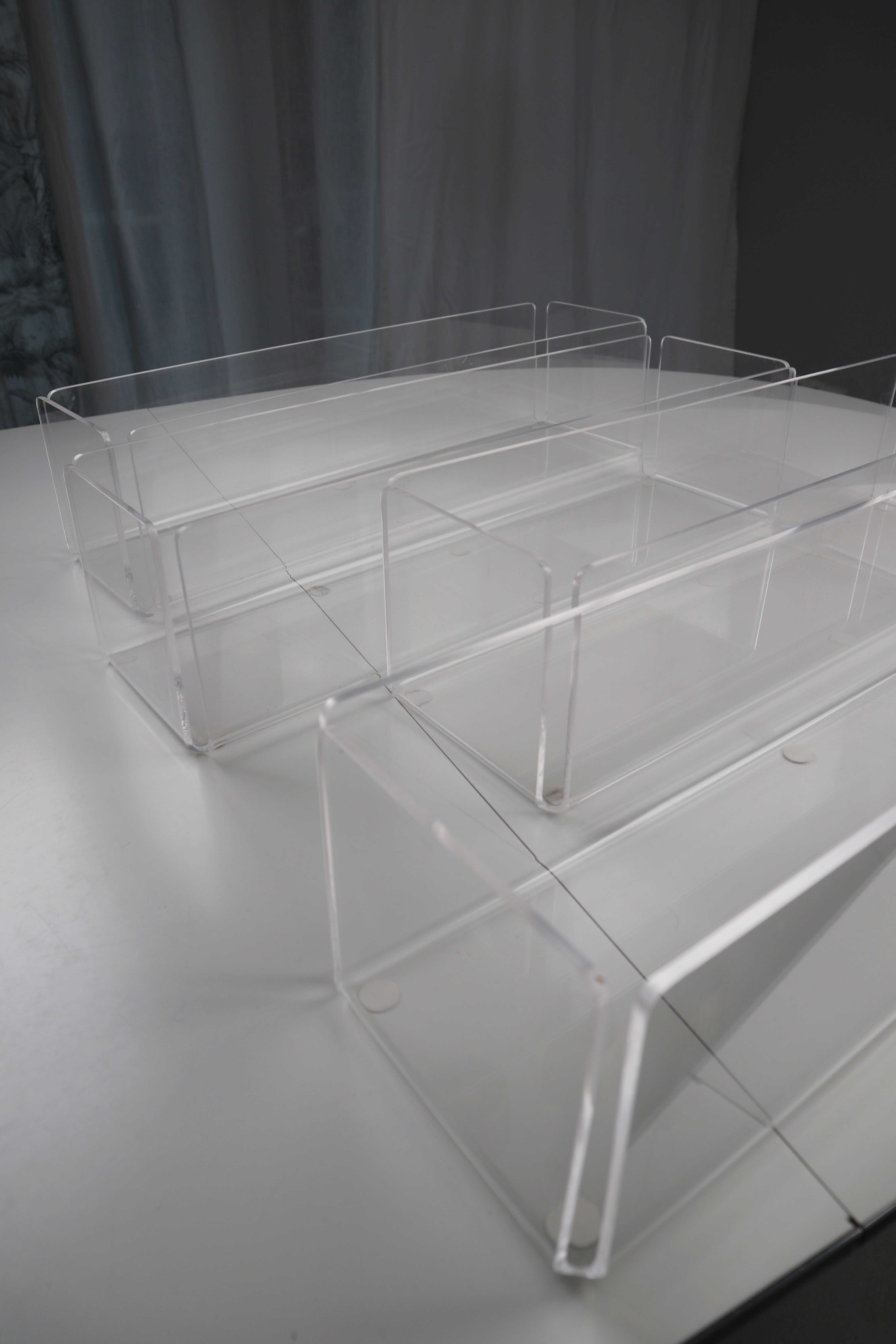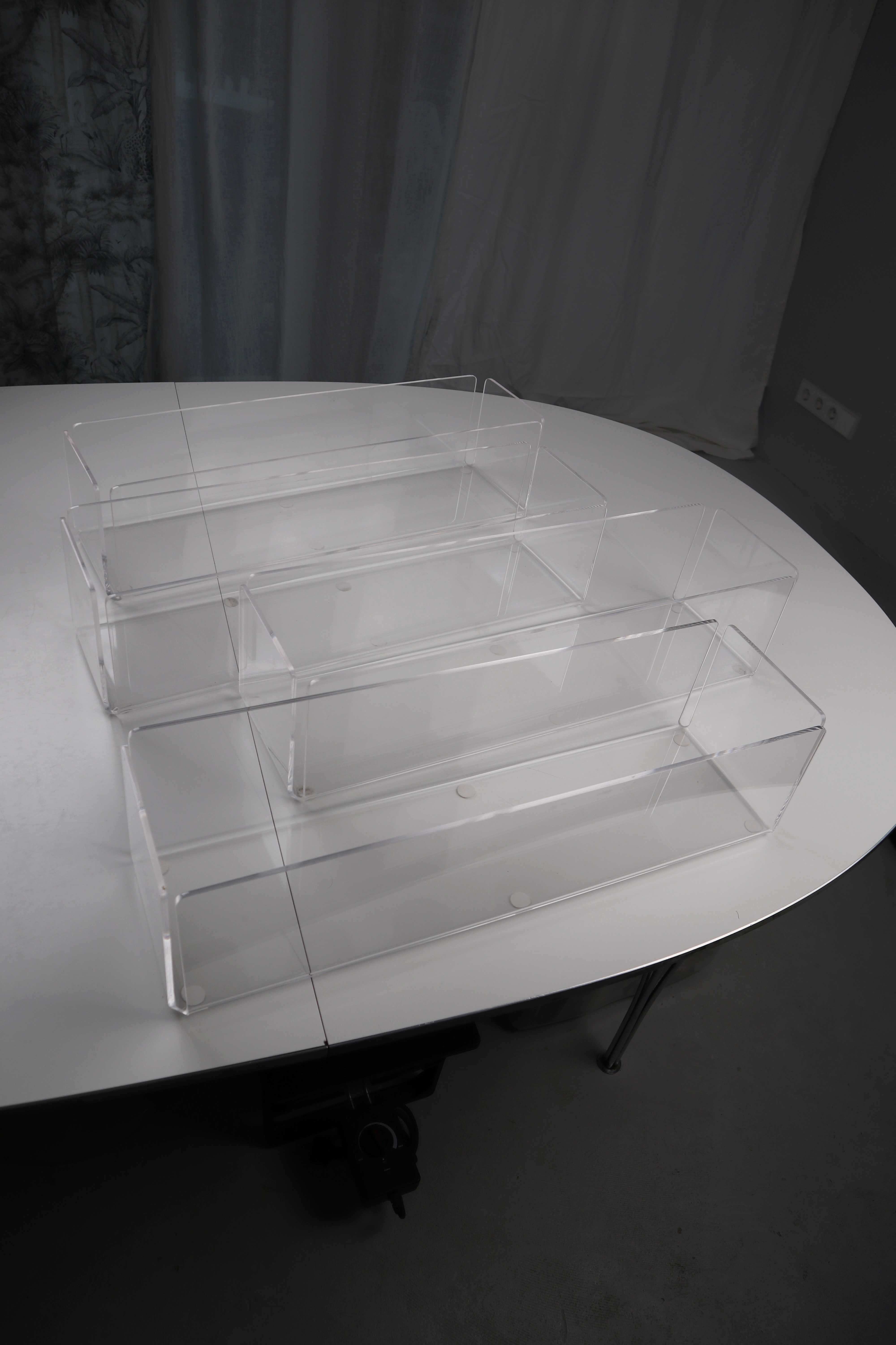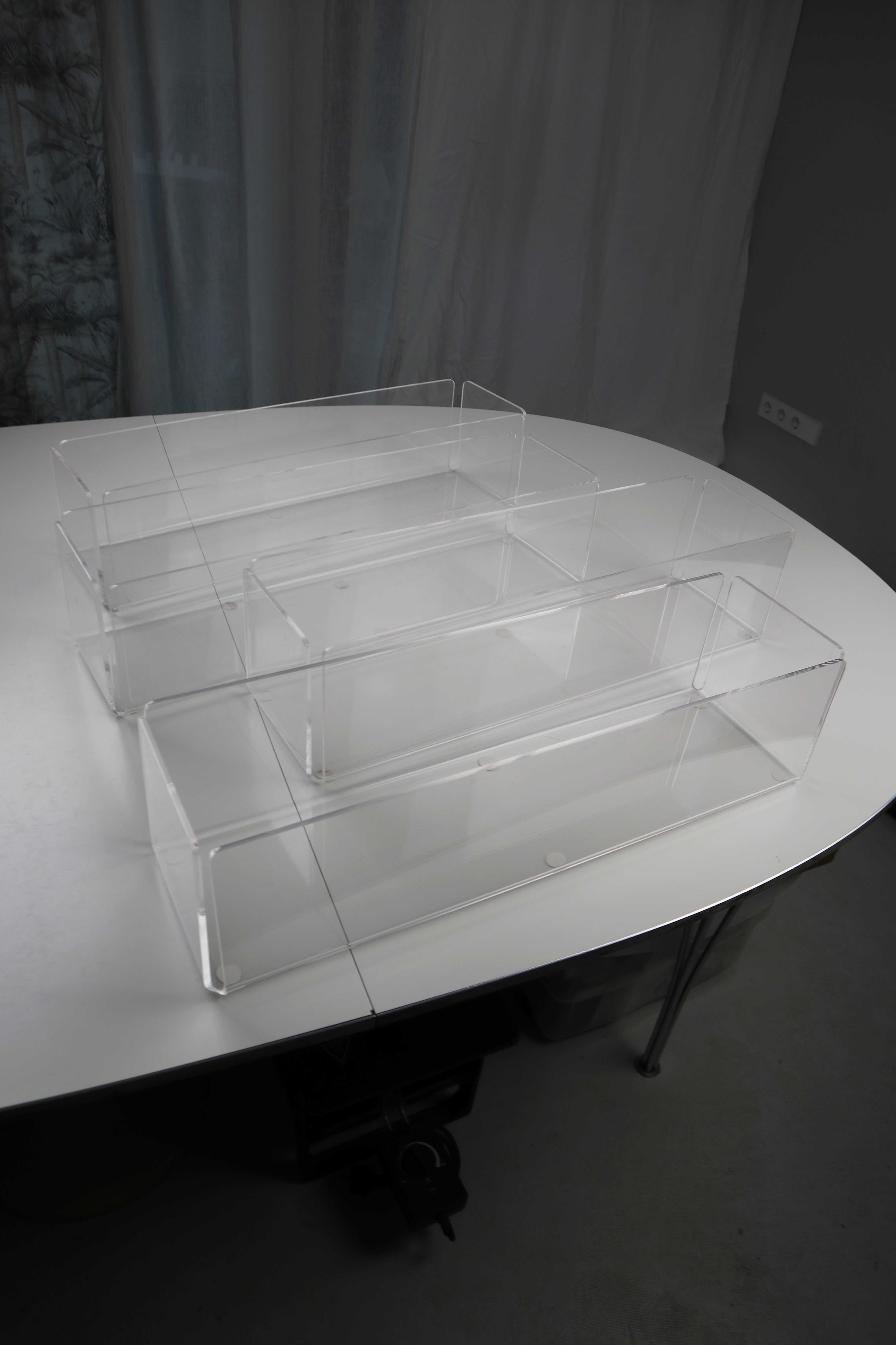 Set aus vier identischen Plexiglaskästen, die als Regale an die Wand montiert werden können. Man kann sie auch zusammensetzen und so eine geschlossene Form erzeugen. 16 cm Höhe und 14 cm Tiefe. 60 cm Breite. Plus Versand