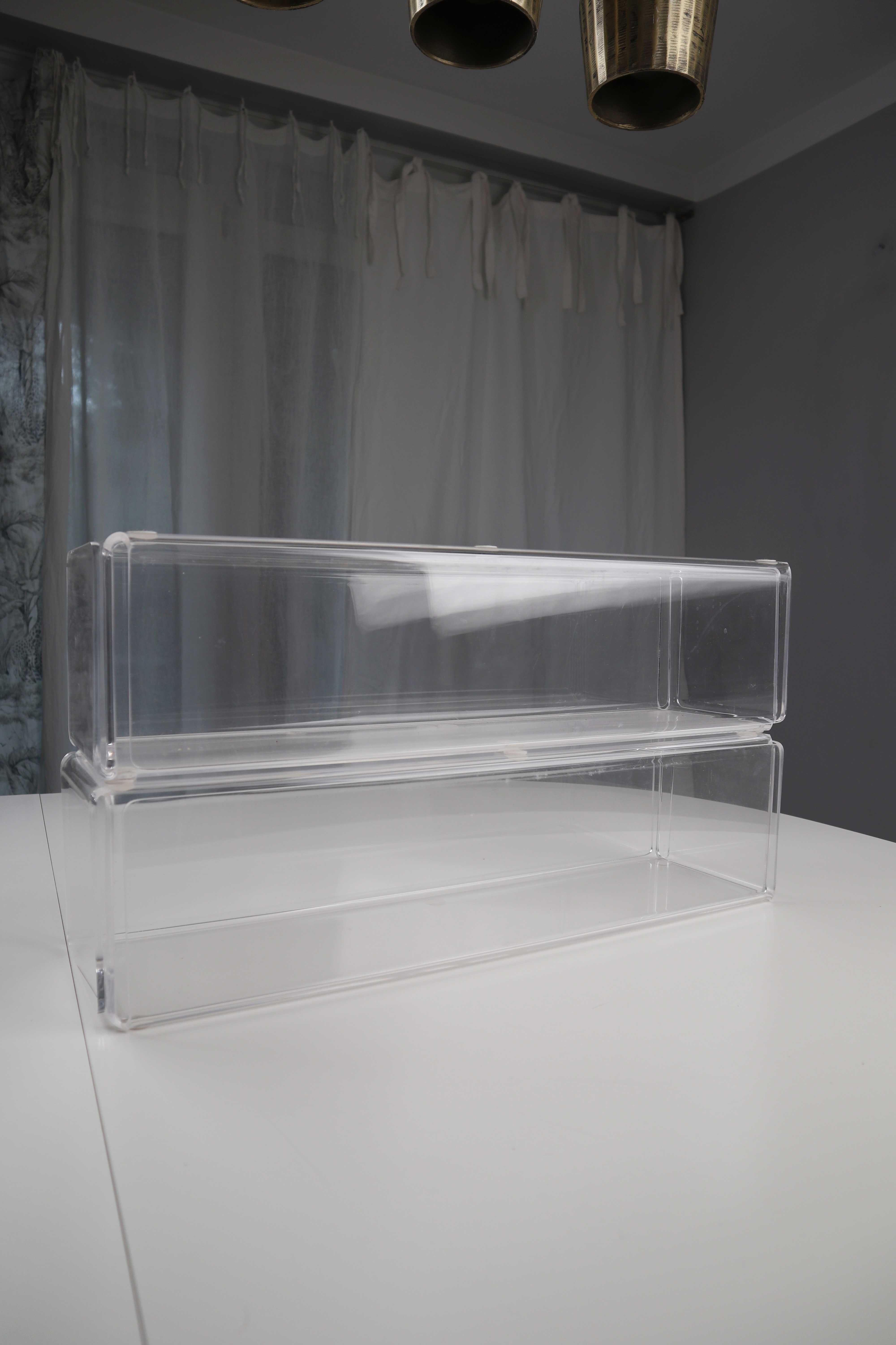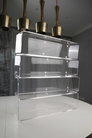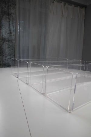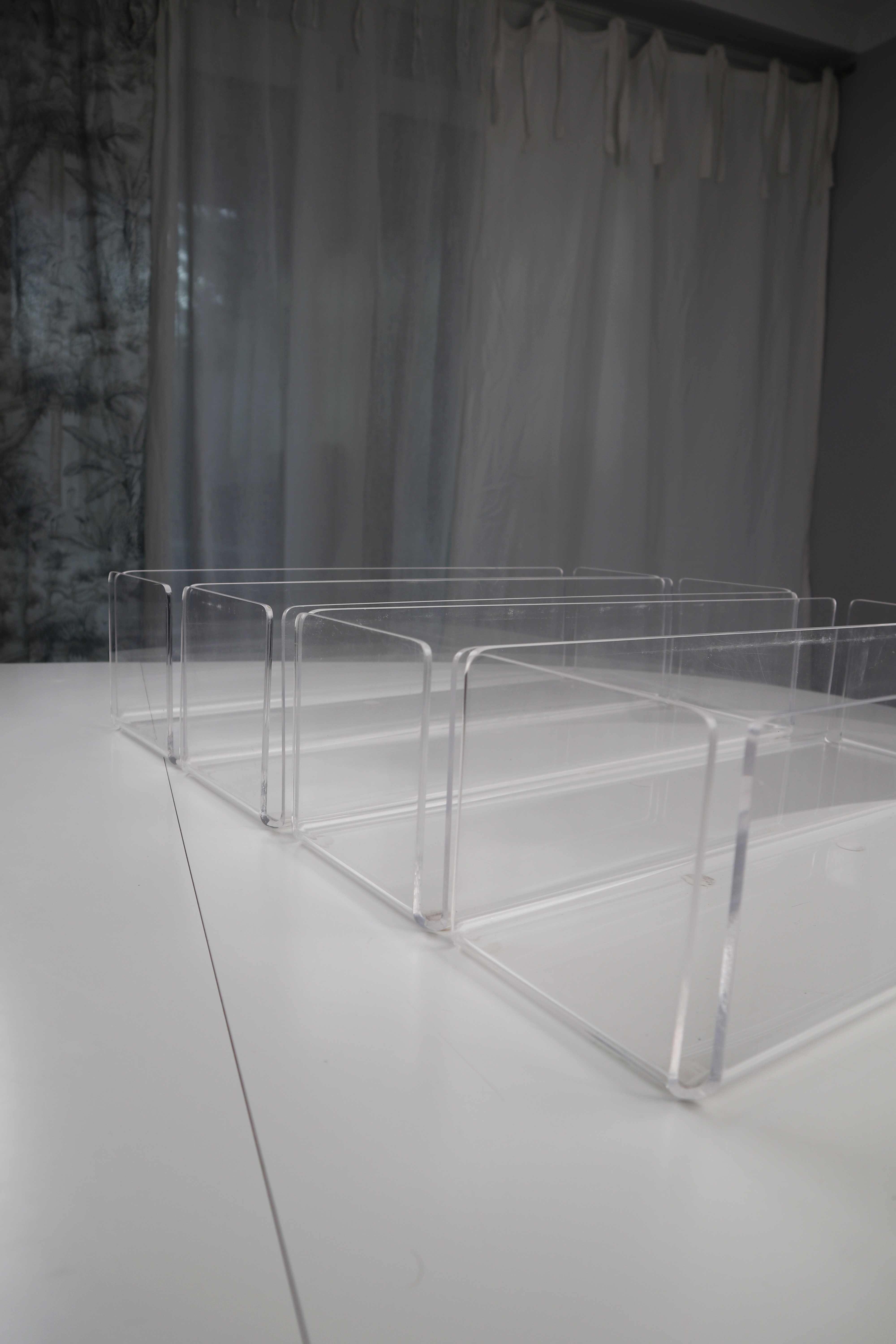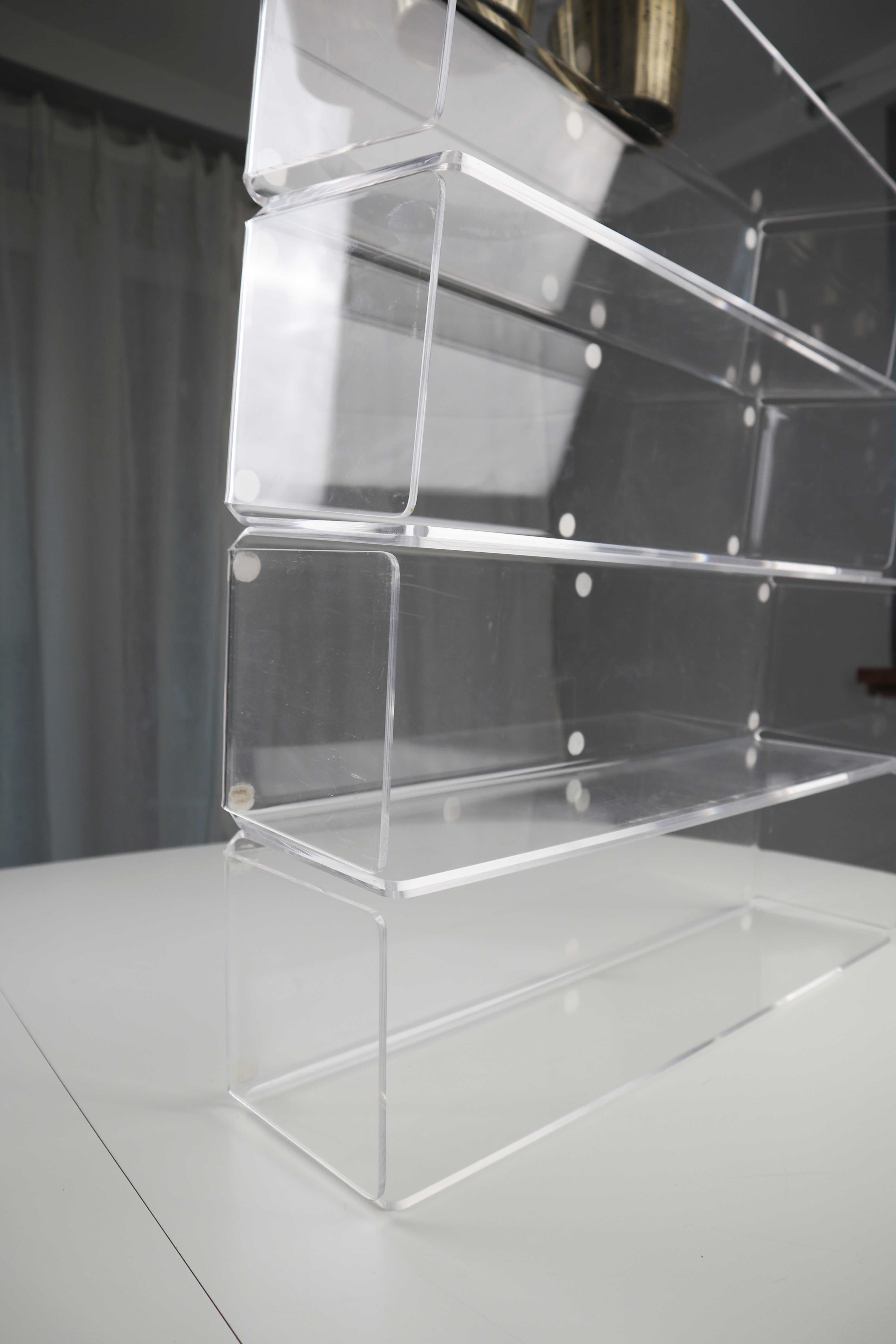 Set aus vier identischen Plexiglaskästen, die als Regale an die Wand montiert werden können. Man kann sie auch zusammensetzen und so eine geschlossene Form erzeugen. 16 cm Höhe und 14 cm Tiefe. 60 cm Breite. Plus Versand