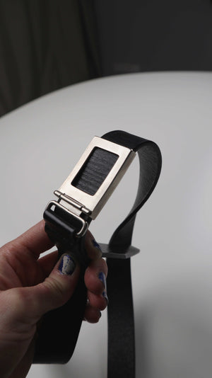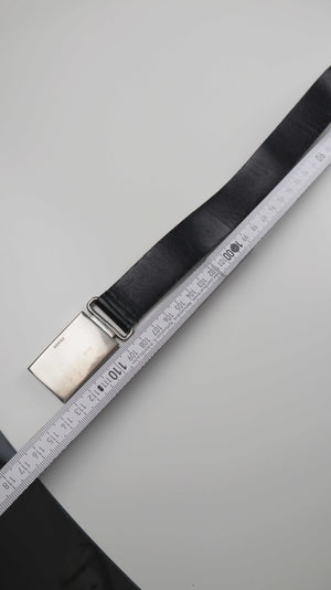 Schwarzer Ledergürtel von Prada mit silberner Schnalle. Länge 108 cm. Man kann ihn ohne Löcher in der Größe verstellen und durch das Umklappen der Hauptschnalle einklicken. Plus Versand