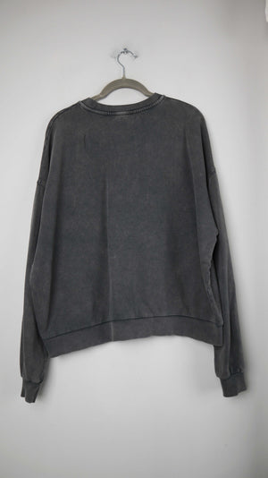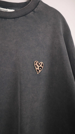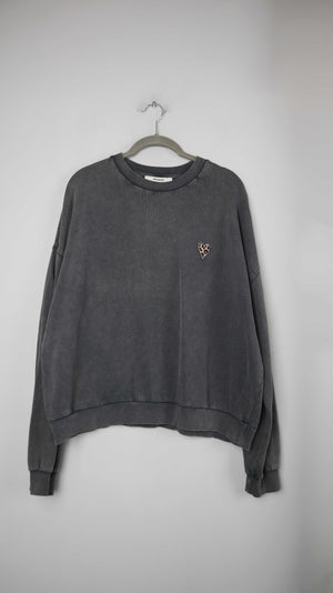 Grauer Sweater von Promod. Er passt einer 38 M und ist washed. Vorne ist ein Herz aus Leo drauf. 66 cm Achselweite und 57 cm Länge. Plus Versand