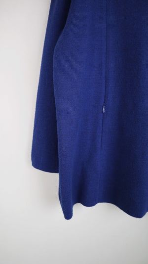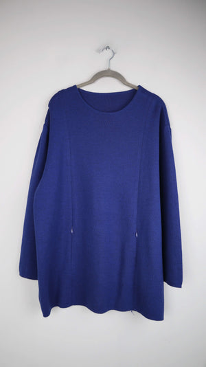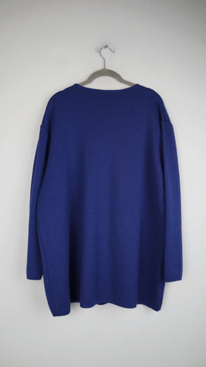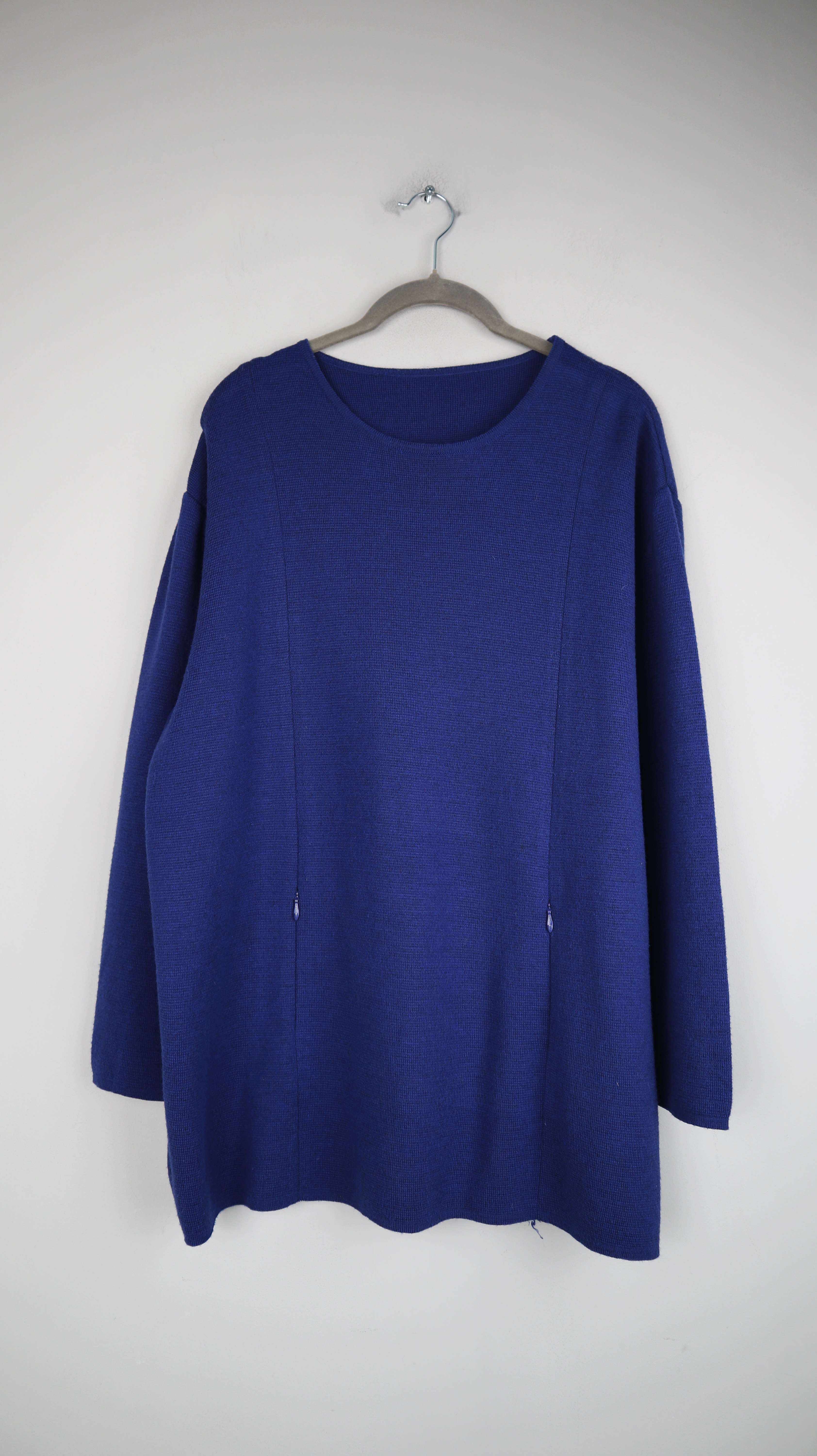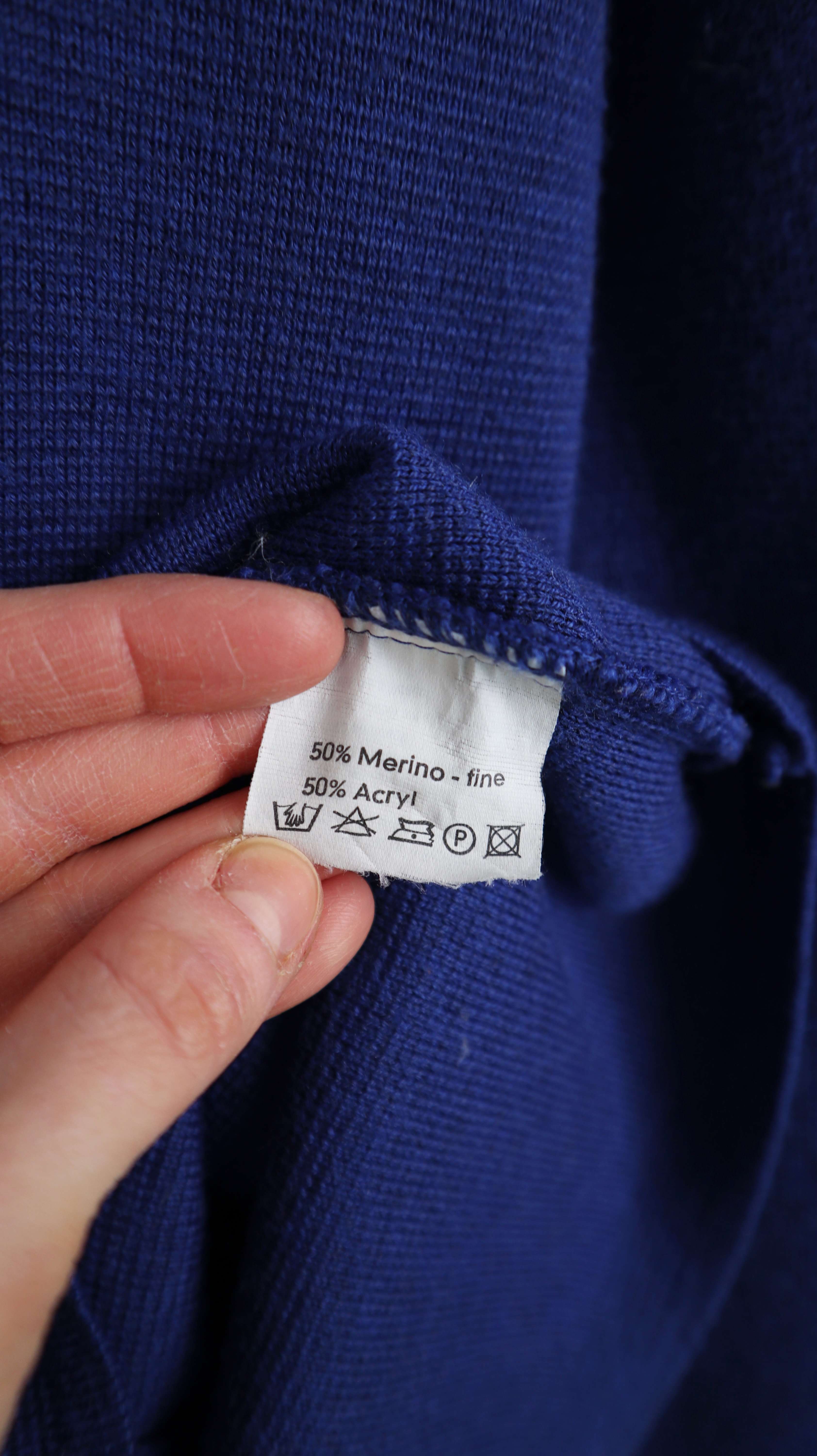 Dunkelblauer Strickpullover mit Merinowolle (50 Prozent). Er passt einer 40 L. 64 cm Achselweite und 70 cm Länge. Plus Versand
