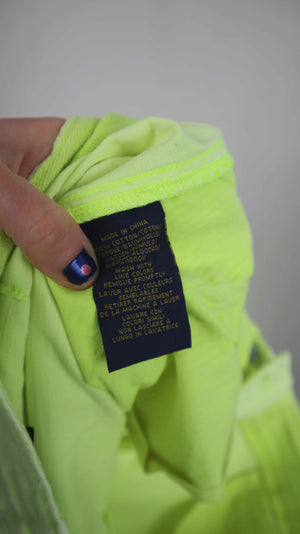 Neongelbe Hose von Ralph Lauren in einer 40 L. Sie ist in Größe 10 ausgeschildert und das Modell Quin Boyfriend Chino. 44 cm Bundweite, 27 cm Schritthöhe und 72 cm Innenbeinlänge. Plus Versand