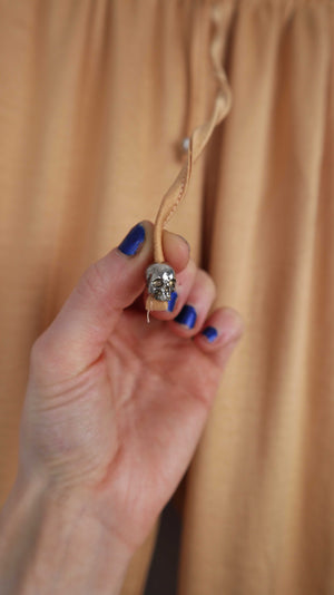 Stoffhose von Rapsoia. Sie passt einer 36 S, an den Bändern sind kleine Totenköpfe. 33 cm Bundweite, 25 cm Schritthöhe und 72 cm Innenbeinlänge. Plus Versand