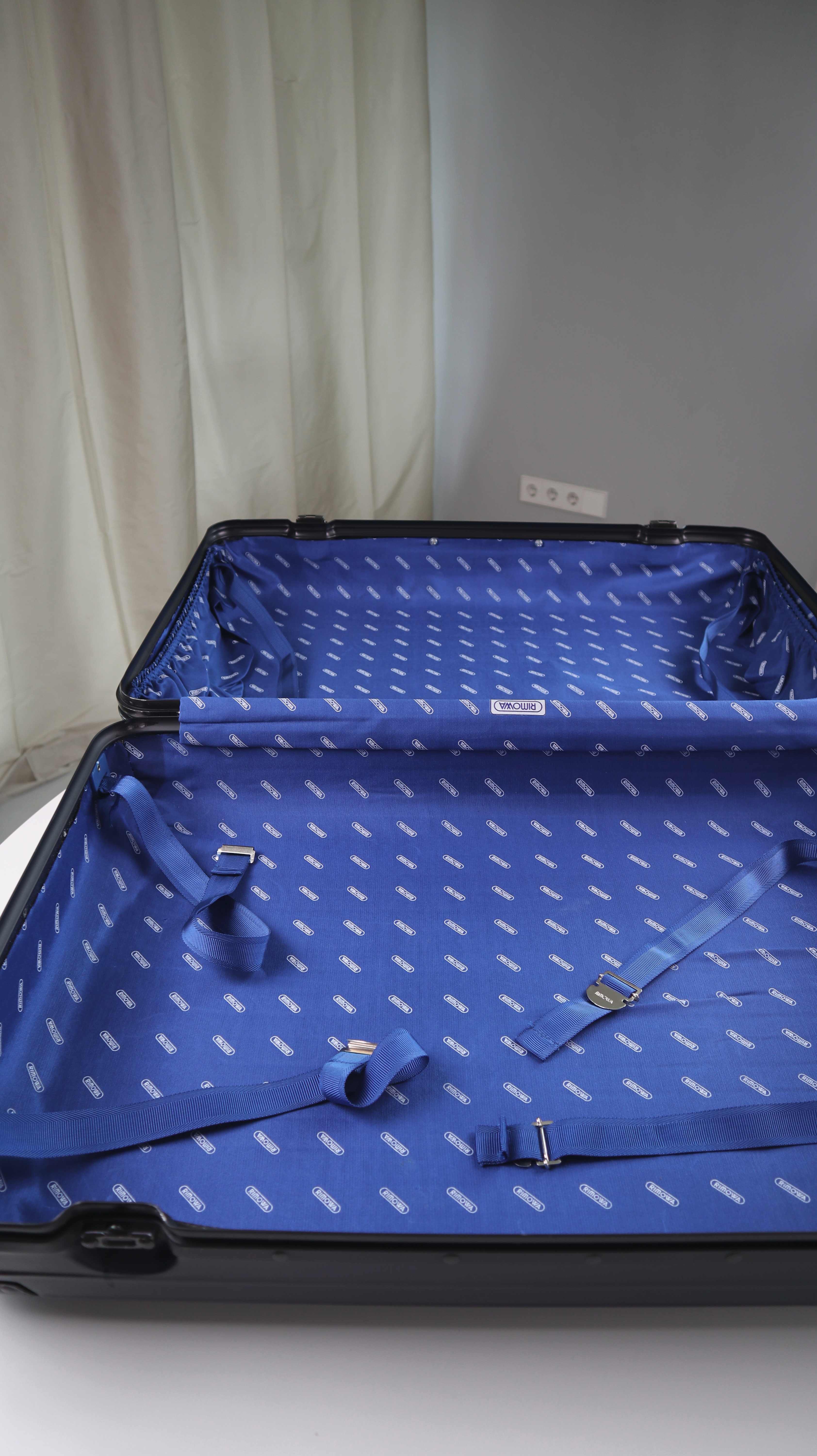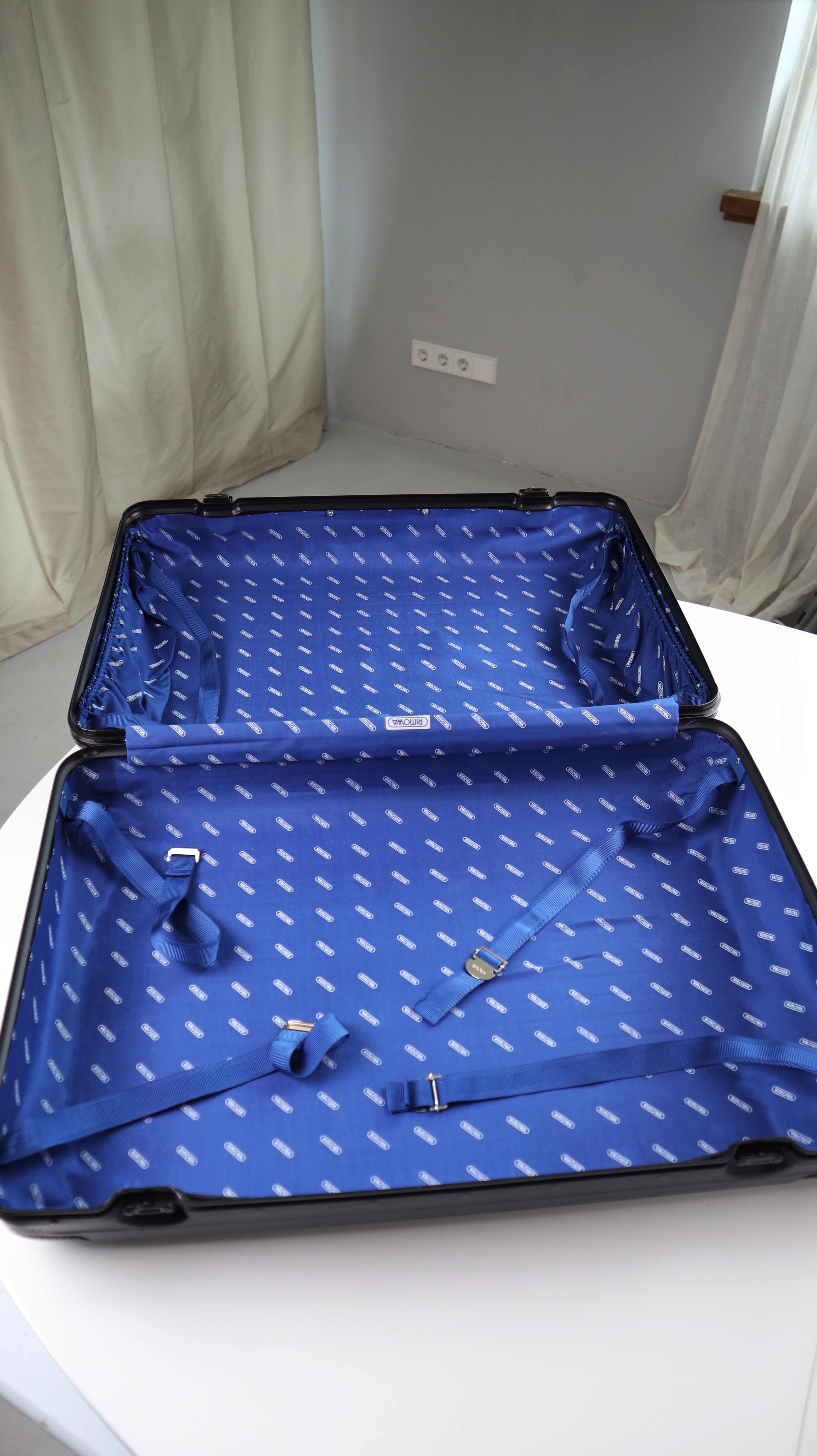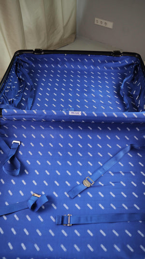 Dunkelblauer Koffer von Rimowa mit Stoff innen und Gurten. Der Schlüssel für außen ist nicht mehr vorhanden. Normale Gebrauchsspuren. 70cm x 47cm x 20cm (ohne Griff, etc.) Plus Versand