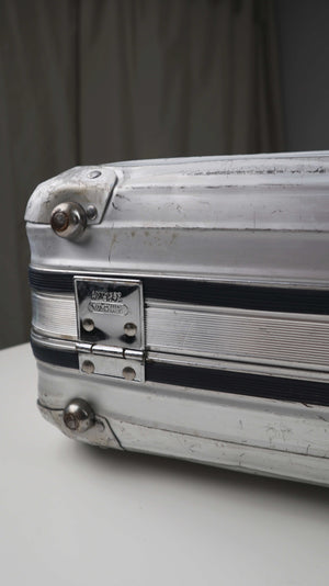 Vintage Hartschalenkoffer aus Aluminium. Die Schlüssel sind nicht mehr dabei, der Zahlencode (363) funktioniert jedoch. Innen ist Stoff und Bänder, er wurde viel genutzt. Plus Versand