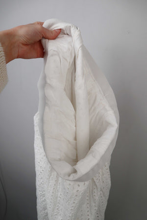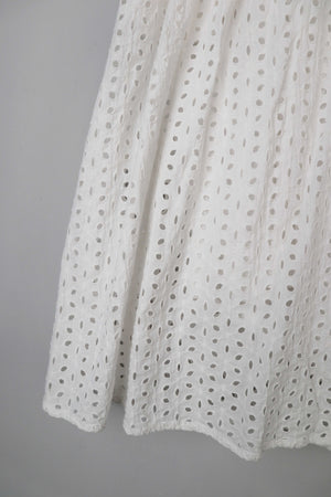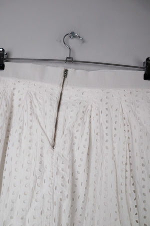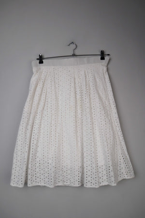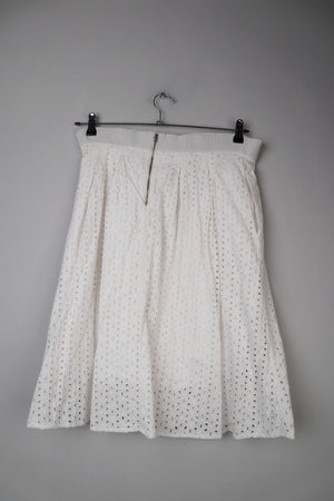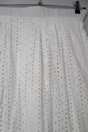 Weiß gelochter Baumwollrock für den Sommer. Ohne Marke, er passt einer 38 M. Das Gummiband ist nicht mehr ganz straff und er hat eine leichte Verfärbung vorne. 41 cm Bundweite und 63 cm Länge. Plus Versand