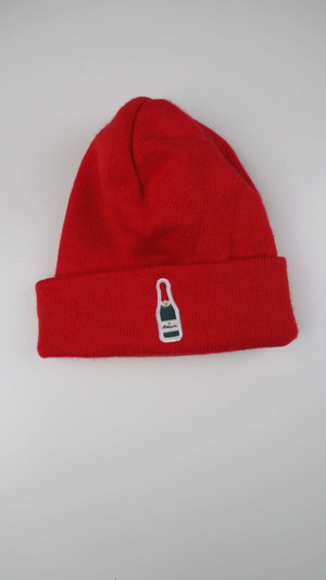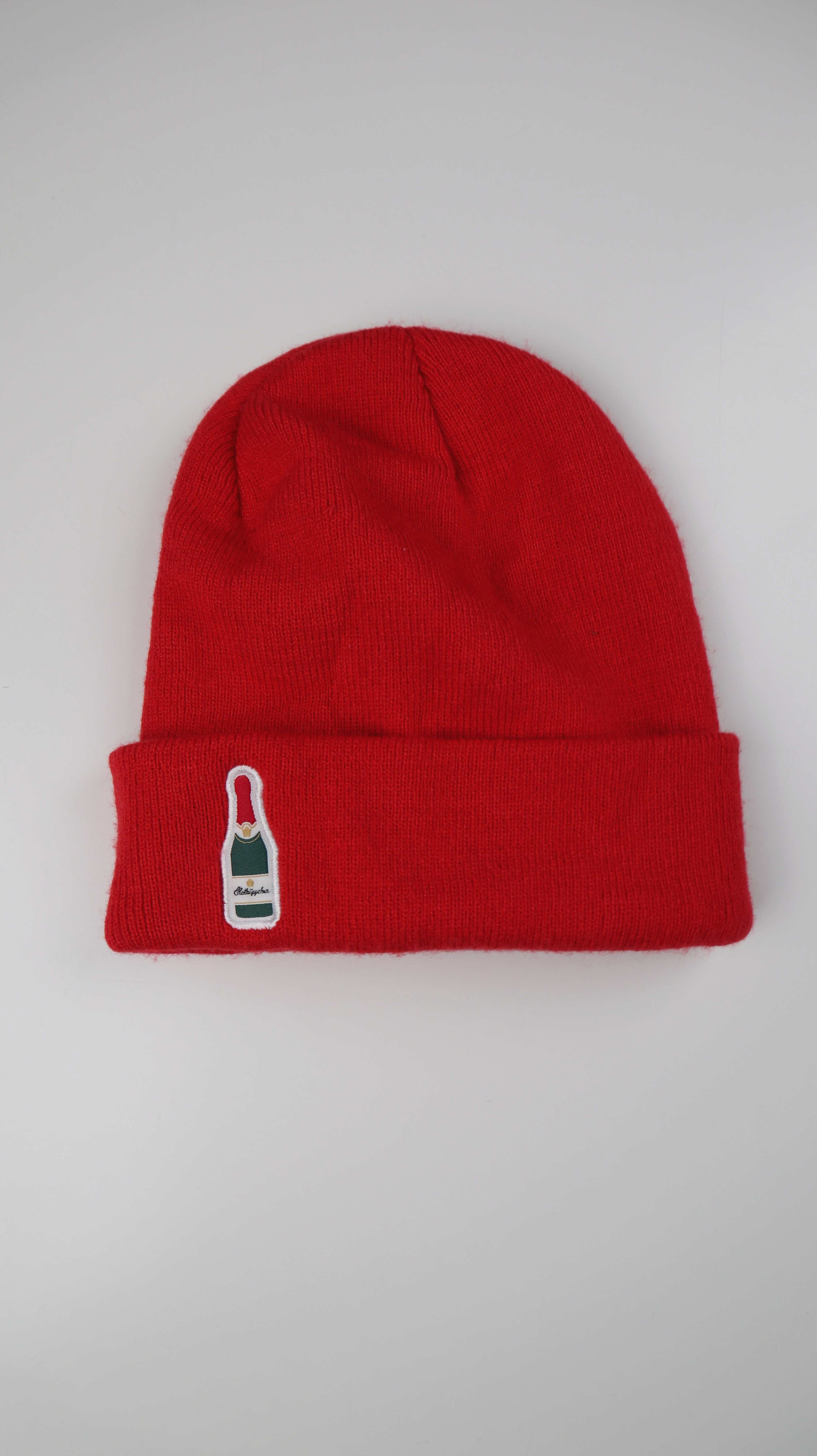 Basic rote Beanie von Rotkäppchen mit einer kleinen Sektflasche. Plus Versand