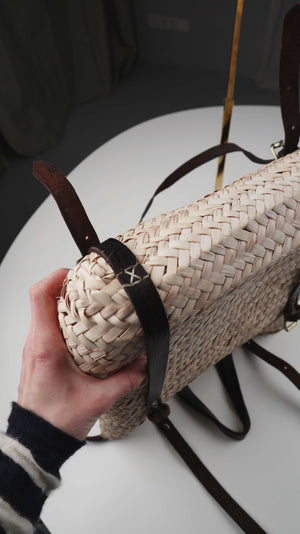 Neuwertiger Korbrucksack mit Lederriemen, den man auch als Tasche tragen kann. 34 x 34 cm. Plus Versand