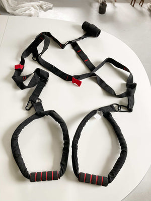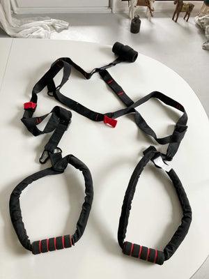Schwarze Schlingenbänder, die man an einer Deckenbefestigung oder einer Türstange montieren kann. Ideal, um auch Übungen auf dem Boden zu machen und die Beine durhczustecken oder um sich hochzuziehen. Plus Versand