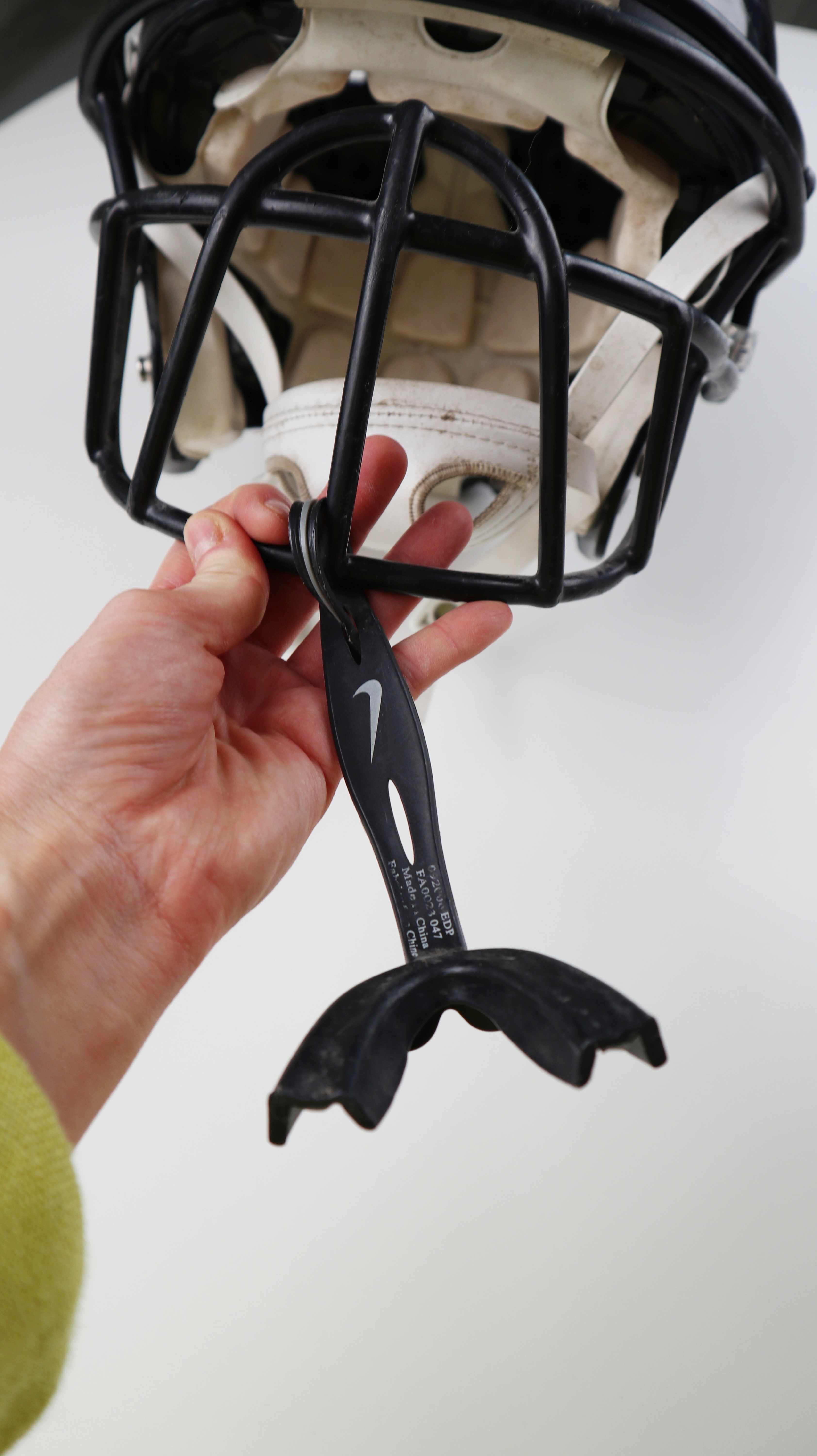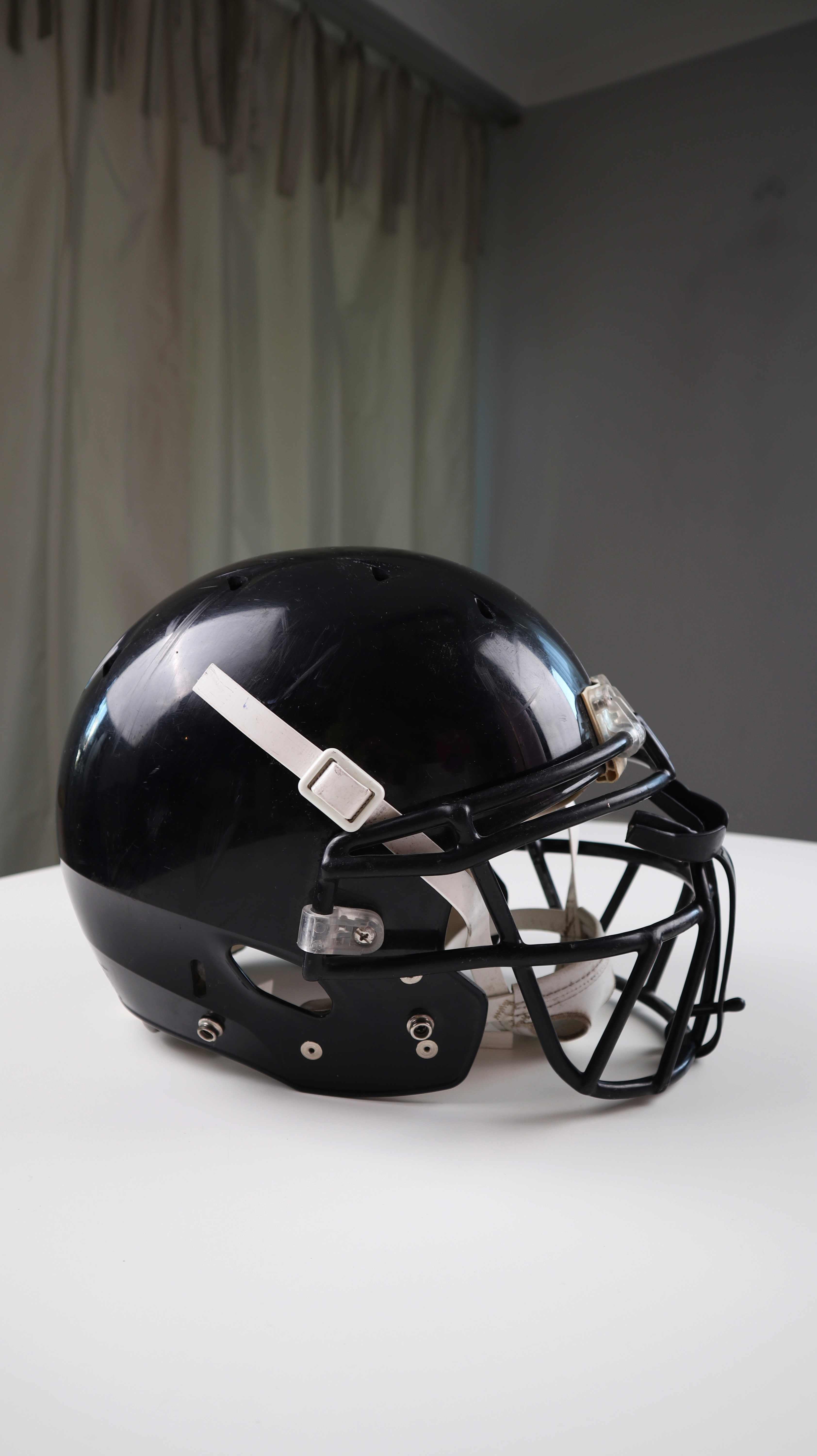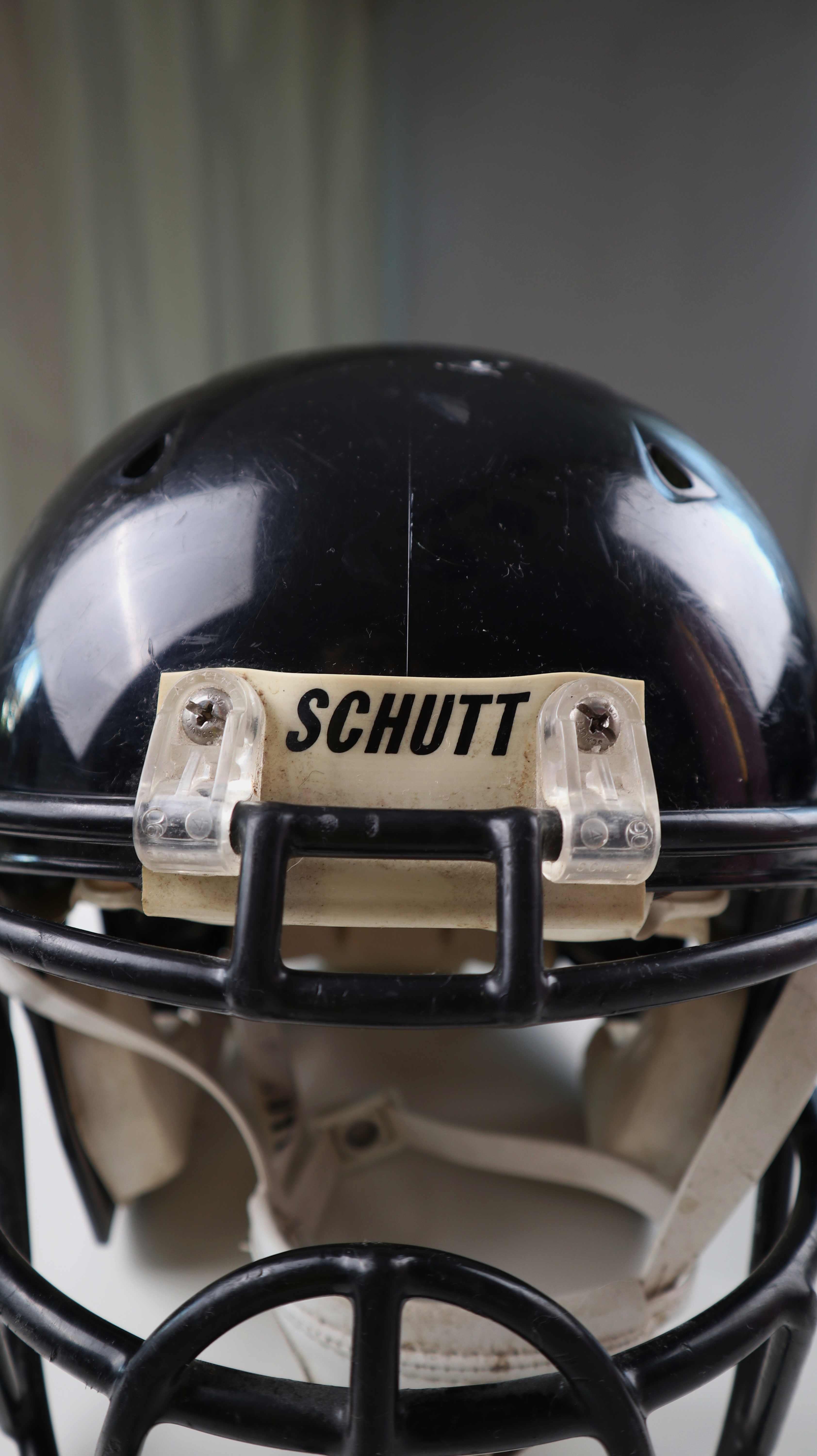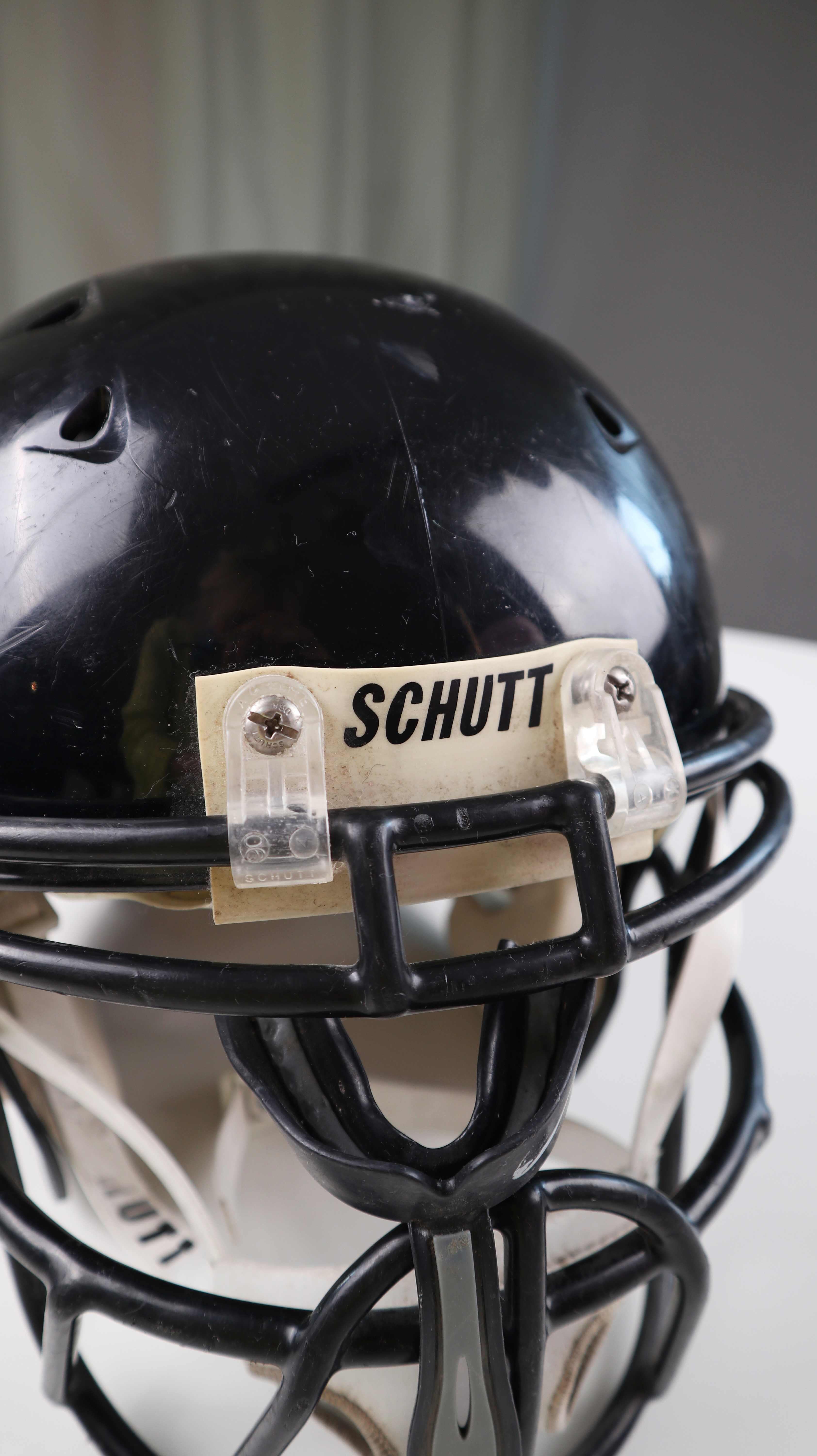 Schwarz weißer Helm von Schutt mit einem Visir. Er passt einer M. Ich hatte ihn lange ald Dekorationsobjekt stehen. Er kommt von einem Hamburger Footballverein. Plus Versand