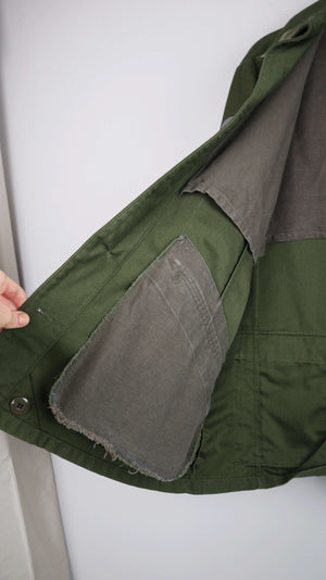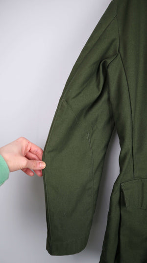 Dunkelgrüne vintage Schwedenjacke aus Militärstoff. Sie passt einer 38 M und hat viele Taschen. 52 cm Achselweite und 75 cm Länge. Plus Versand