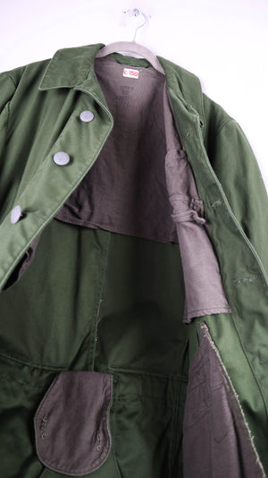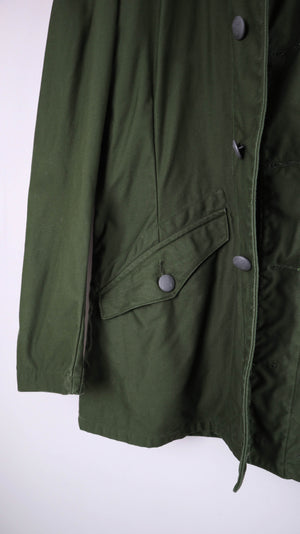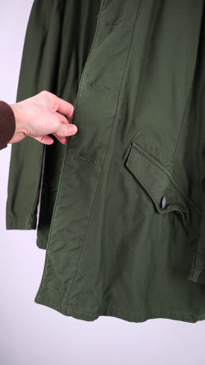 Dunkelgrüner Parka in einer 38 M. Vorne und hinten Taschen vorhanden. Neu, gefertigt aus Militärstoff von 1976. 50 cm Achselweite und 82 cm Länge. Plus Versand