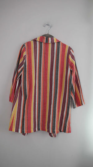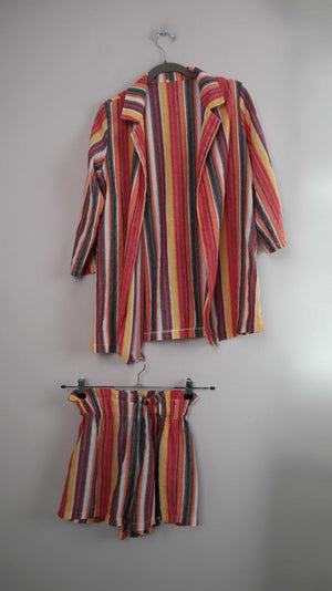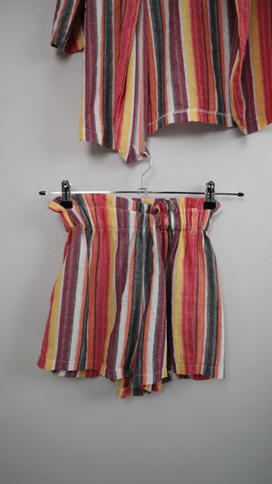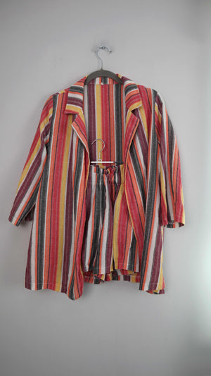 Buntes Set aus Leinen / Baumwolle ohne Marke. Es passt einer 38 M und ist eine kleine Shorts mit einem Hemd. Shorts 30 cm Bundweite, 33 cm Länge. Shirt 46 cm Achselweite und 74 cm Länge. Plus Versand