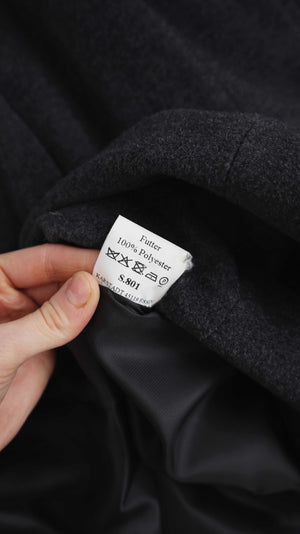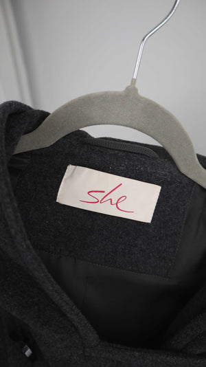 Dunkelgraue Jacke von She. Sie passt einer 40 L. 55 cm Achselweite und 95 cm Länge. Plus Versand