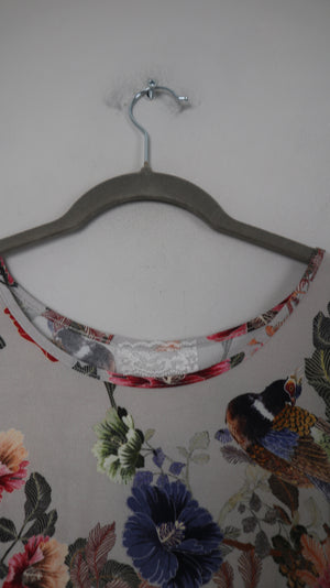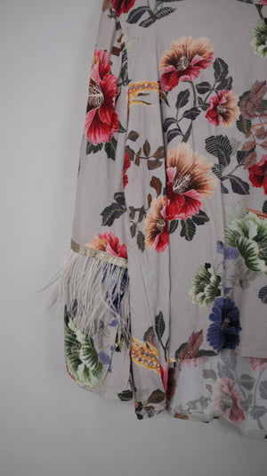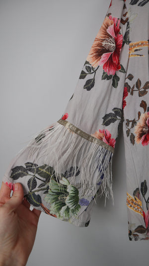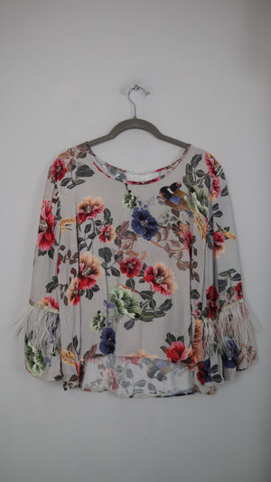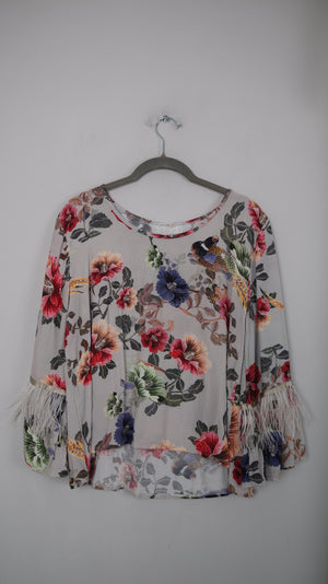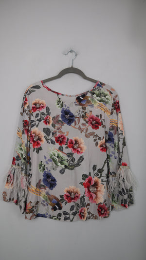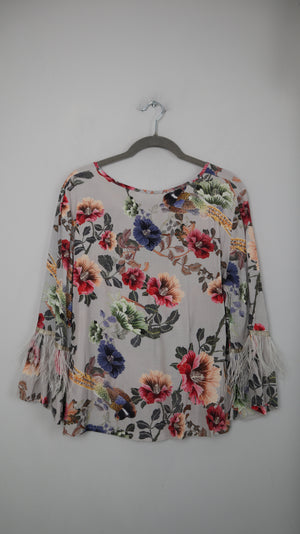 Blusenshirt ohne Marke. Es ist gemustert mit Blumen und hat an den Ärmeln kleine Federn. 51 cm Achselweite und 48 cm Länge. Plus Versand